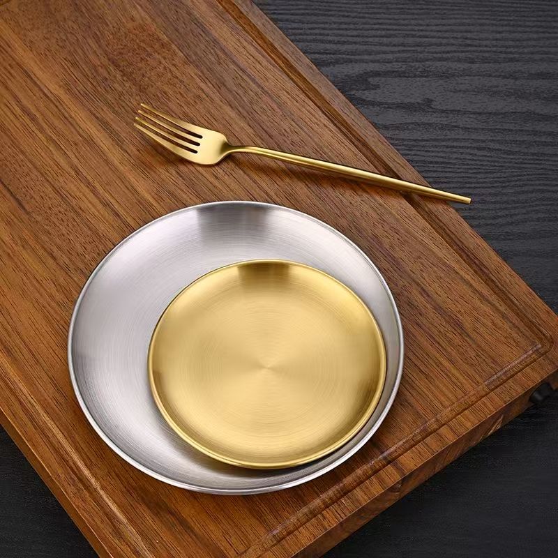도매 신장 도매 한국 스테인레스 스틸 두꺼운 원형 접시 황금 트레이 과일 접시 케이크 접시 뼈 접시 바베큐 접시