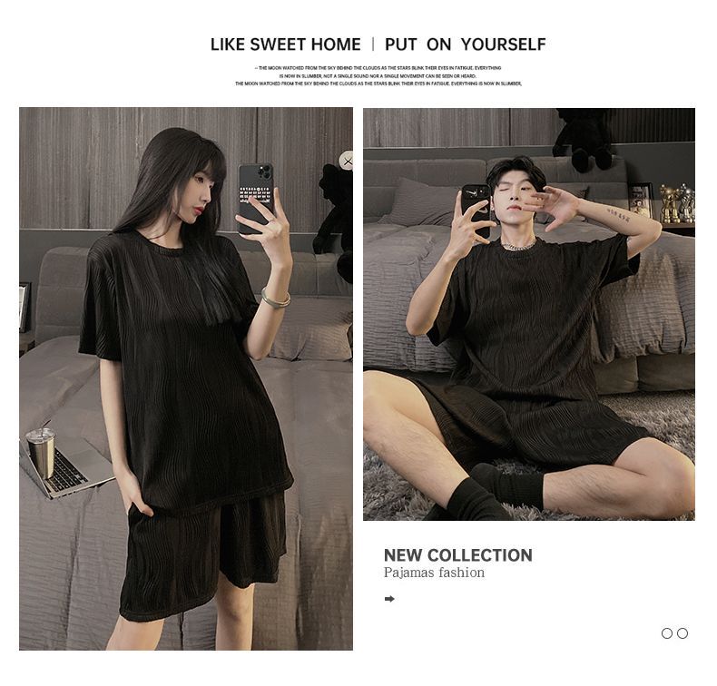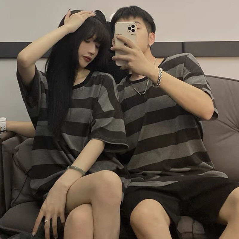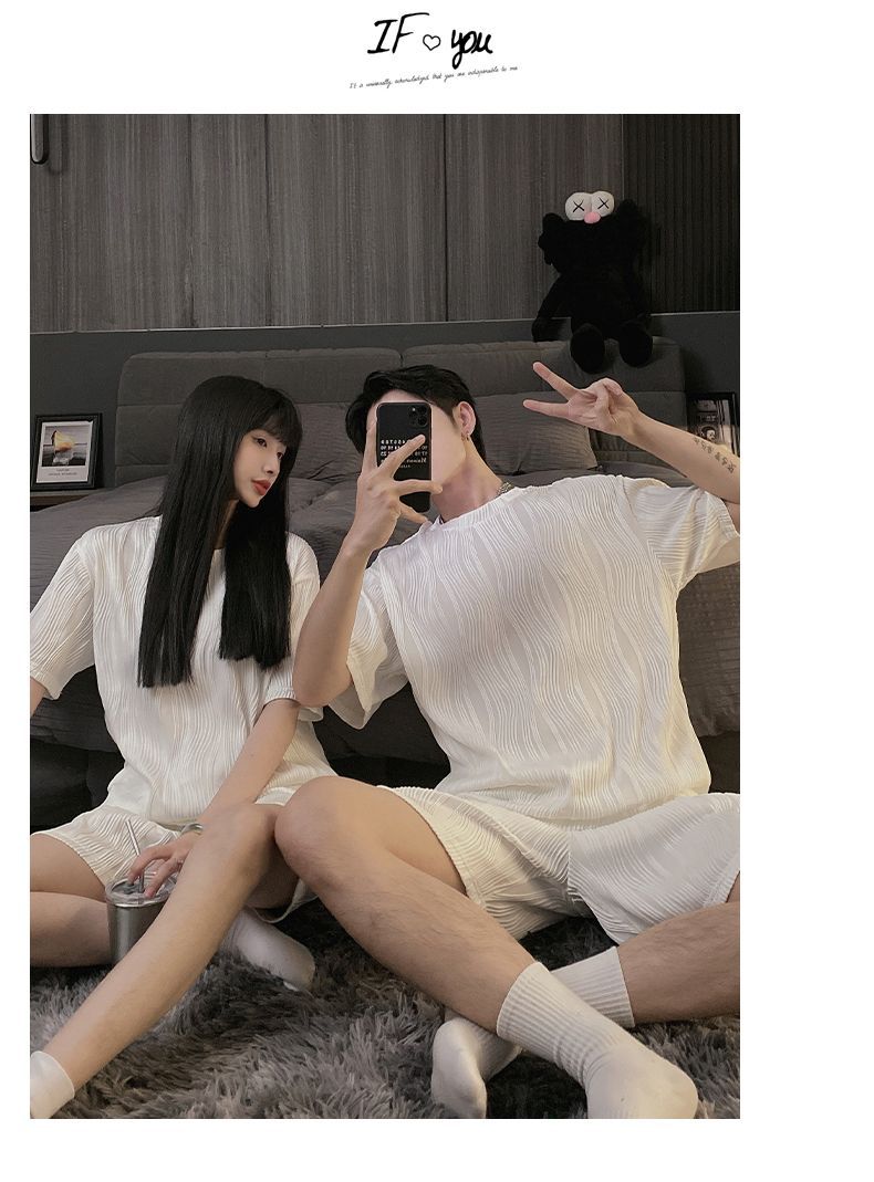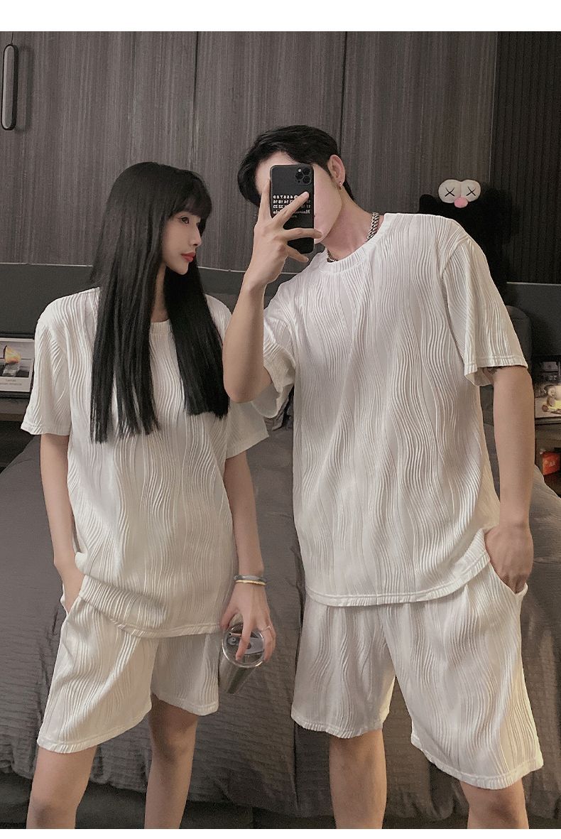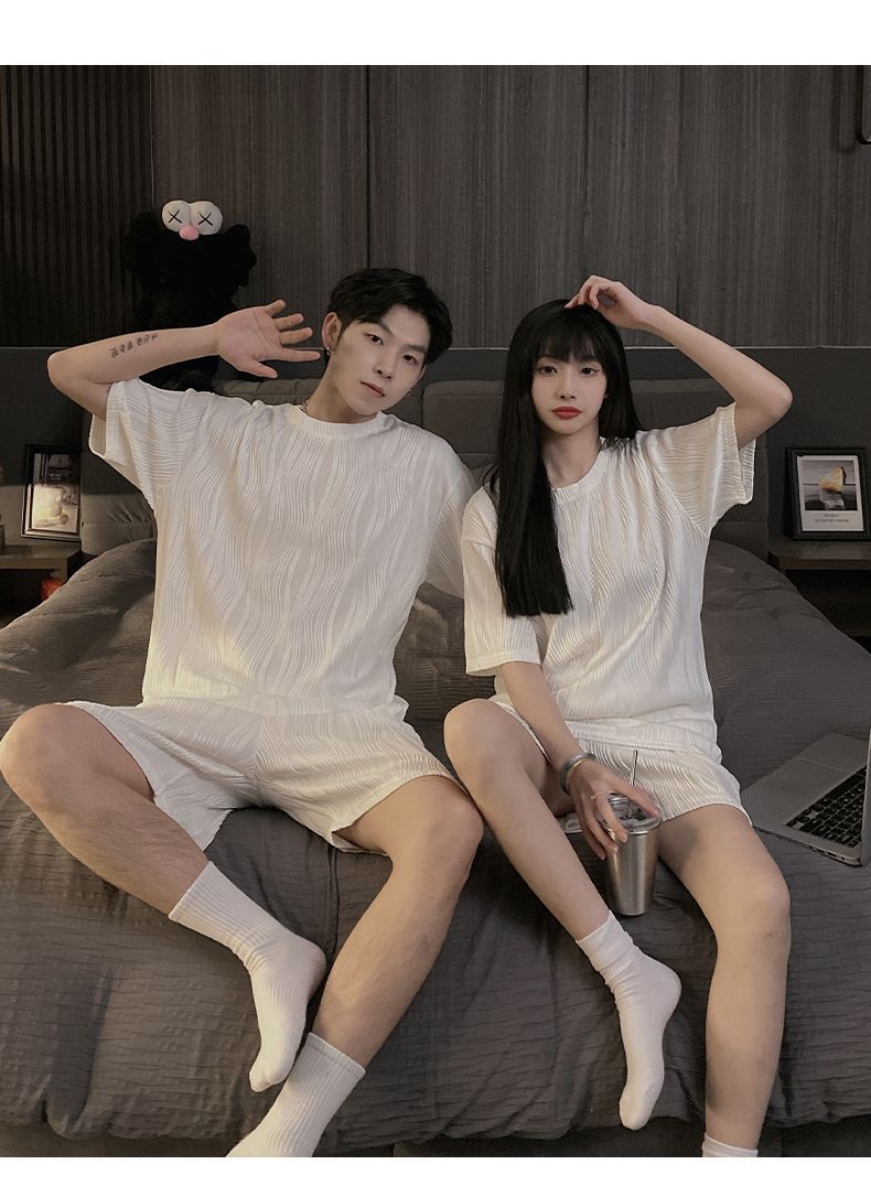 여름 반팔 반바지 파자마 커플 남녀 자카드 줄무늬 캐주얼 홈 느슨한 인터넷 연예인 라이브 홈 의류스토어 가기