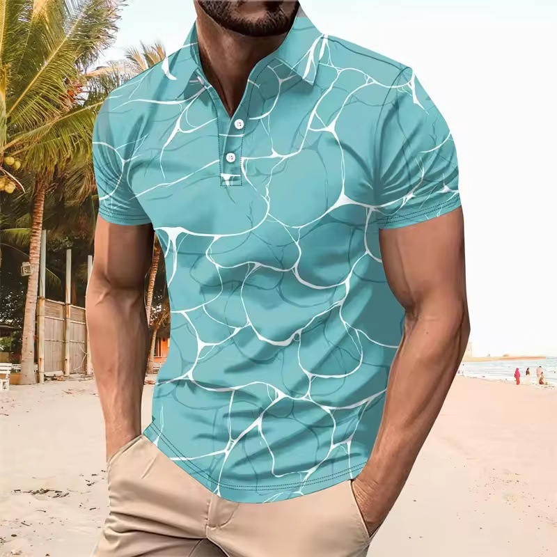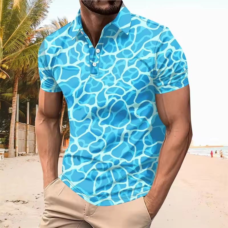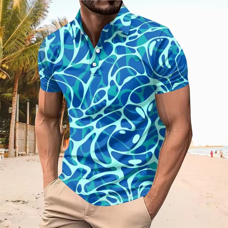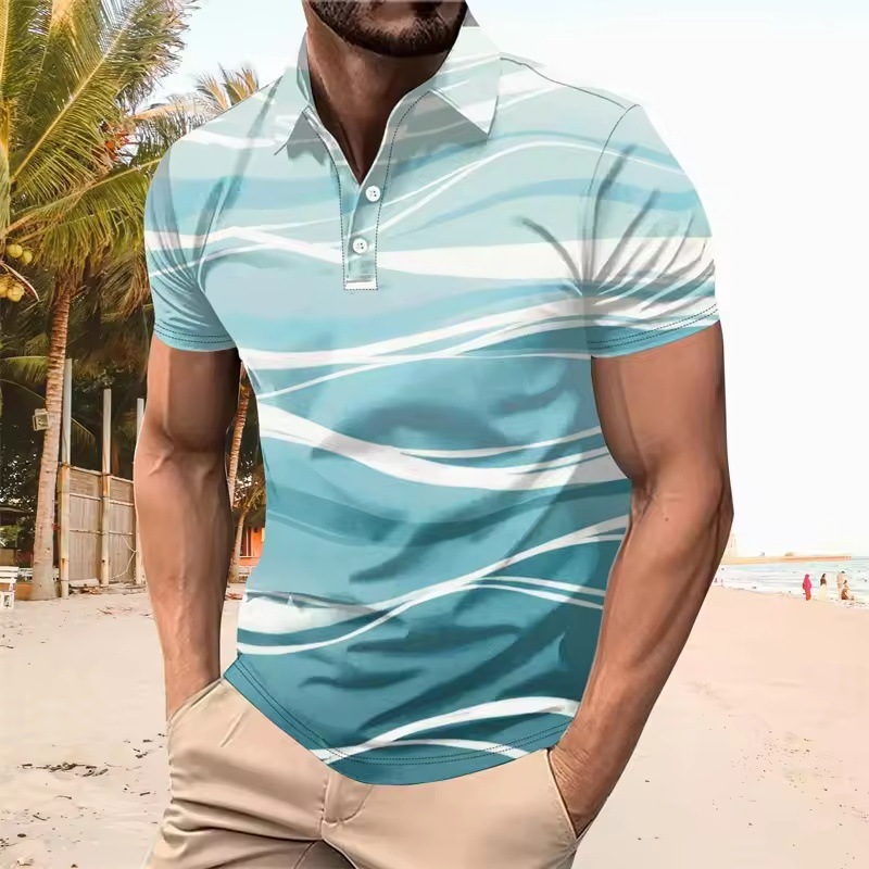 2025 남성용 3D 웨이브 블루 캐주얼 골프 셔츠 하와이 휴가 반팔 옷깃 폴로 셔츠