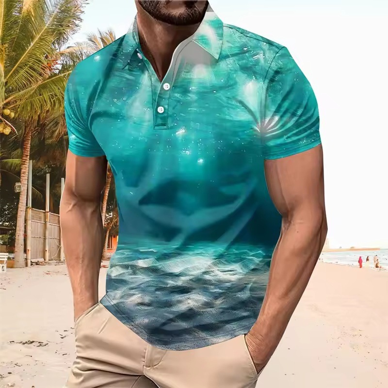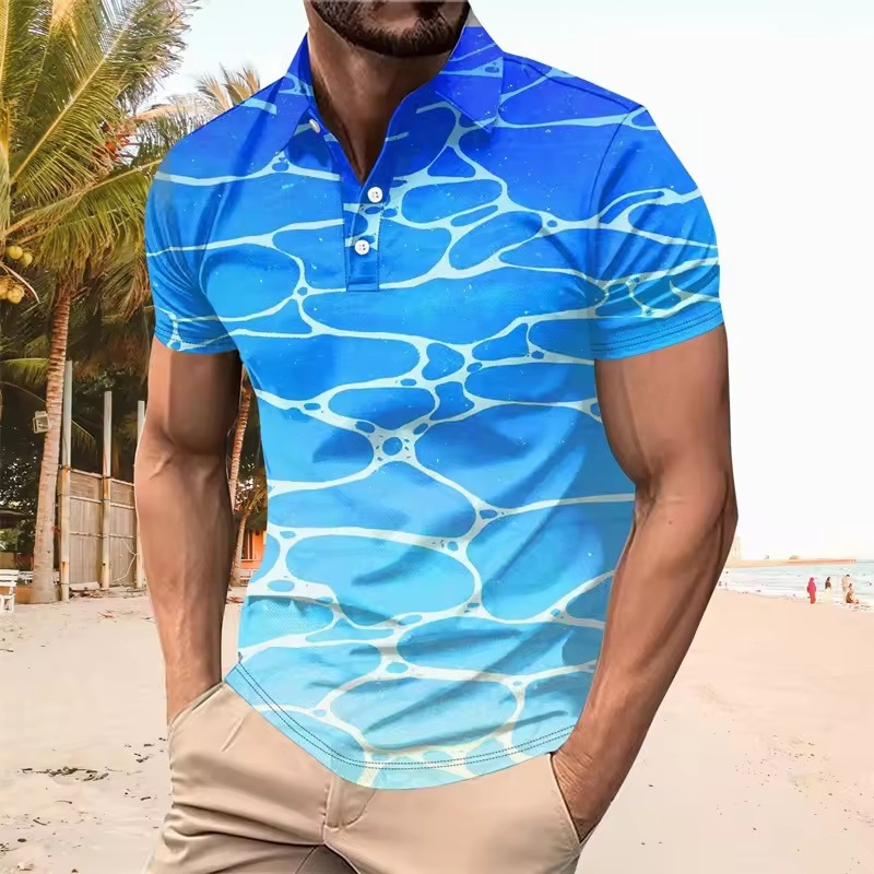 2025 남성용 3D 웨이브 블루 캐주얼 골프 셔츠 하와이 휴가 반팔 옷깃 폴로 셔츠스토어 가기