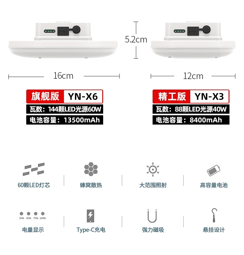 • YN-X7(156개 LED 광원, 21700 리튬 배터리 5개)