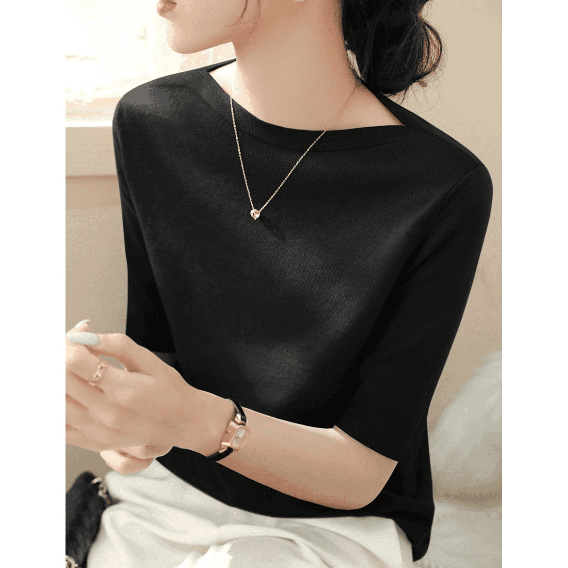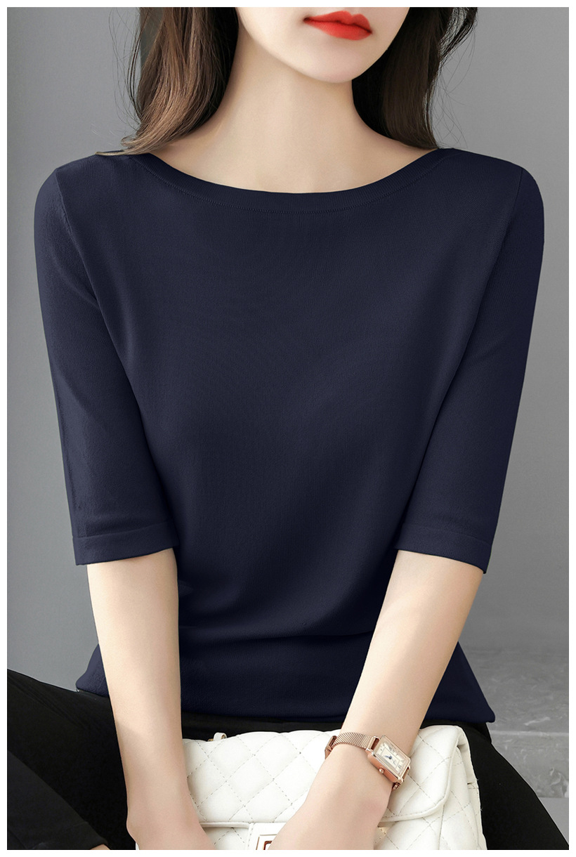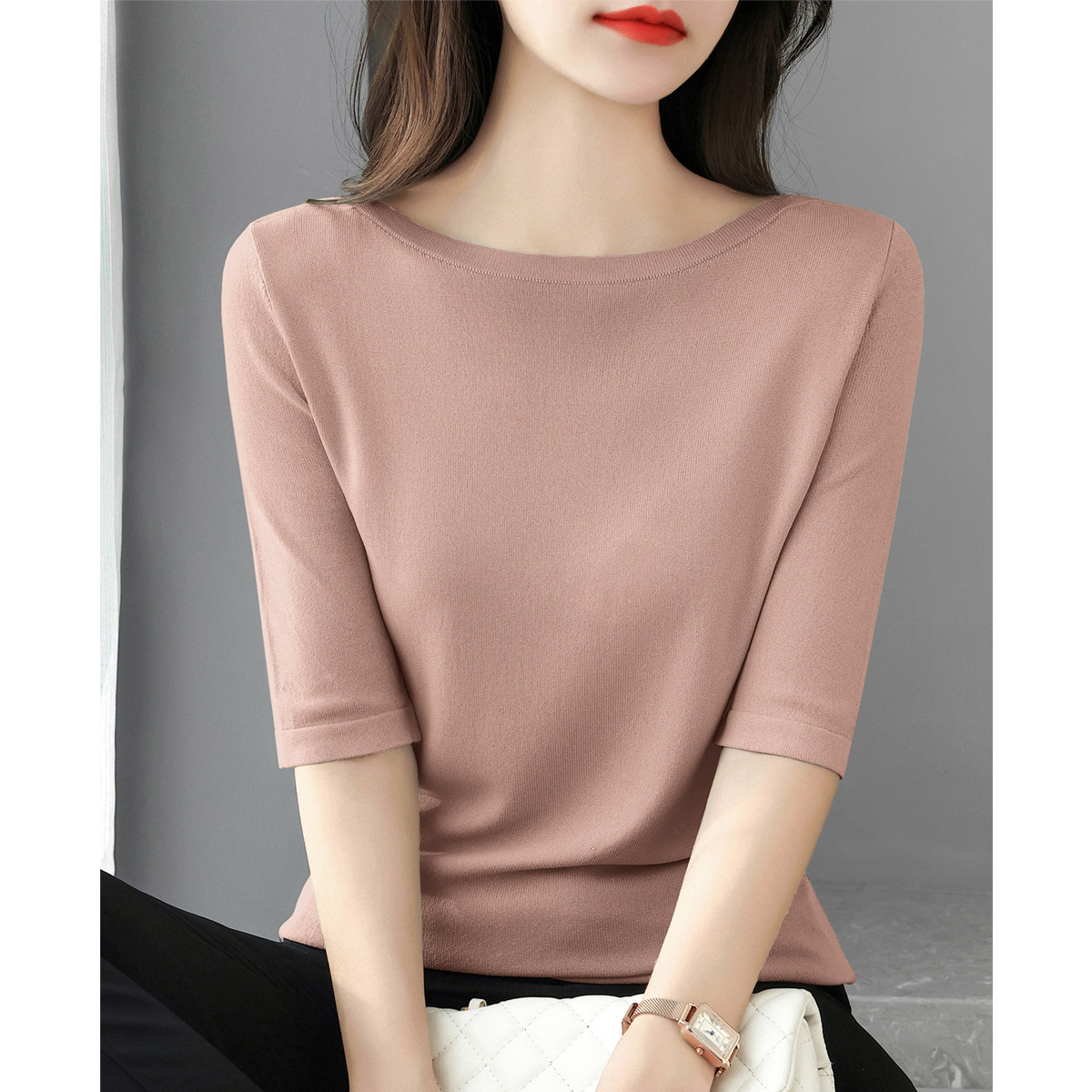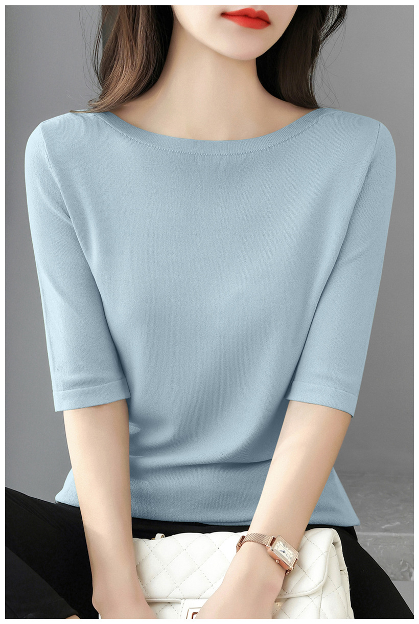 새로운 스타일의 원라인 칼라 루즈한 솔리드 컬러 소모사 스웨터 탑, 패셔너블하고 다재다능하며 우아한 중간 소매 플러스 사이즈 풀오버스토어 가기