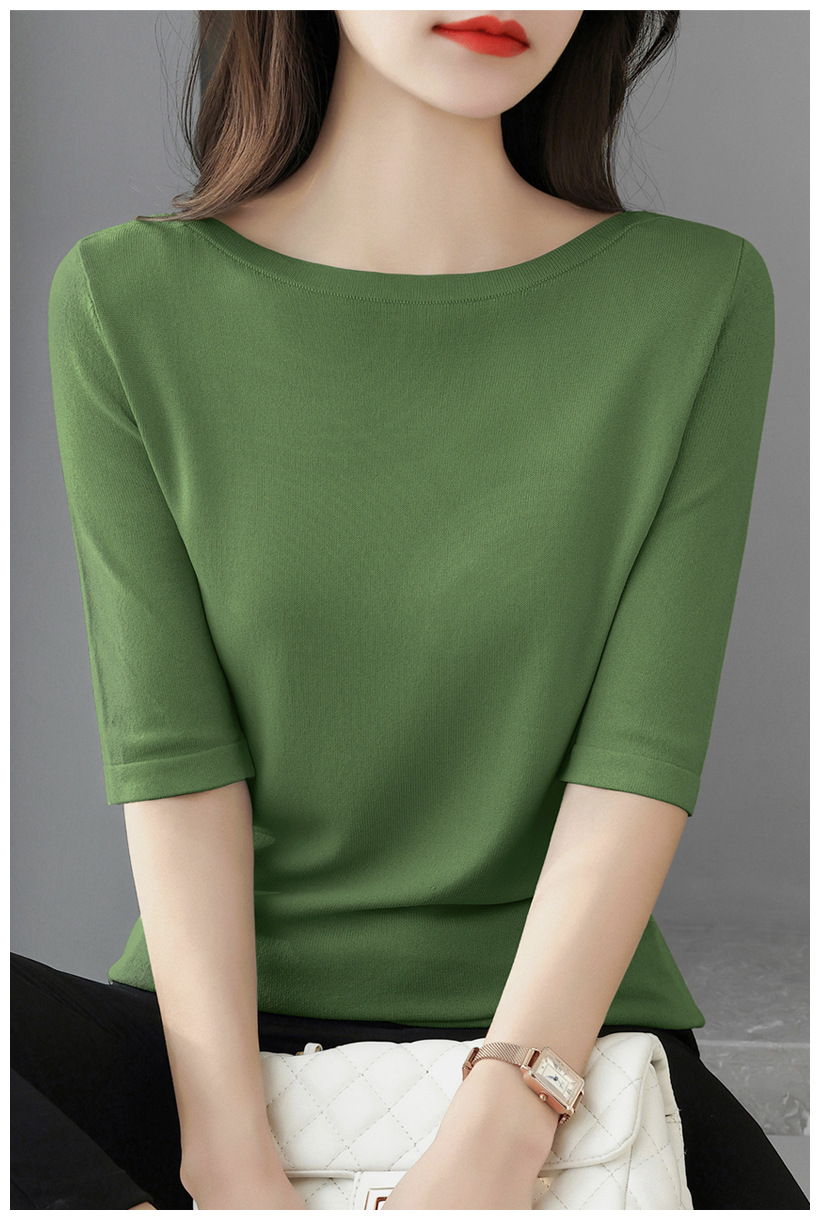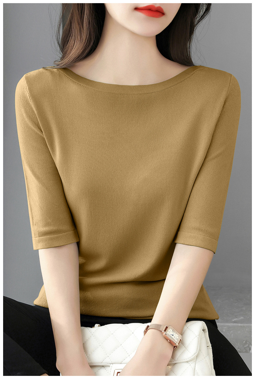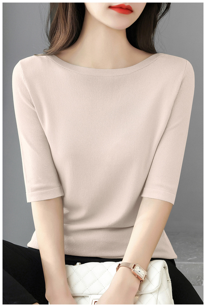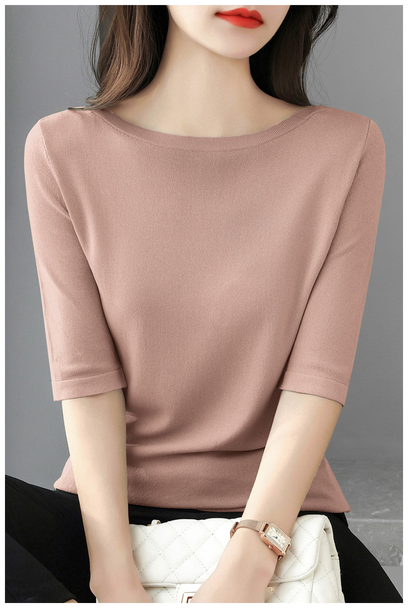 새로운 스타일의 원라인 칼라 루즈한 솔리드 컬러 소모사 스웨터 탑, 패셔너블하고 다재다능하며 우아한 중간 소매 플러스 사이즈 풀오버