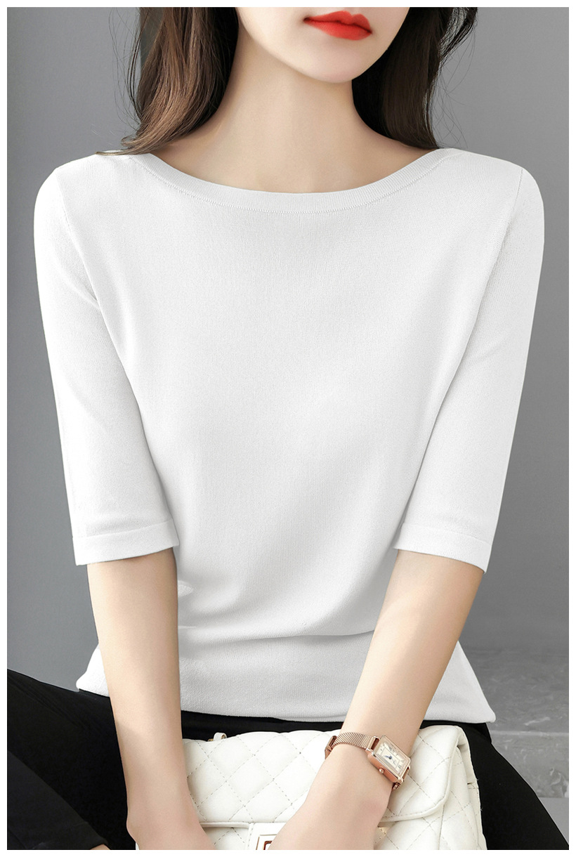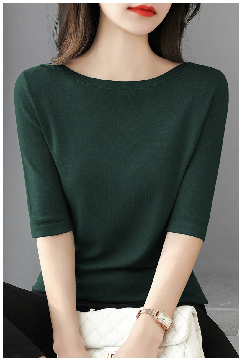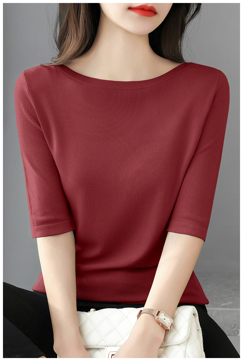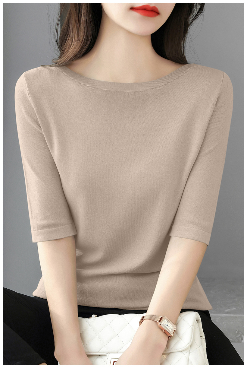 새로운 스타일의 원라인 칼라 루즈한 솔리드 컬러 소모사 스웨터 탑, 패셔너블하고 다재다능하며 우아한 중간 소매 플러스 사이즈 풀오버