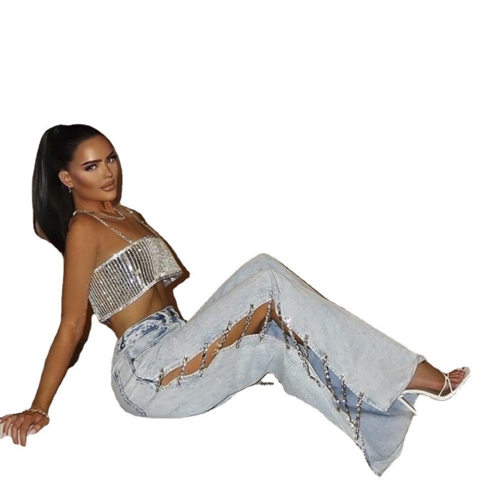 하이웨이스트 속이 빈 와이드 레그 진 여성용 하이웨이스트 속이 빈 와이드 레그 진