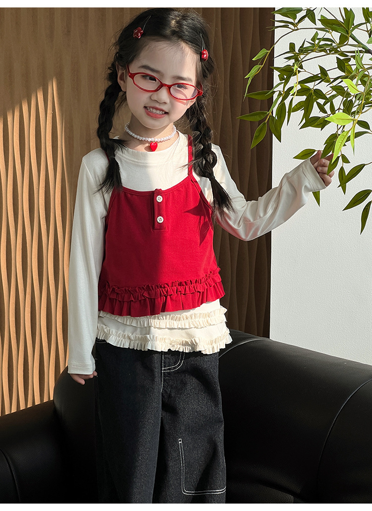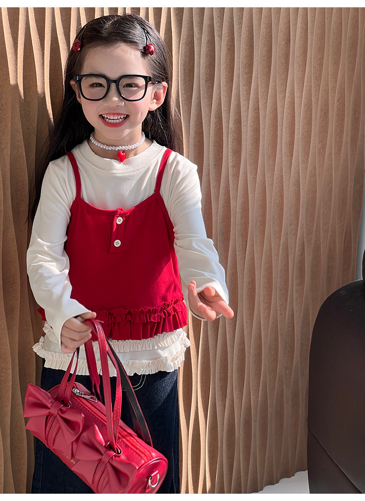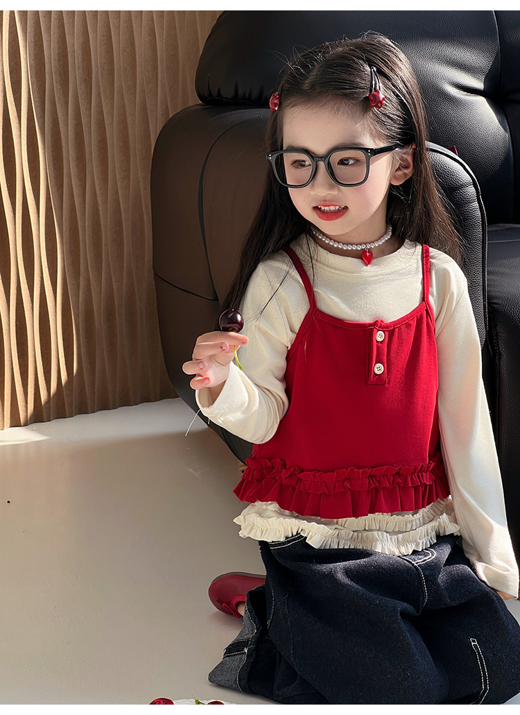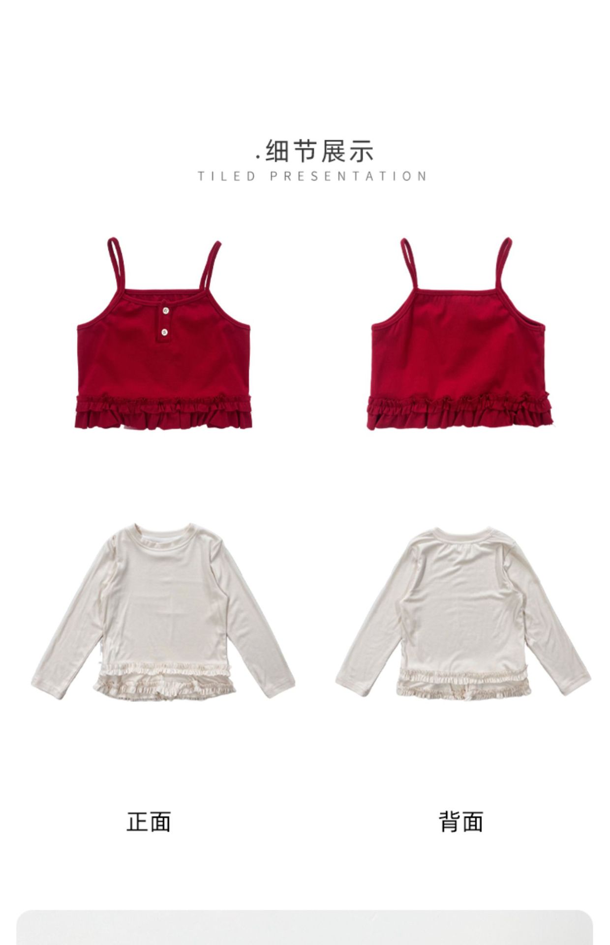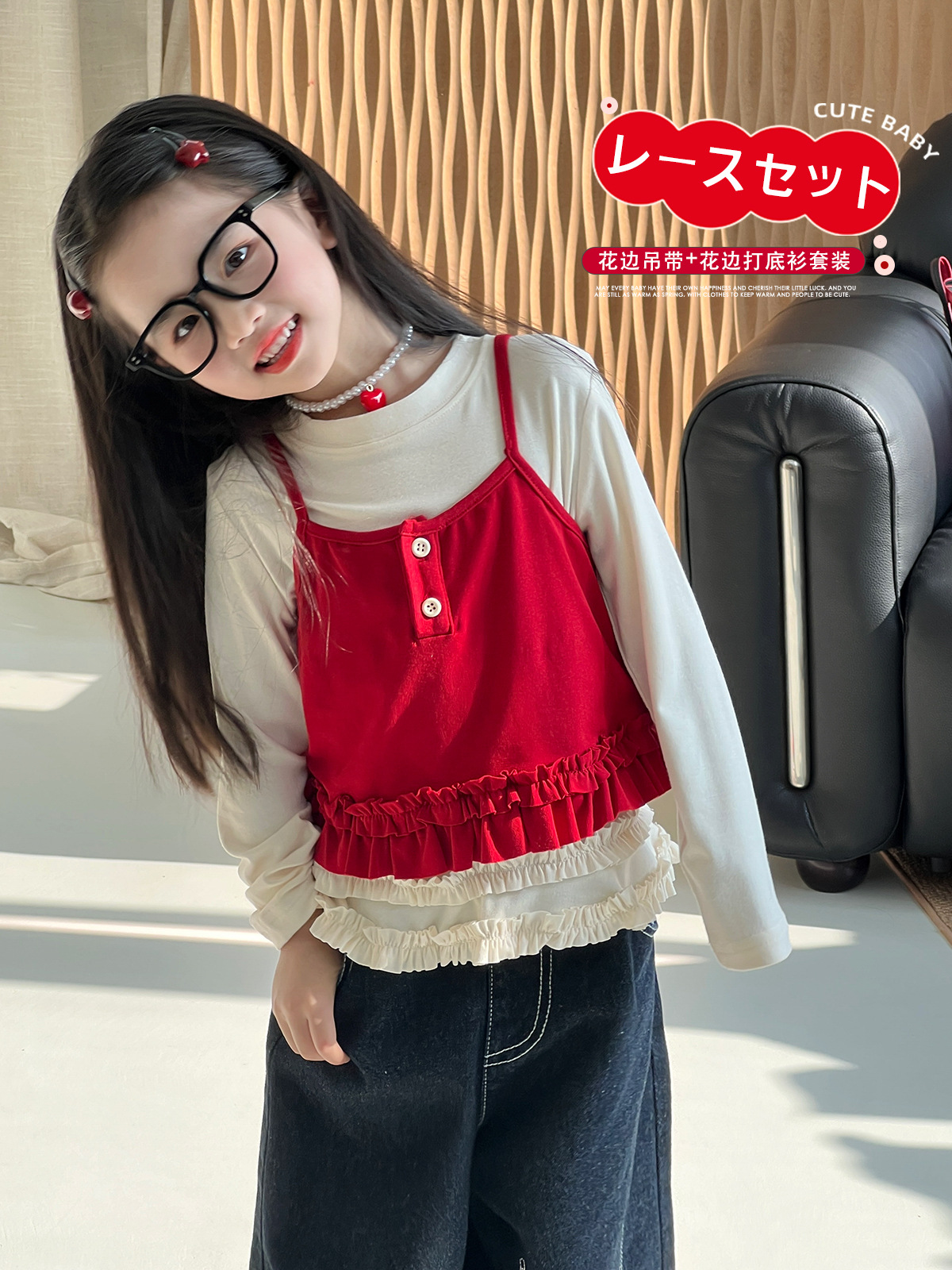 여자 정장 2025 봄 신작 어린이 레이스 조끼 바닥 셔츠 조끼 긴팔 탑 티셔츠 투피스 세트스토어 가기