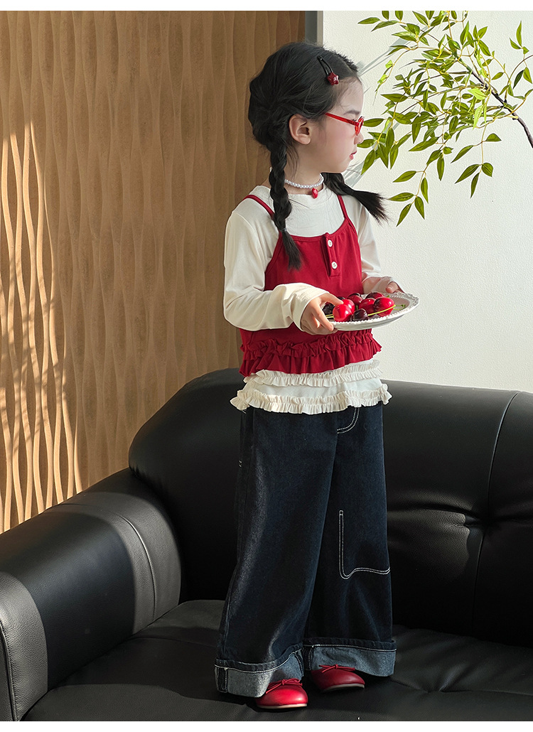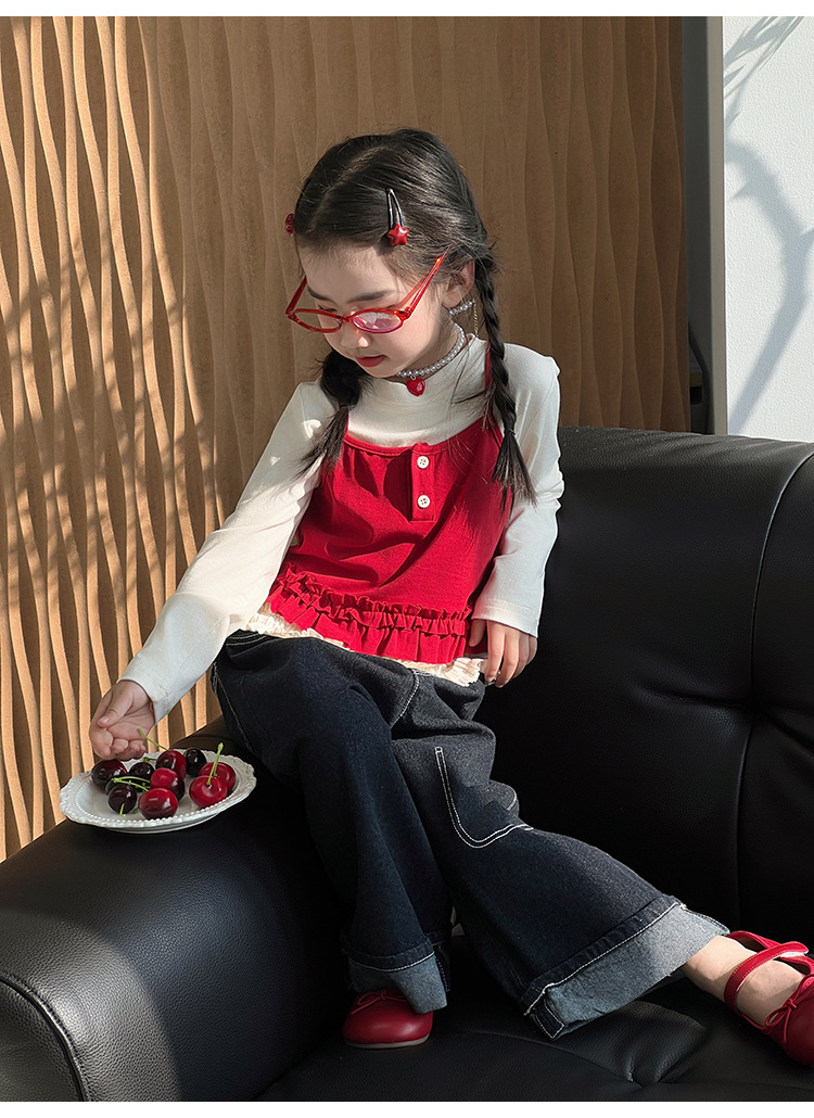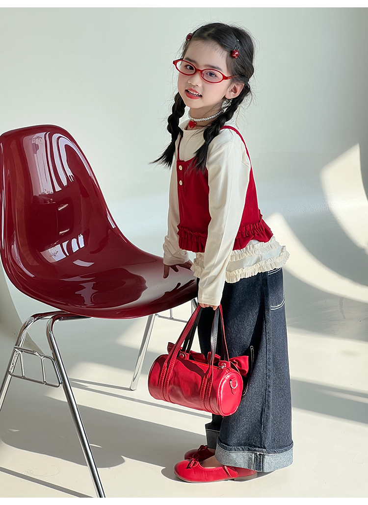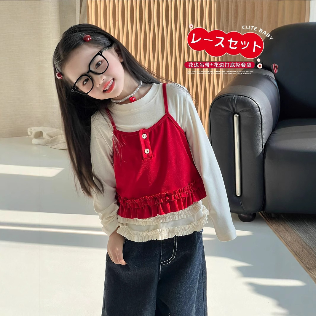 여자 정장 2025 봄 신작 어린이 레이스 조끼 바닥 셔츠 조끼 긴팔 탑 티셔츠 투피스 세트