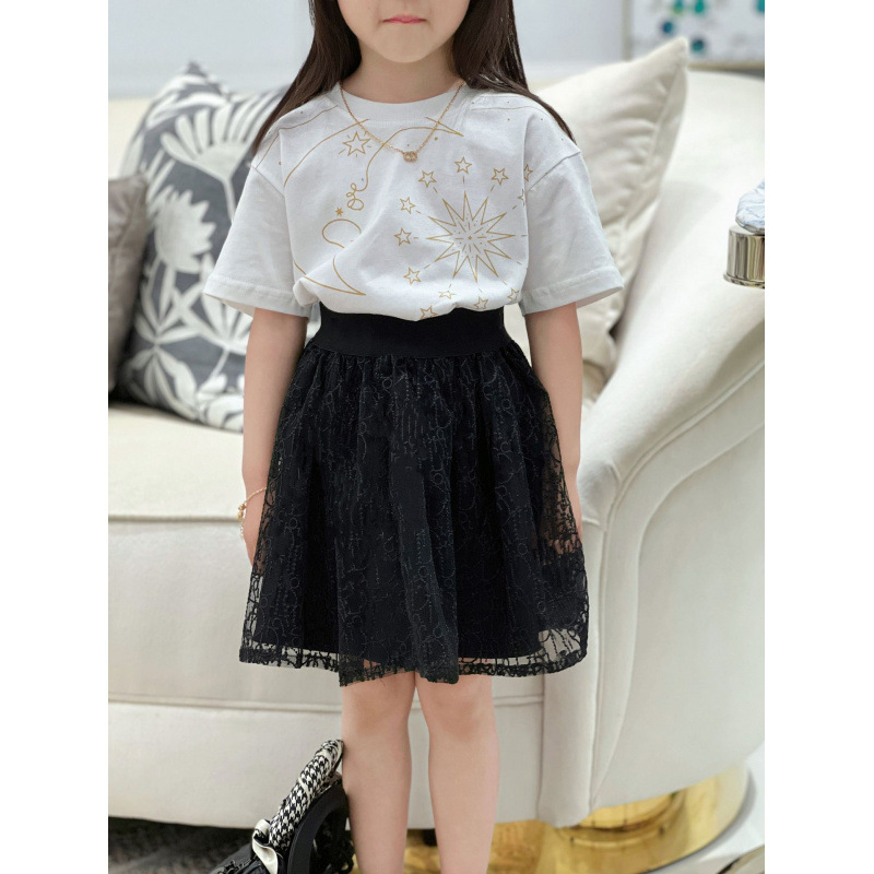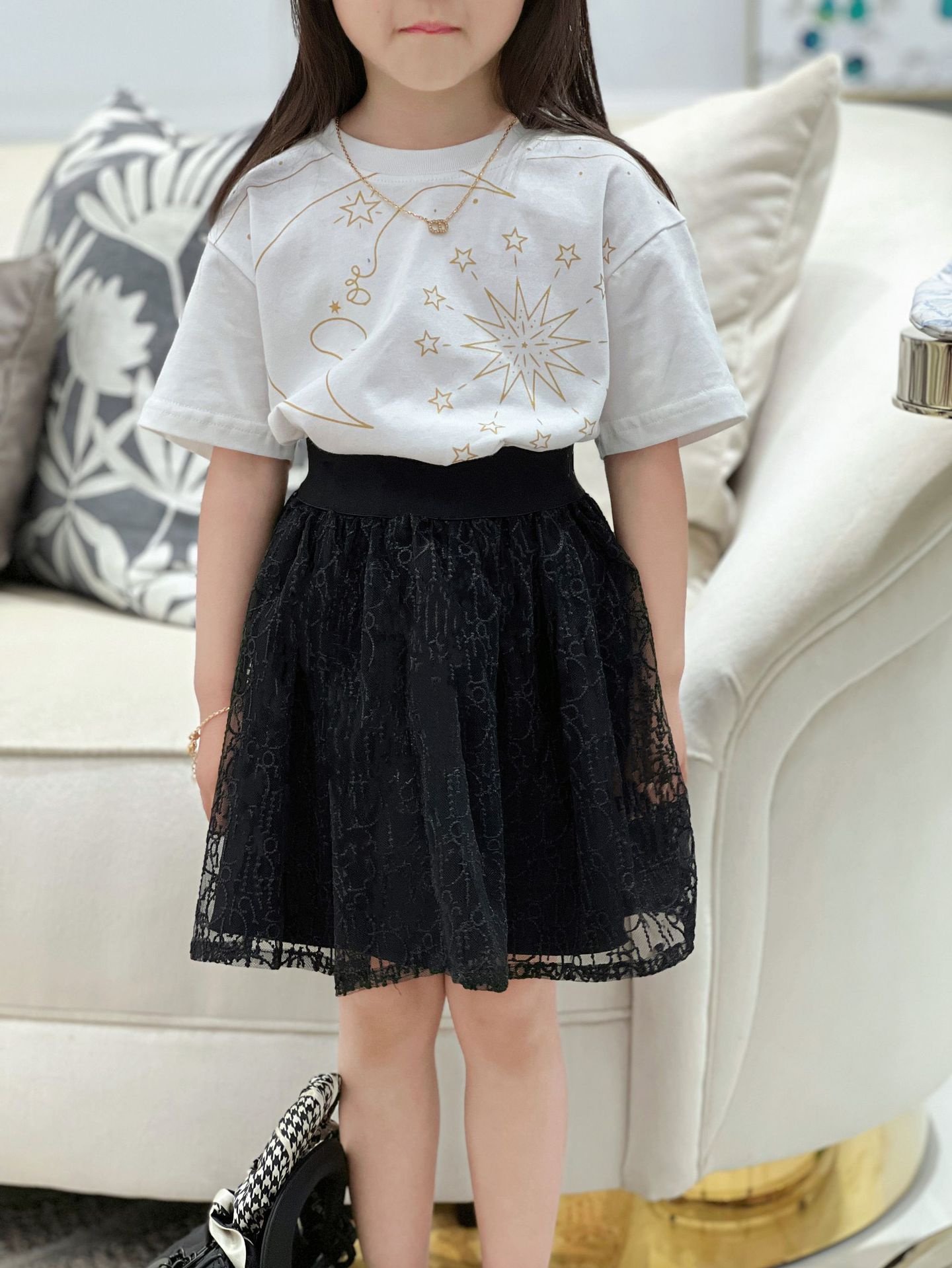 고급 아동복, 여아 전면 자수 아동 스커트, 거즈 스커트, 별과 달 반팔 티셔츠