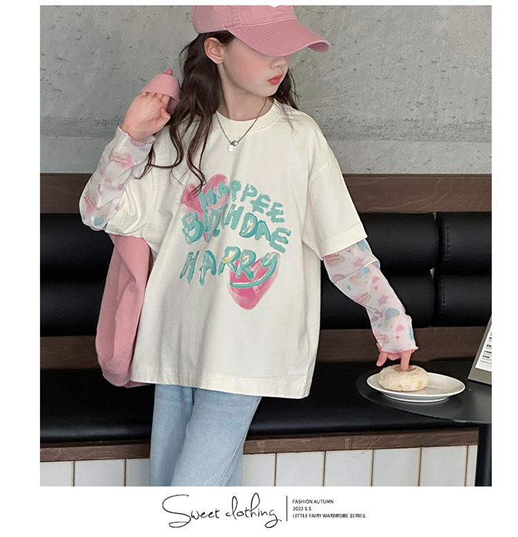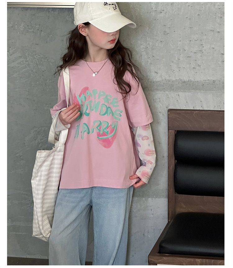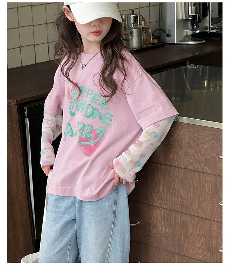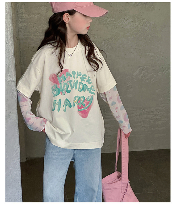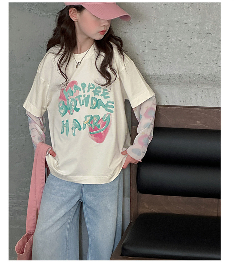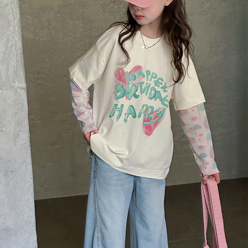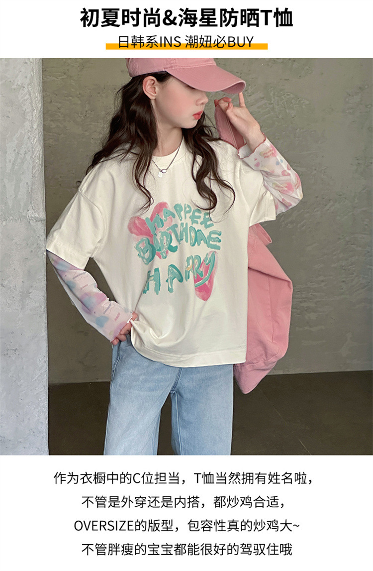 소녀 가짜 투피스 선스크린 슬리브 티셔츠 여름 2025 새로운 소녀 유행 느슨한 편지 안티 모기 탑스토어 가기