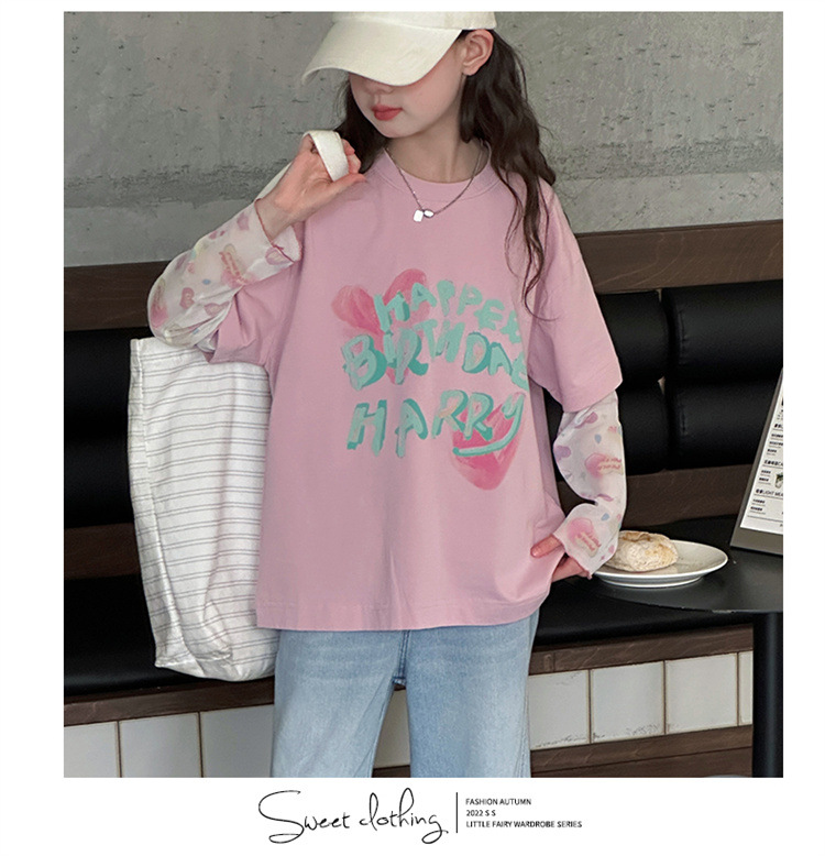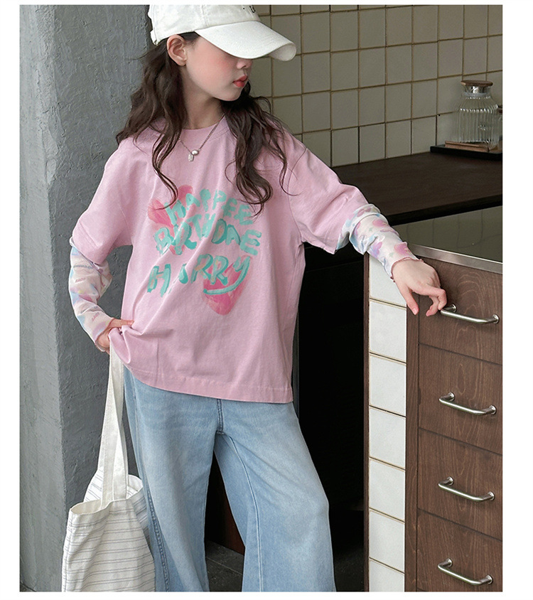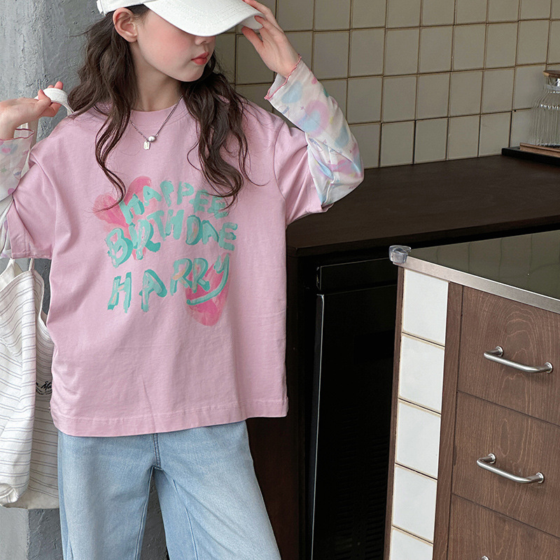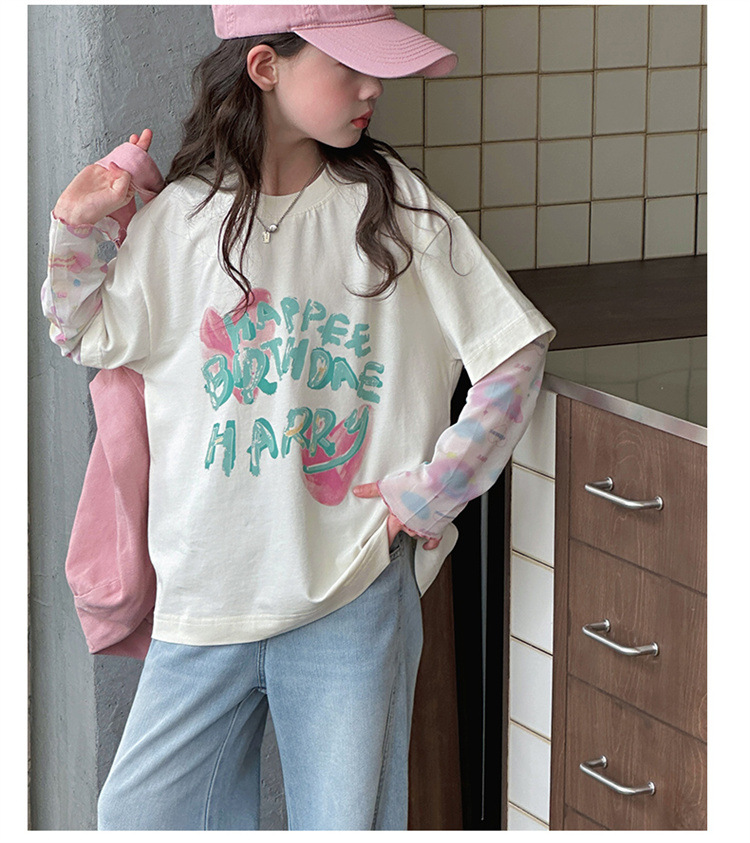 소녀 가짜 투피스 선스크린 슬리브 티셔츠 여름 2025 새로운 소녀 유행 느슨한 편지 안티 모기 탑