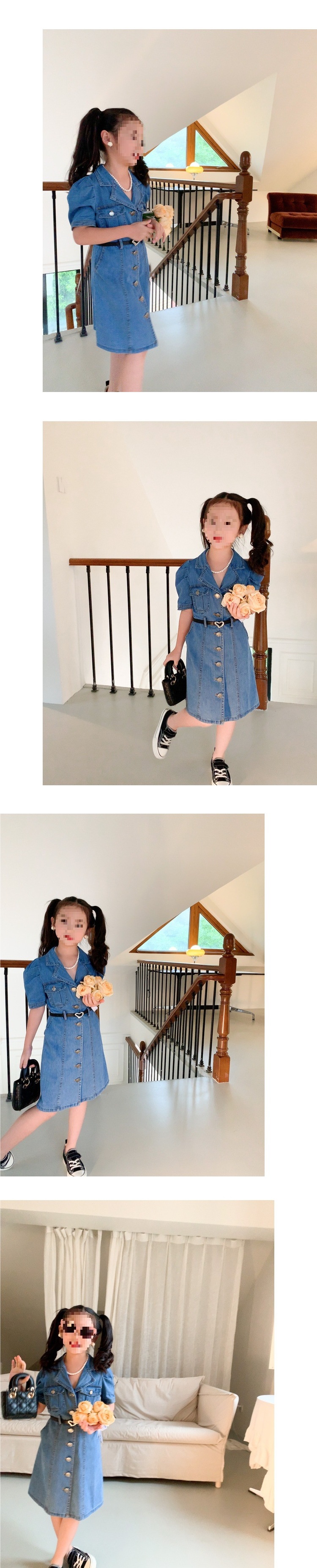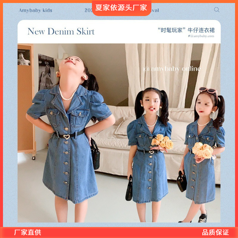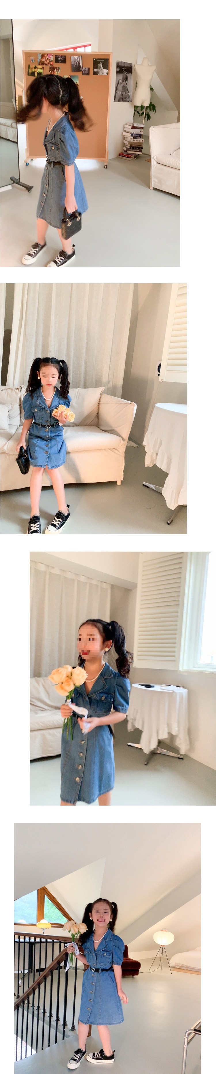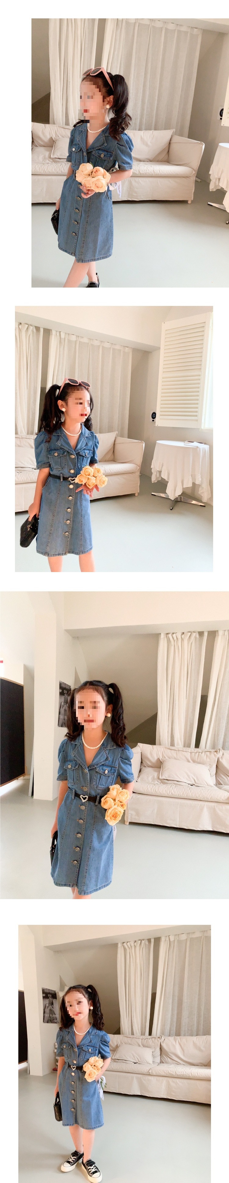 2024 여름 소녀 패션 데님 원피스 얇은 버블 슬리브 기질 레트로 올 매치 버튼 스커트 트렌드스토어 가기