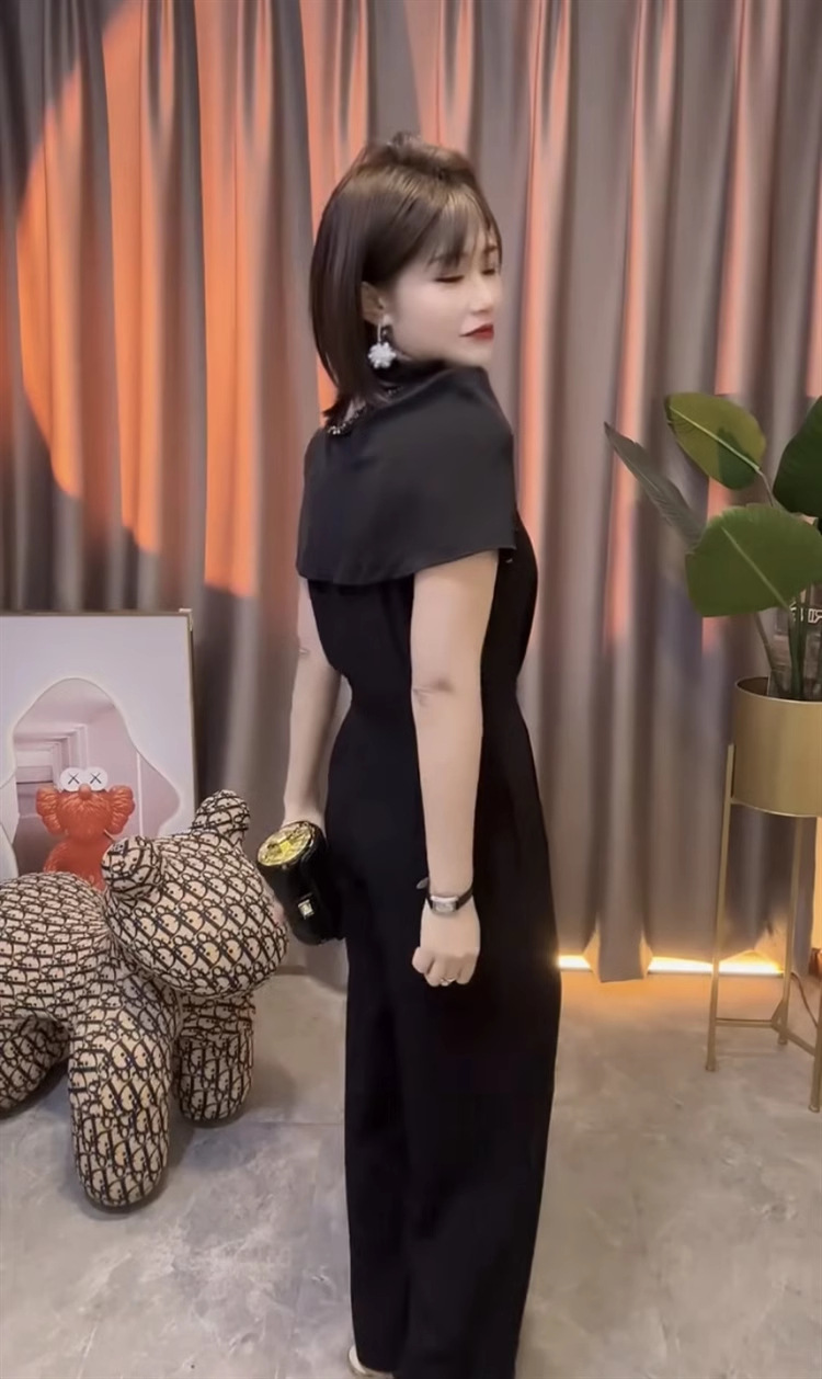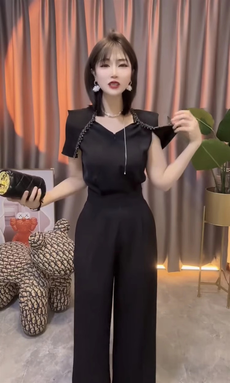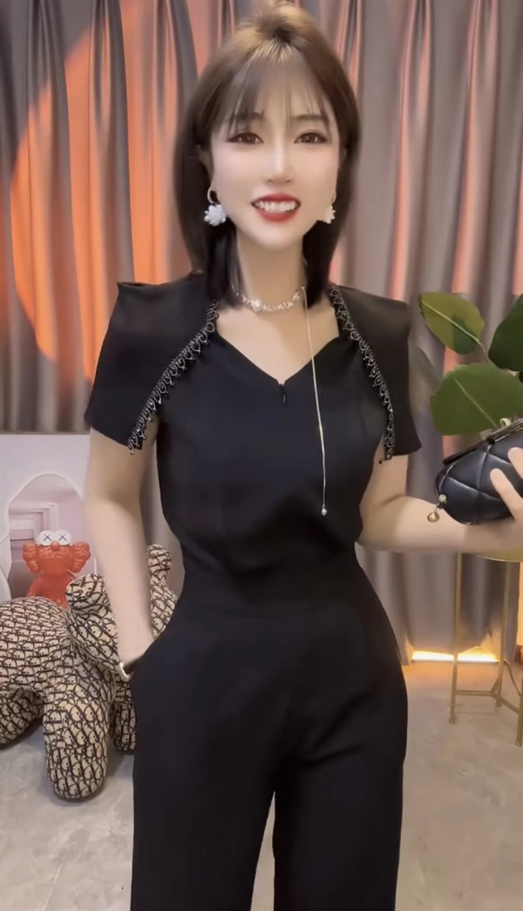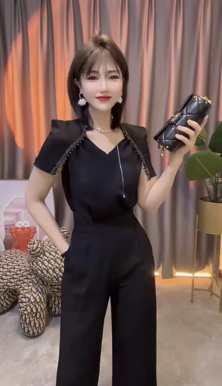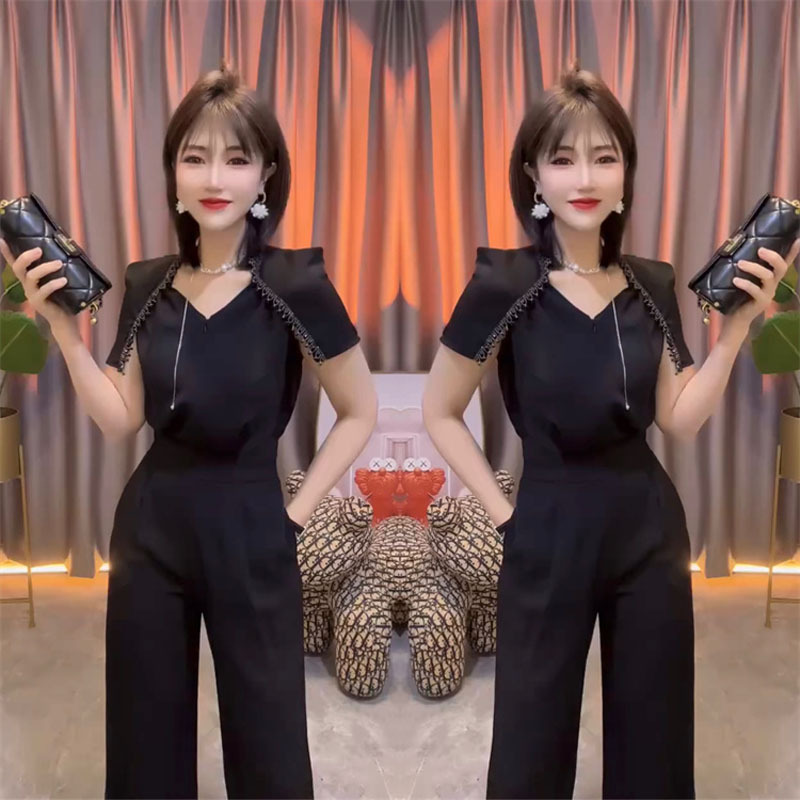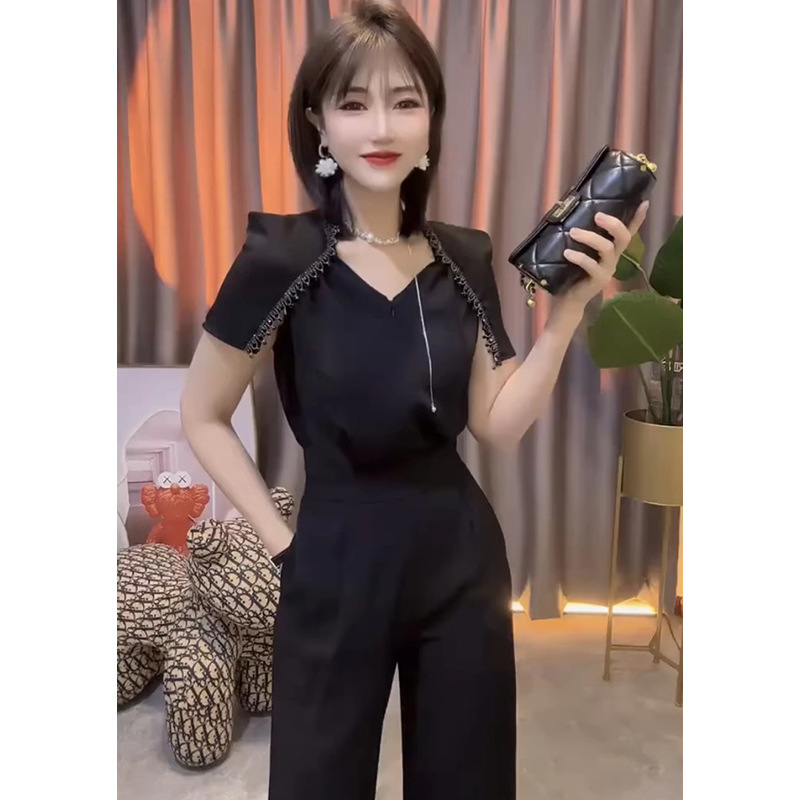 중공업 통근 여성 점프 수트 2025 여름 새 구슬 V-넥 짧은 소매 스티칭 높은 허리 넓은 다리 바지스토어 가기