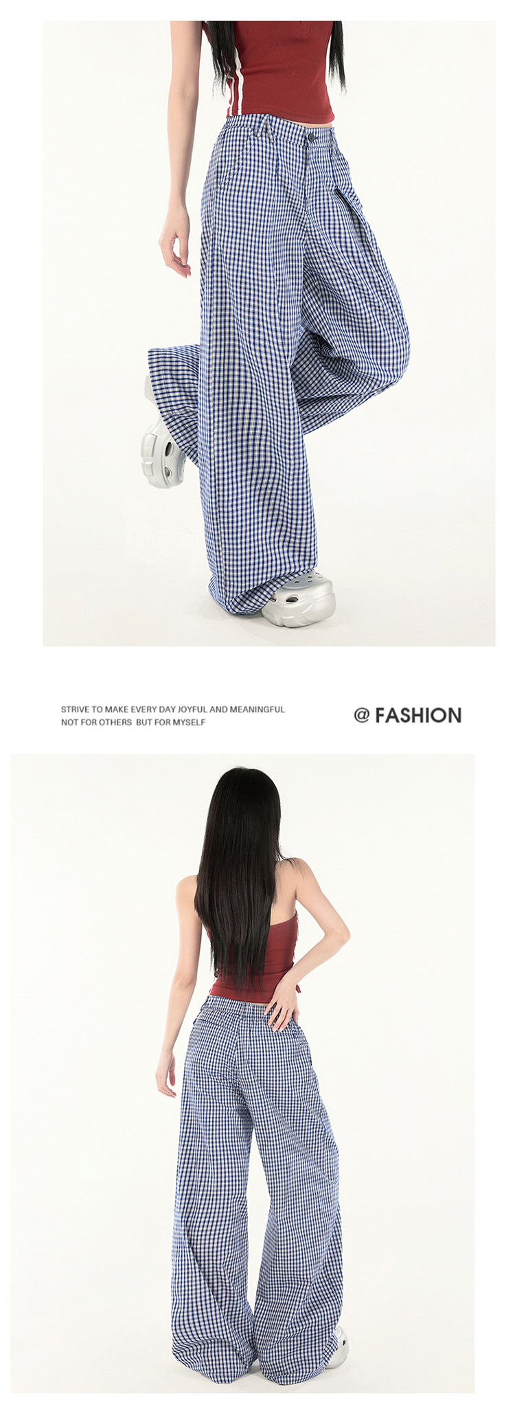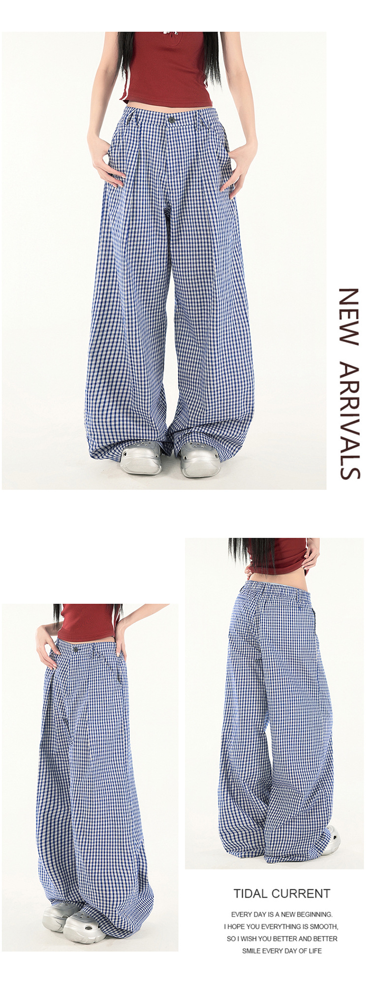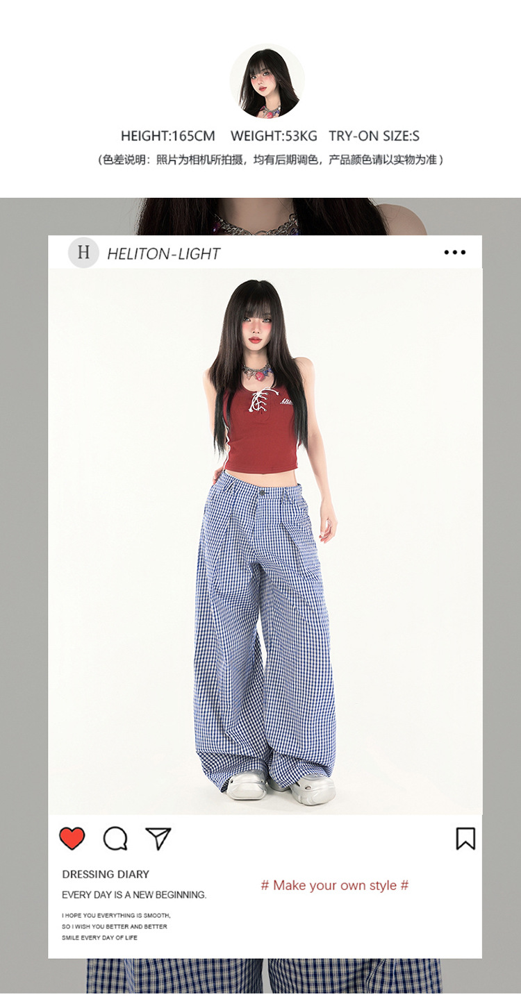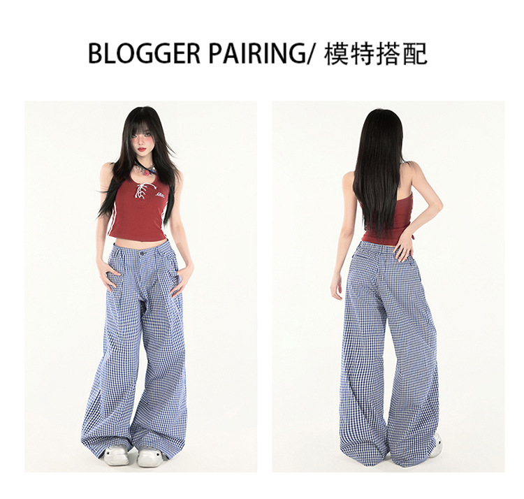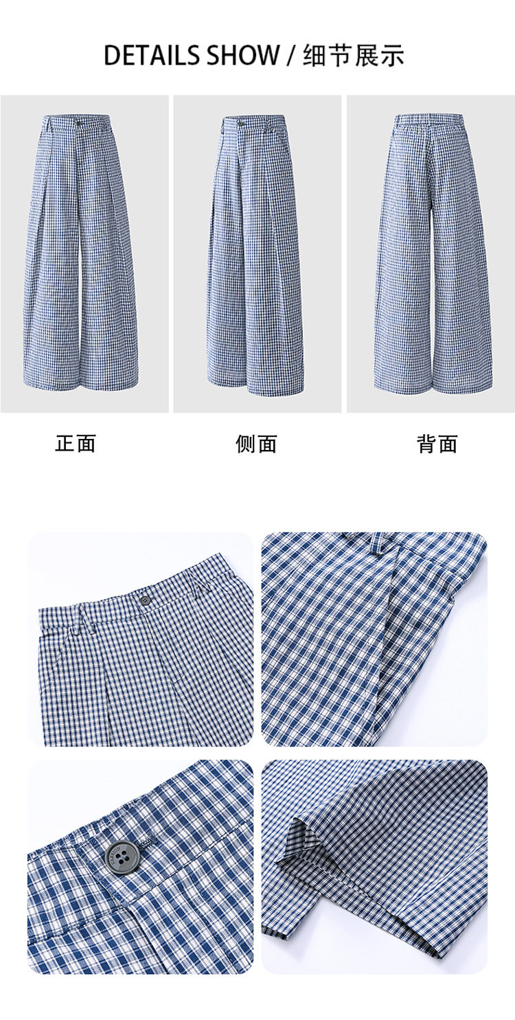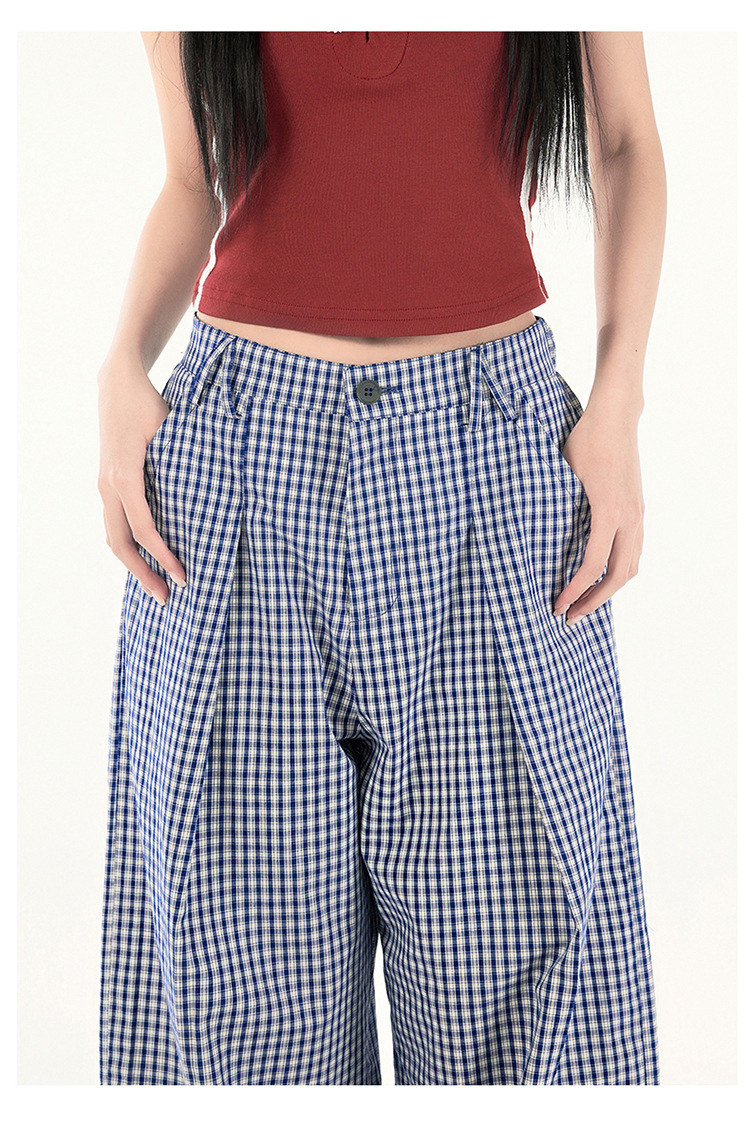 2025 미국 복고풍 디자인 센스 체크 더블 플리트 와이드 레그 바지 캐주얼 바지 여성용 봄 새로운 느슨한 바지스토어 가기