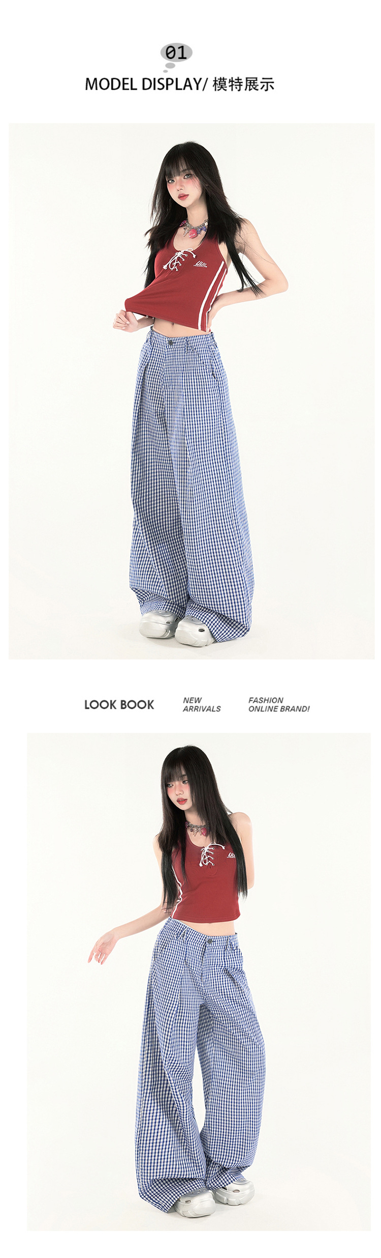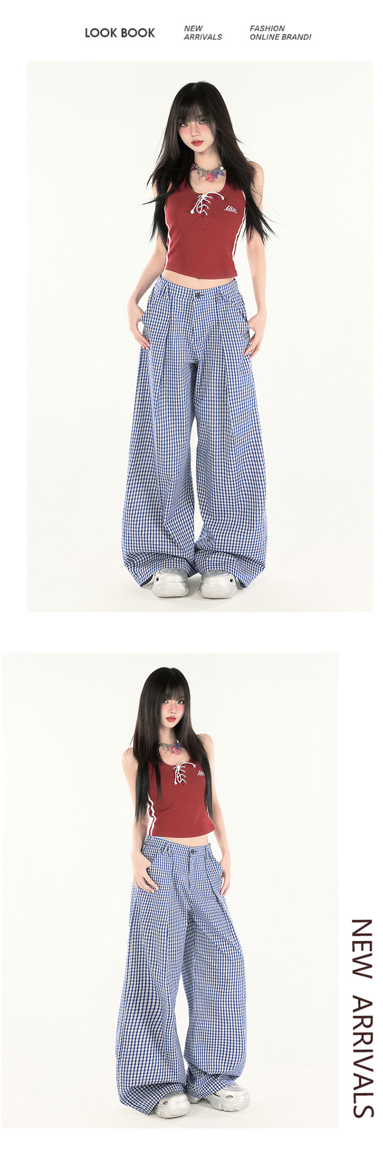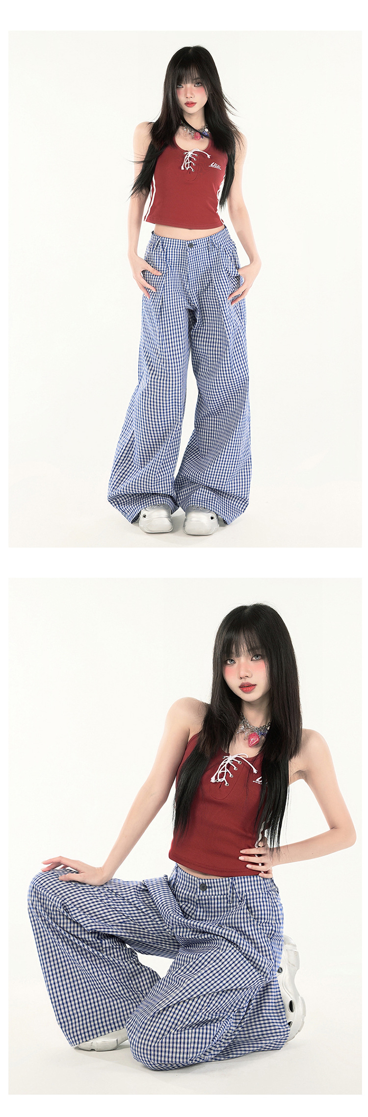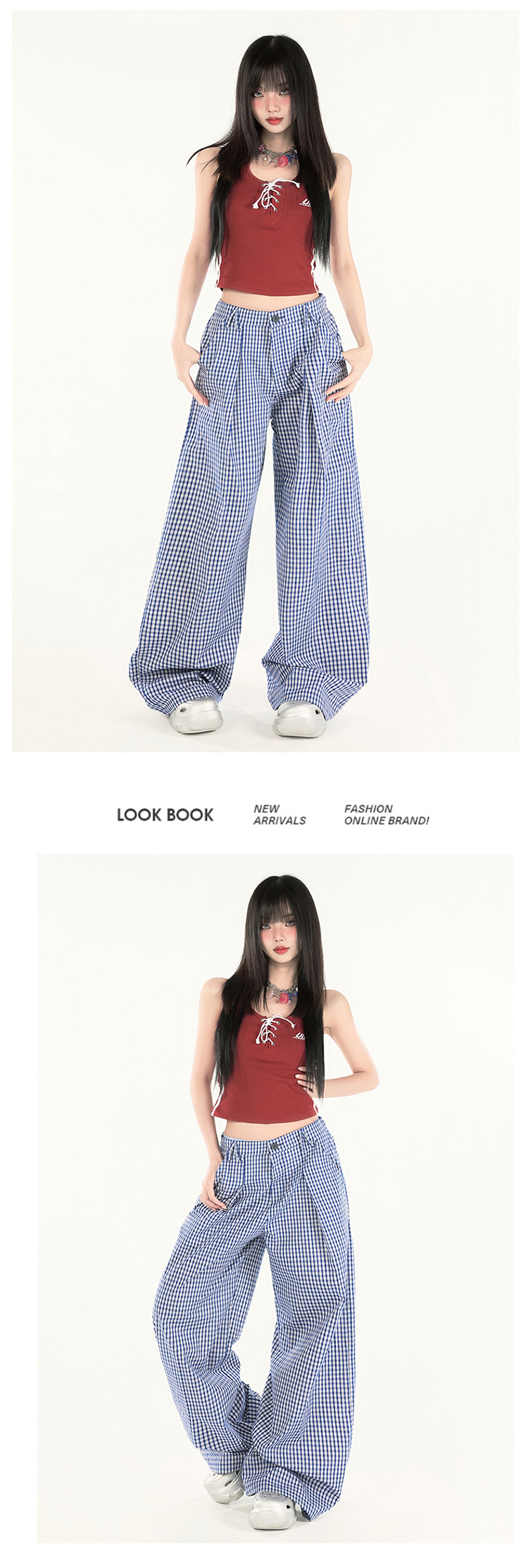 2025 미국 복고풍 디자인 센스 체크 더블 플리트 와이드 레그 바지 캐주얼 바지 여성용 봄 새로운 느슨한 바지스토어 가기