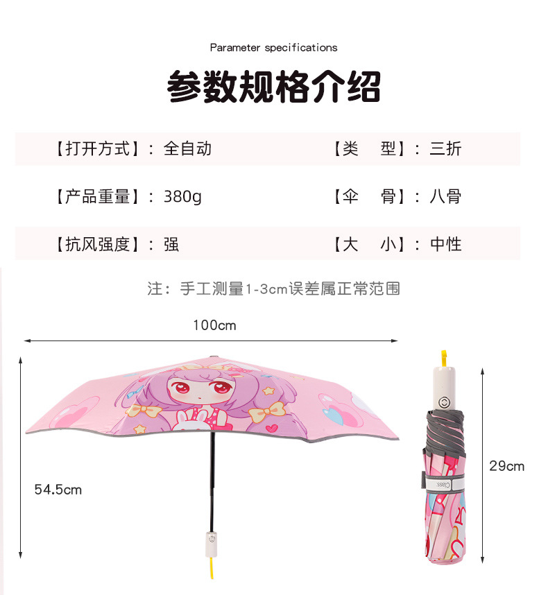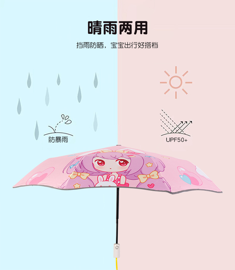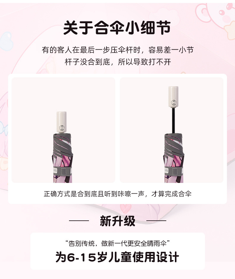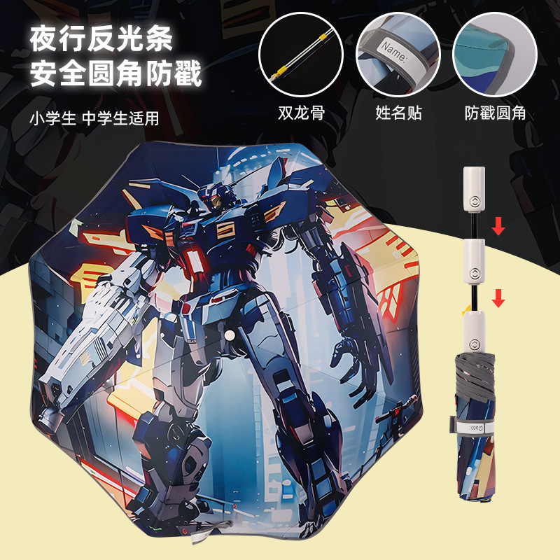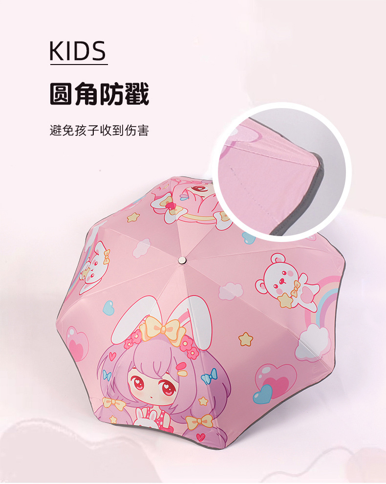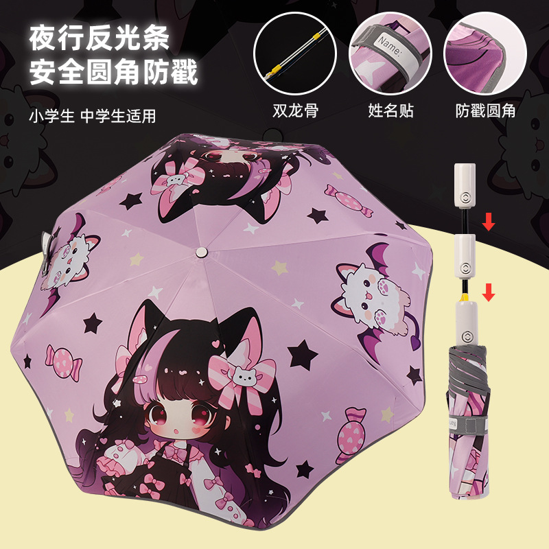 6-15세 어린이를 위한 안전한 반동 방지 둥근 모서리 만화 어린이 우산, 자동 절단, 비닐 우산, 이름 스티커 포함