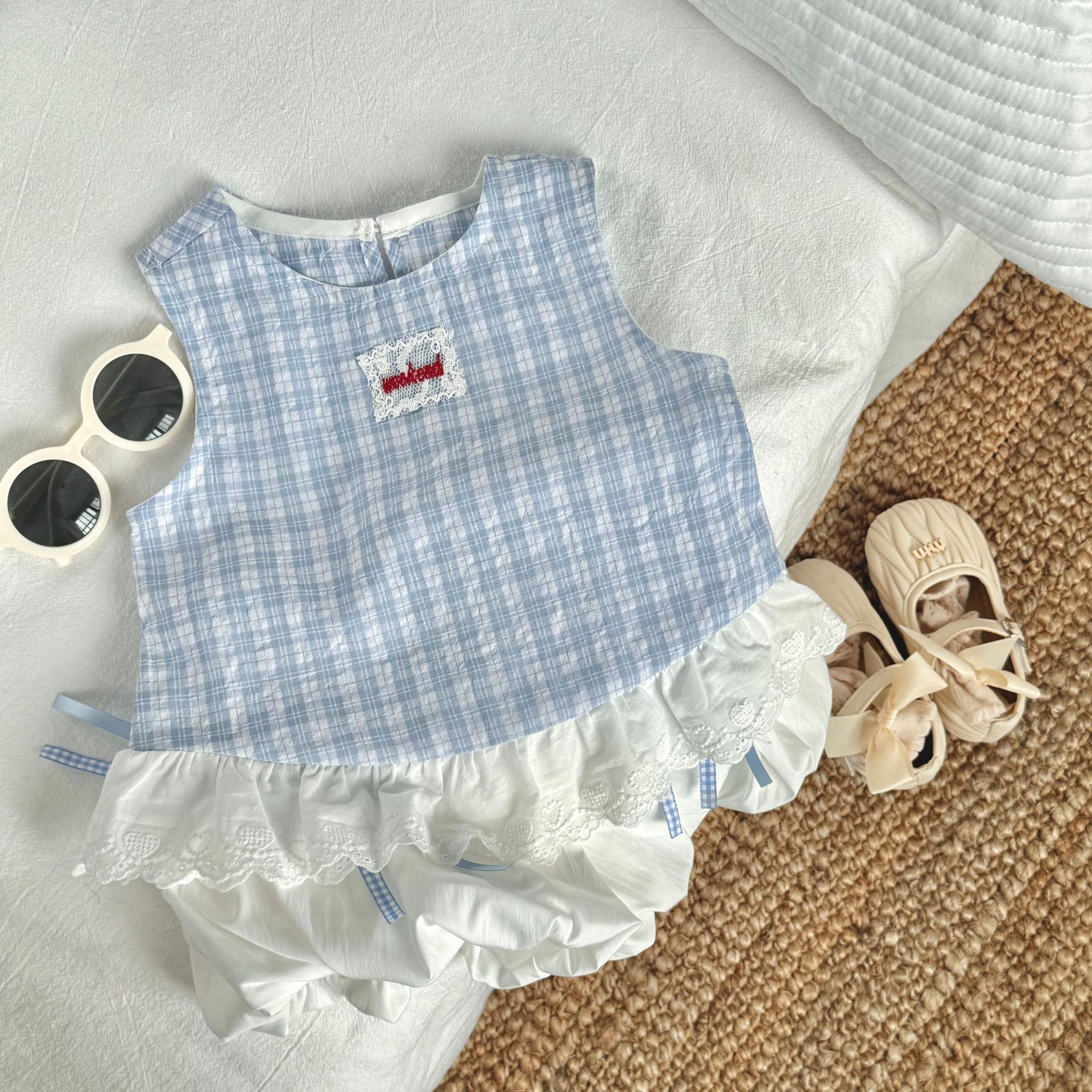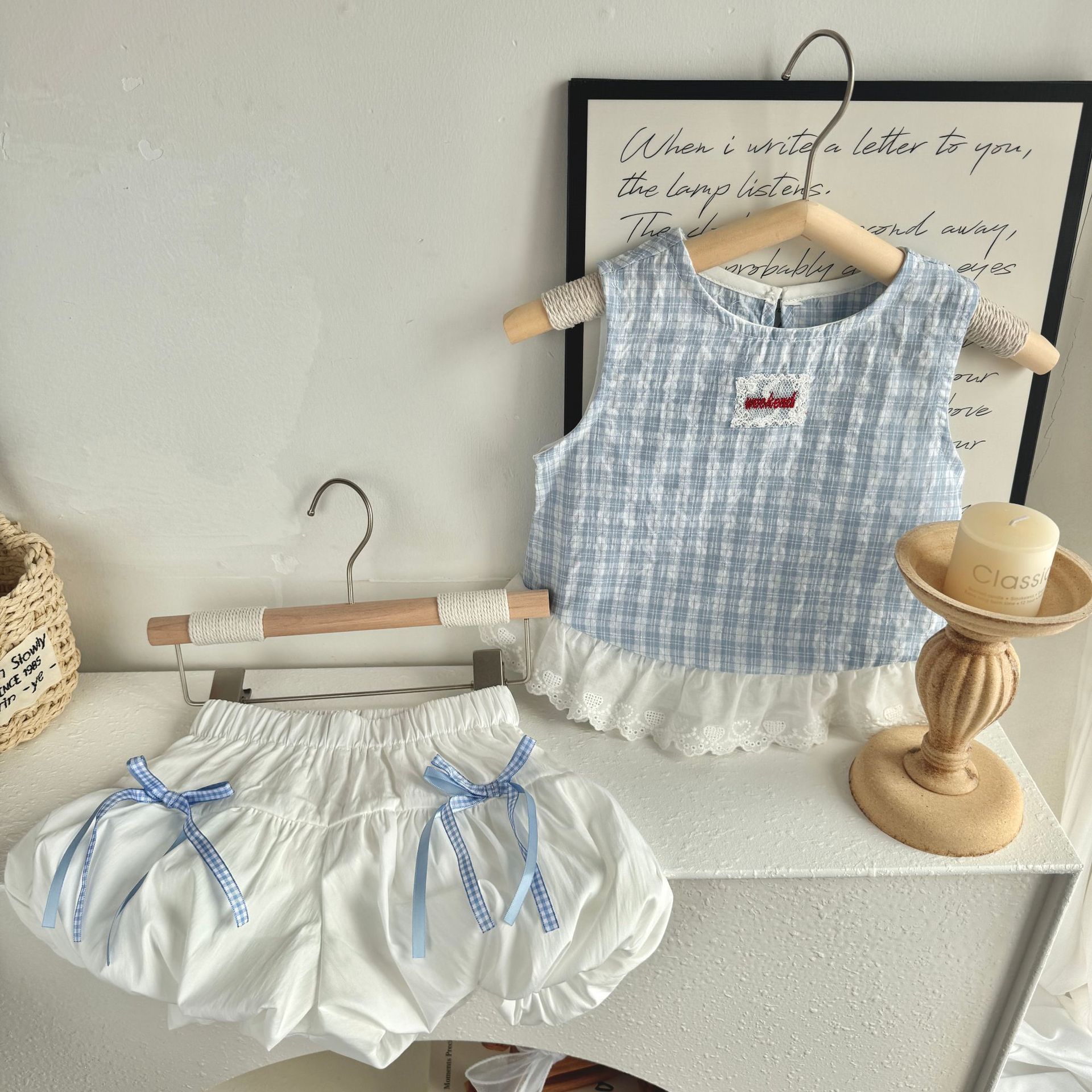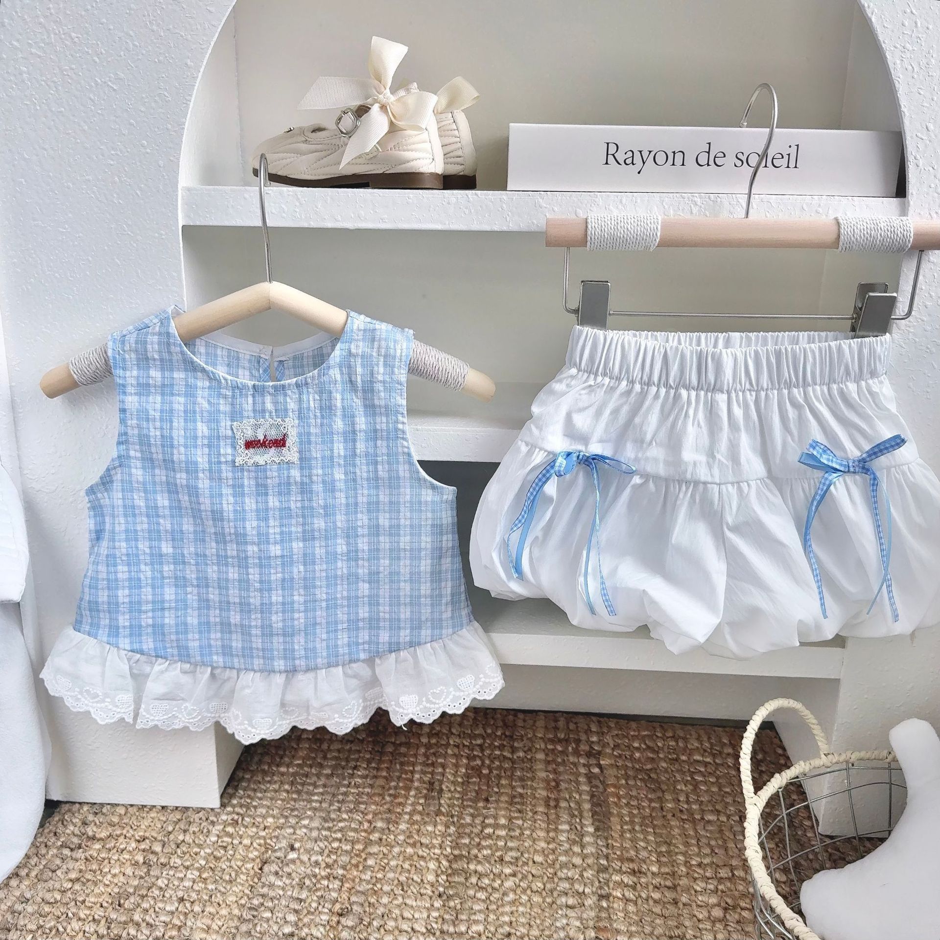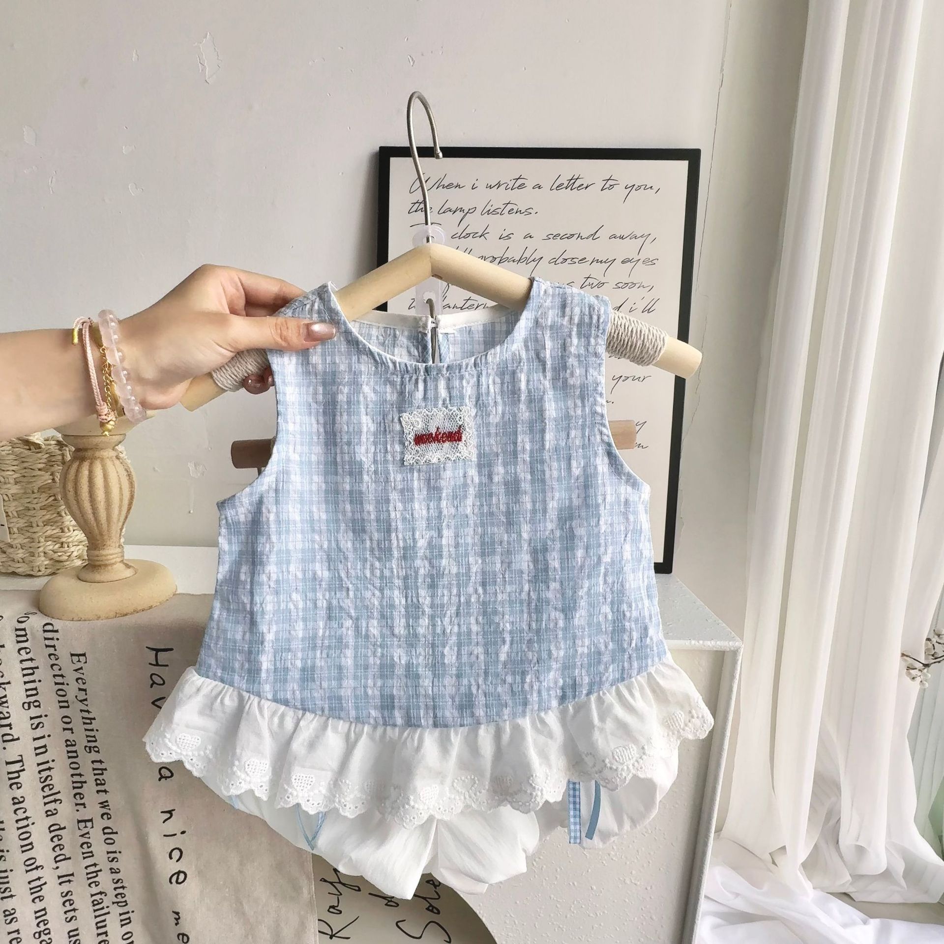 여자 여름 파란색 격자 무늬 조끼 탑 달콤하고 귀여운 요정 활 탑 꽃 새싹 바지 스커트 투피스 세트