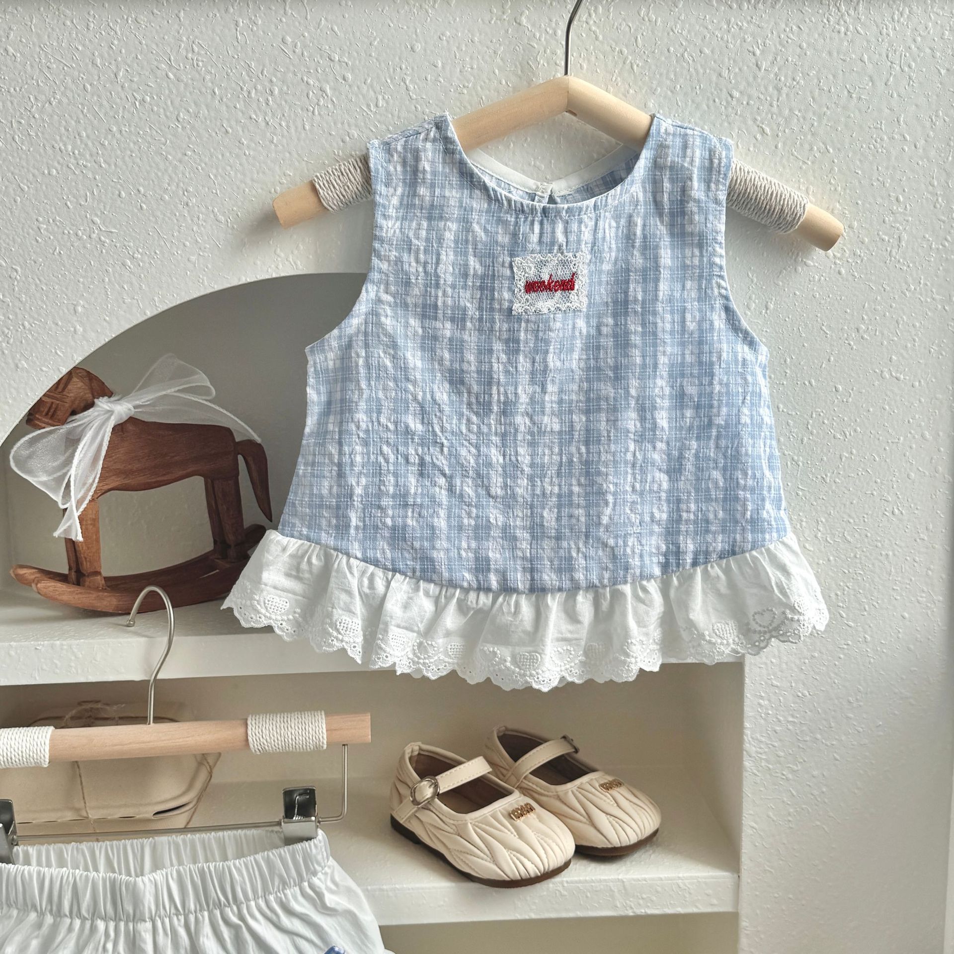 여자 여름 파란색 격자 무늬 조끼 탑 달콤하고 귀여운 요정 활 탑 꽃 새싹 바지 스커트 투피스 세트스토어 가기