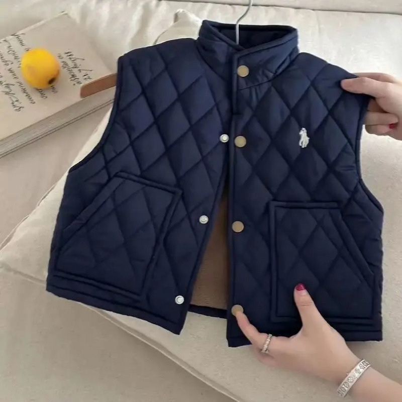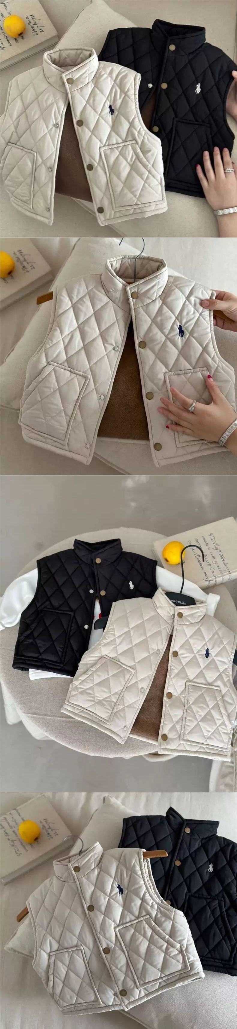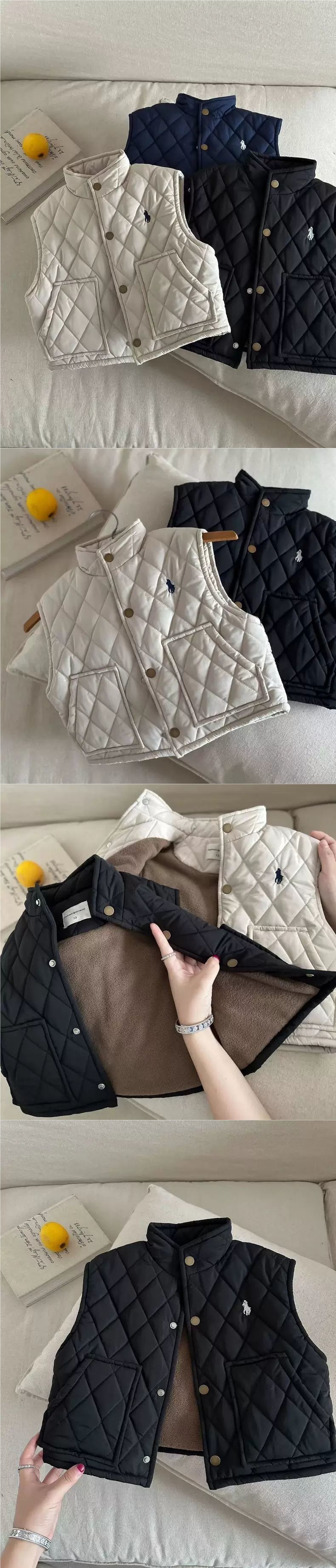 어린 이용 면화 조끼 2024 가을 및 겨울 단색 여성의 내구성있는 어깨 구멍이있는 새 소년 격자 무늬 탑