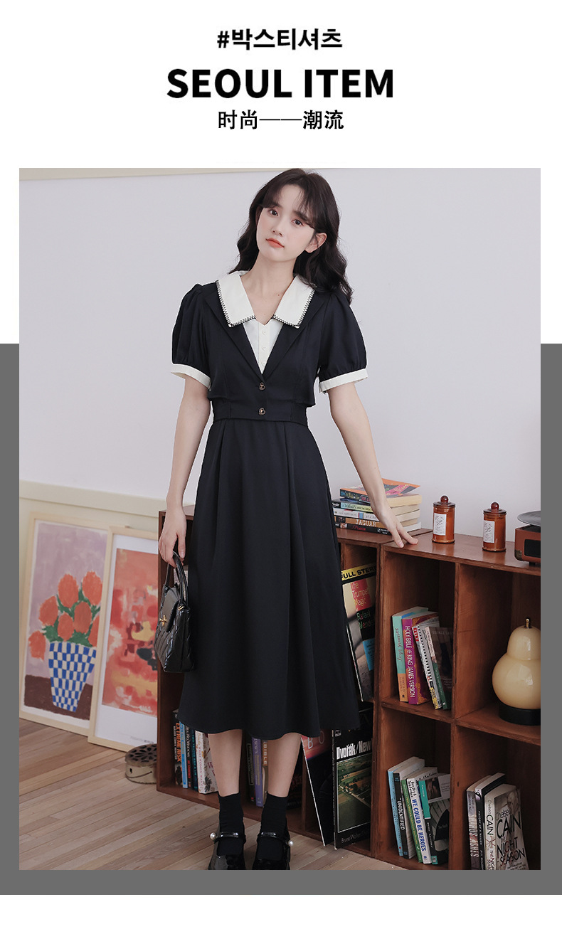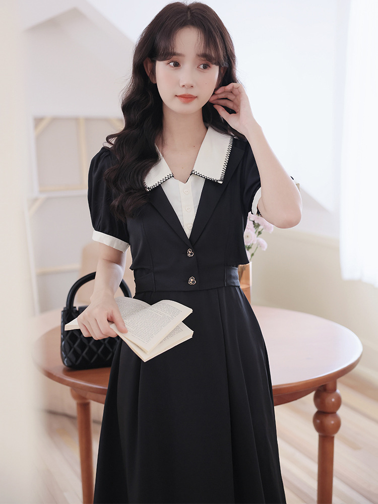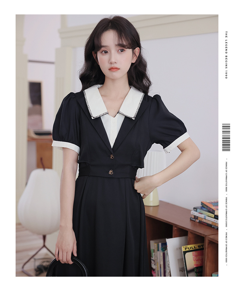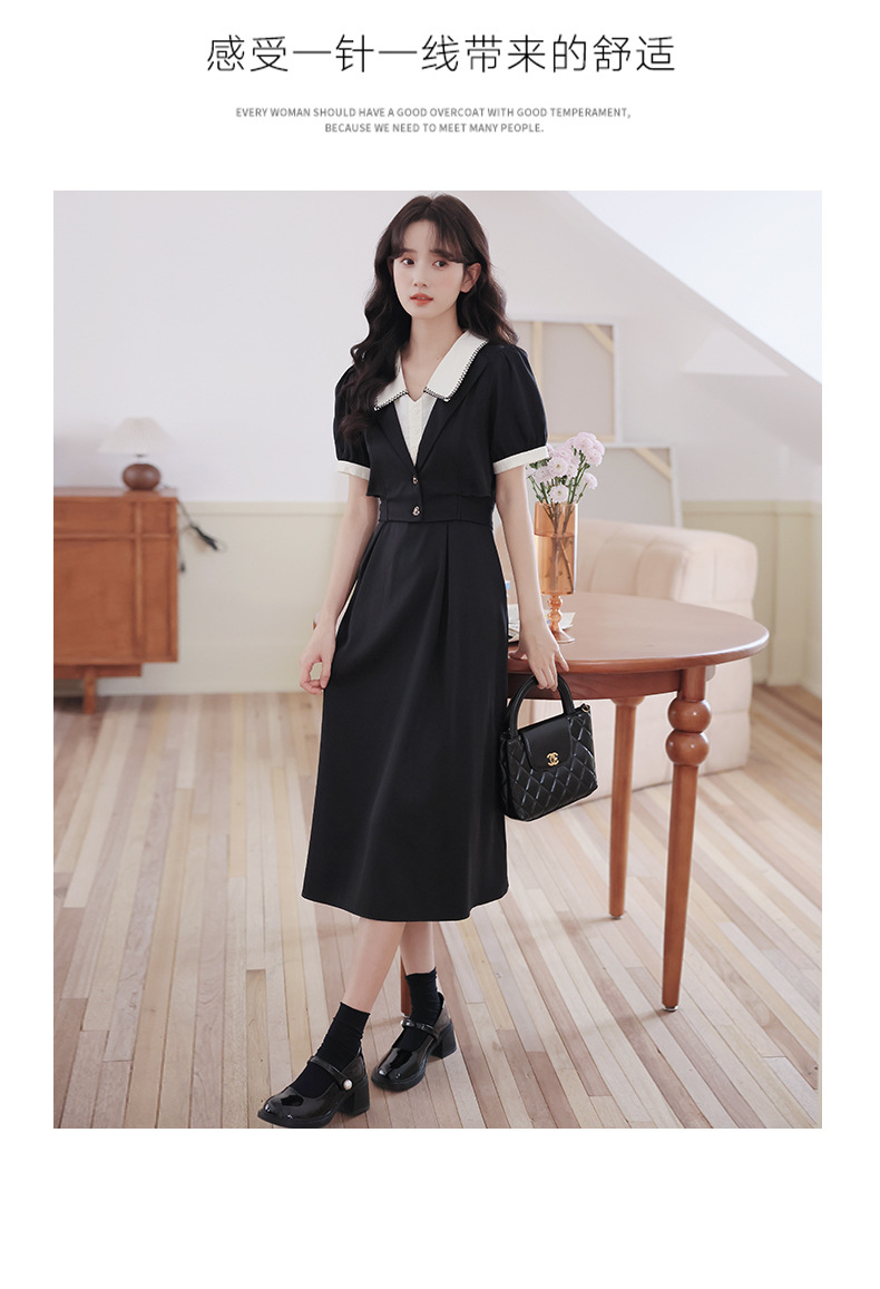 2025 년 여름 새로운 UGC 인터뷰 통근자 가짜 투피스 기질 대비 라르 짧은 소매 높은 허리 원피스 여성