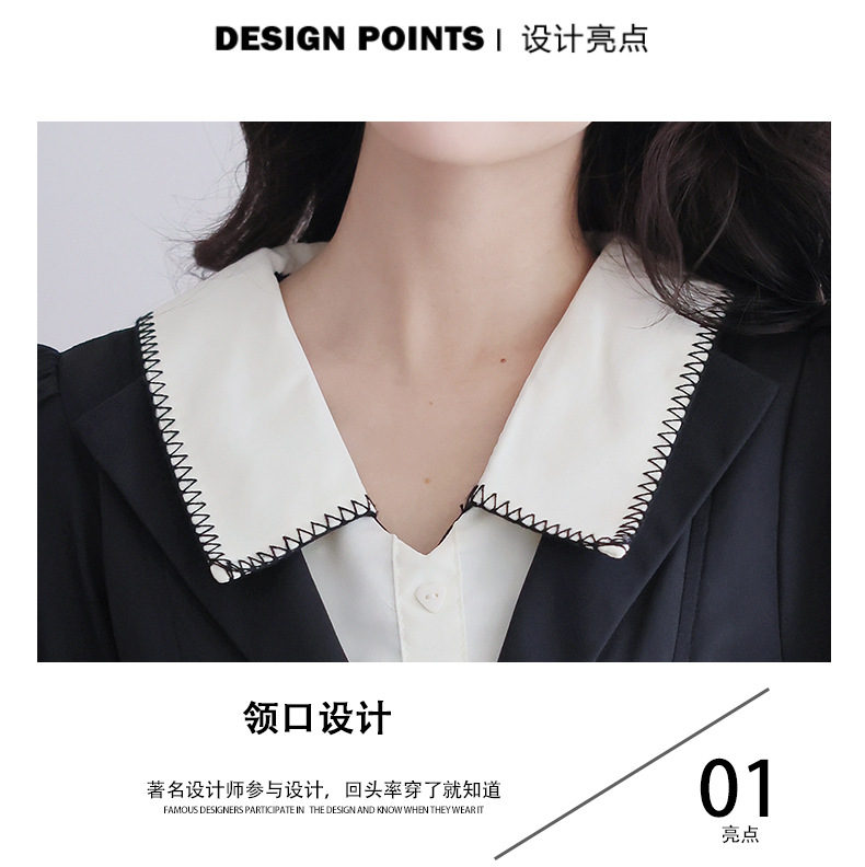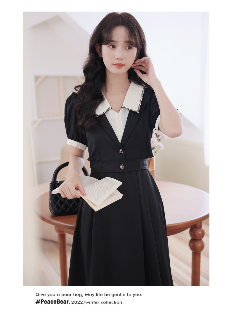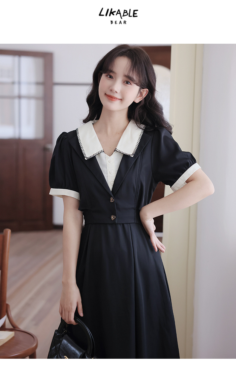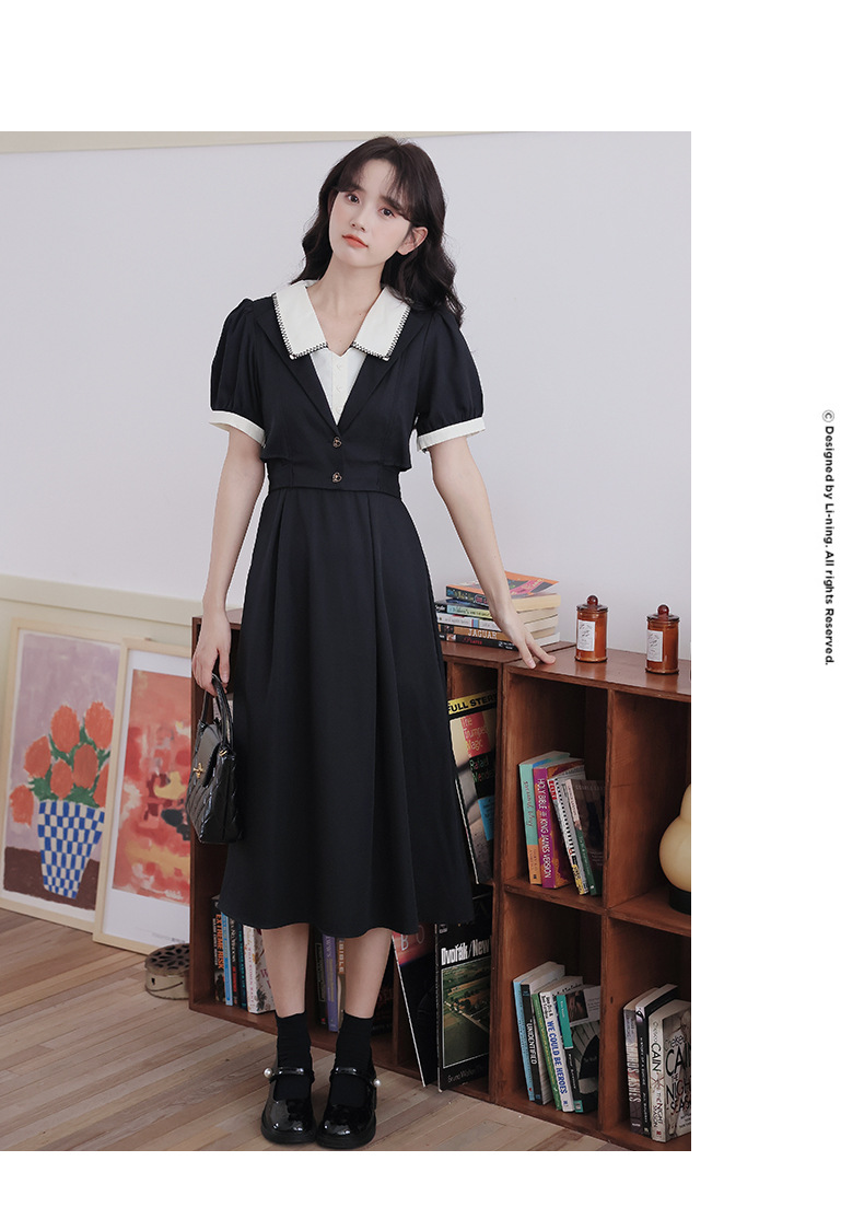 2025 년 여름 새로운 UGC 인터뷰 통근자 가짜 투피스 기질 대비 라르 짧은 소매 높은 허리 원피스 여성