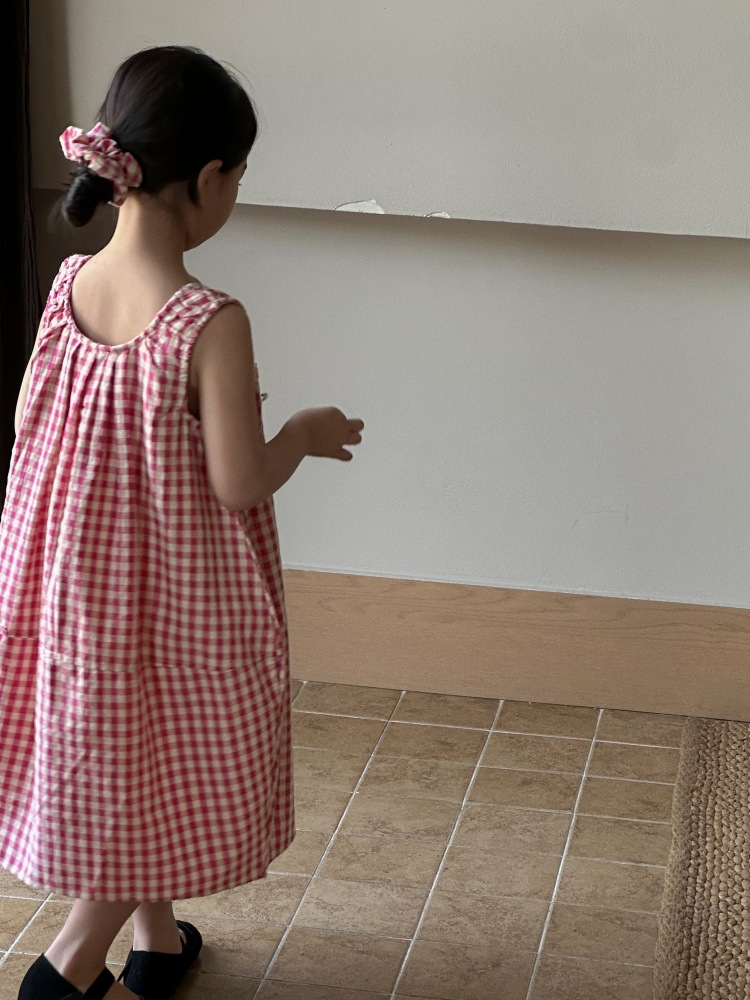 여자 원피스 2025 여름 새로운 도착 한국 스타일 일본 Ins 스타일 우아한 민소매 격자 무늬 빅 원피스스토어 가기