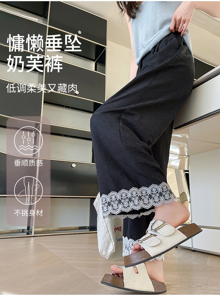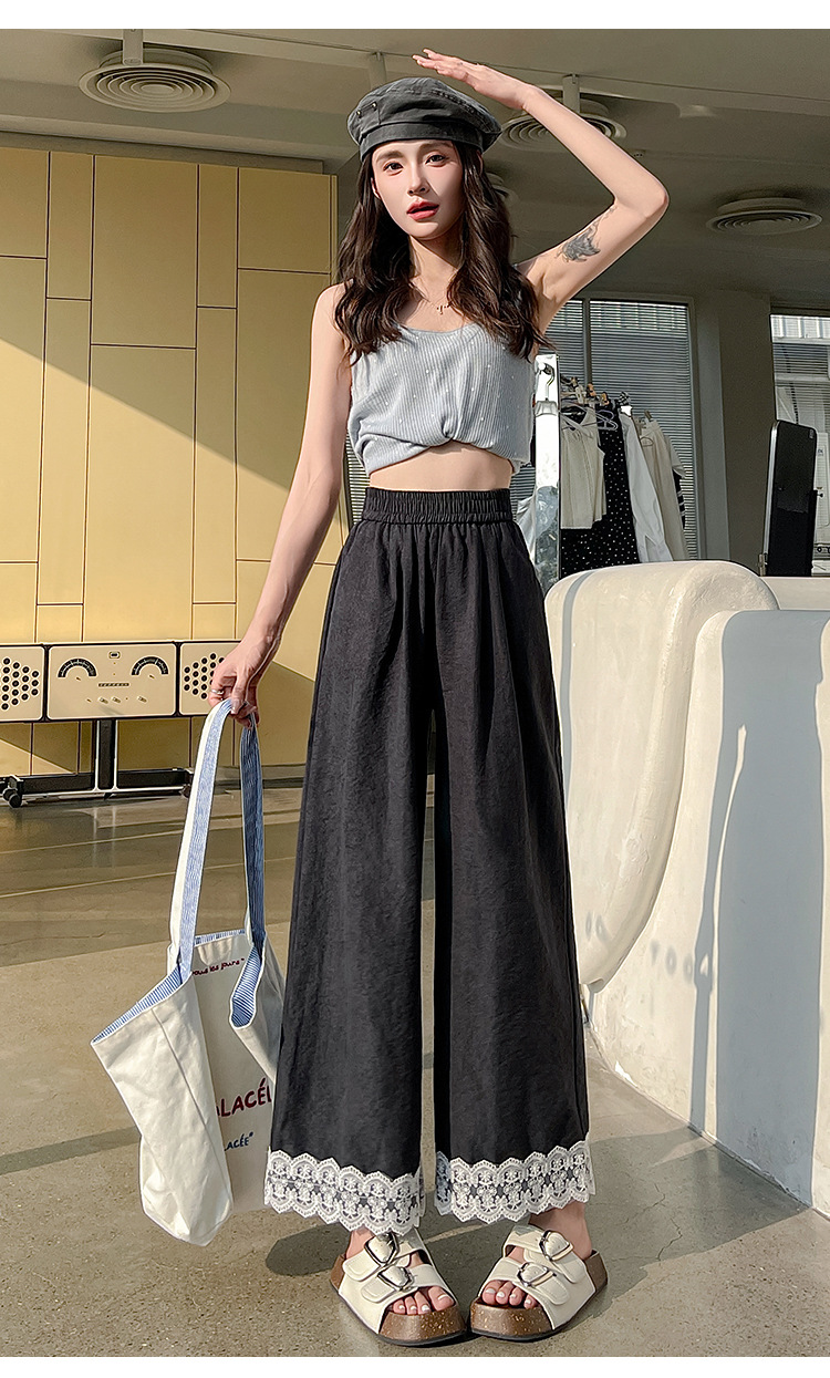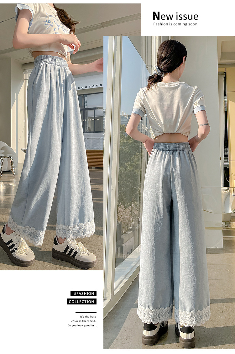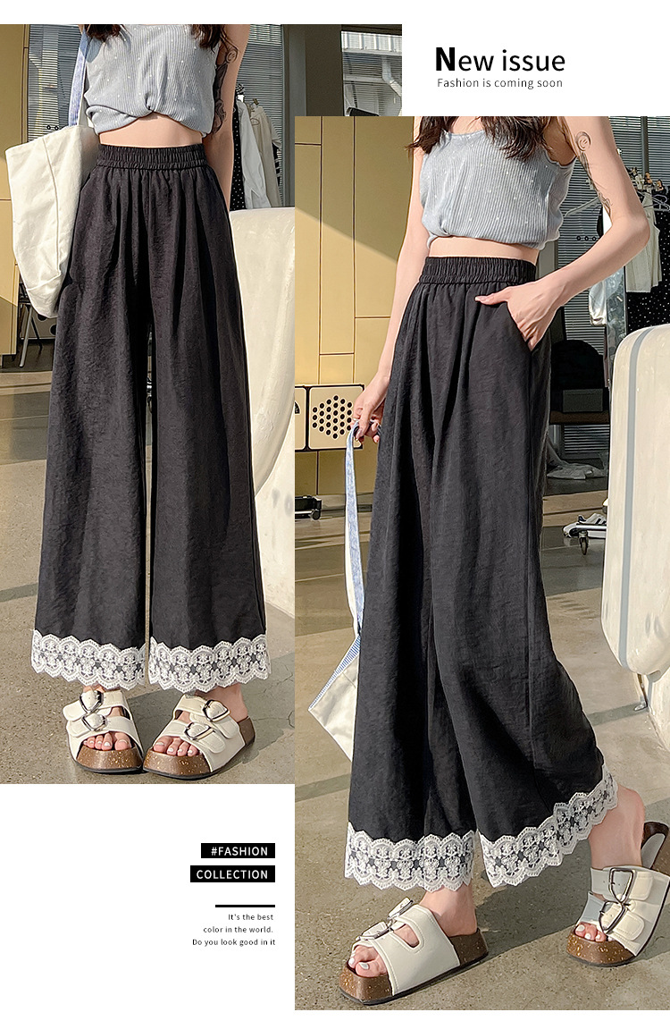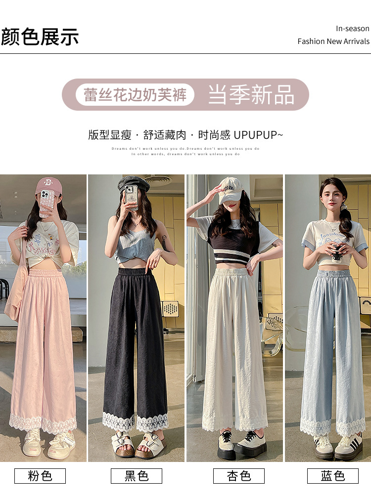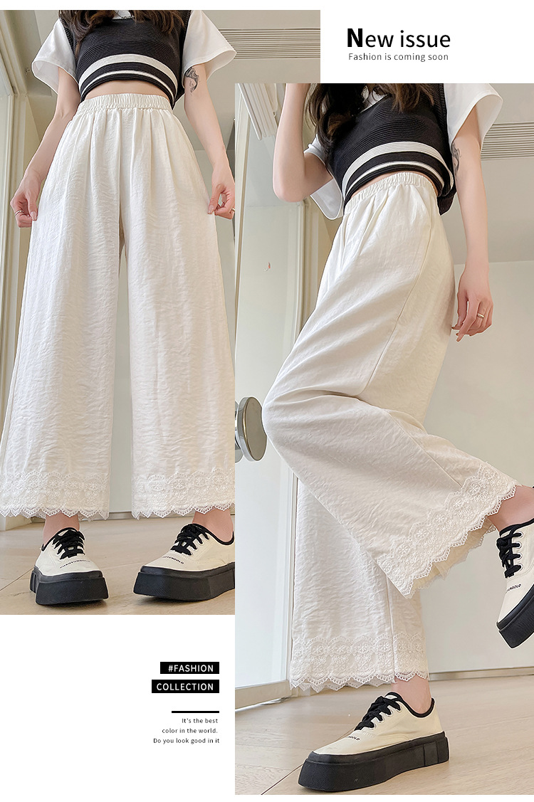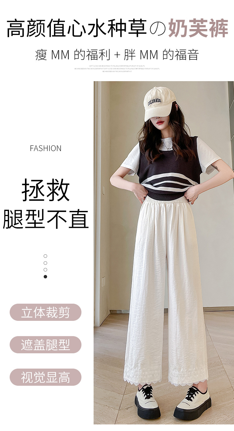 진짜 샷 레이스 바느질 아이스 실크 우유 넓은 다리 바지 여성의 여름 높은 허리 슬리밍 스트레이트 캐주얼 바지스토어 가기