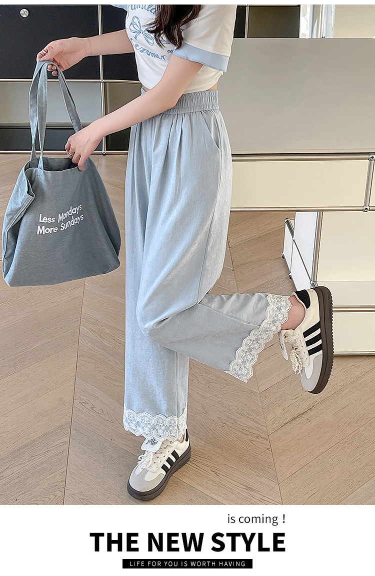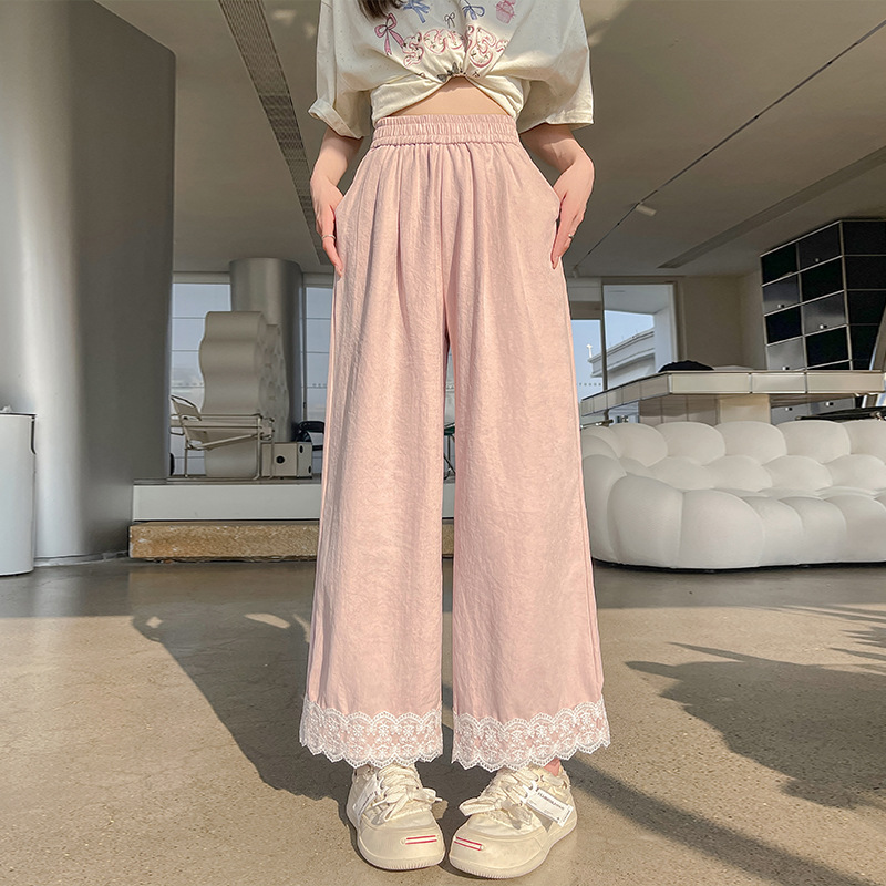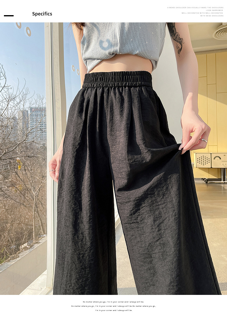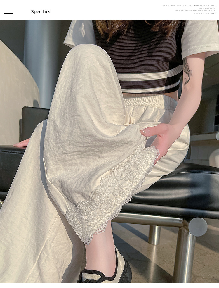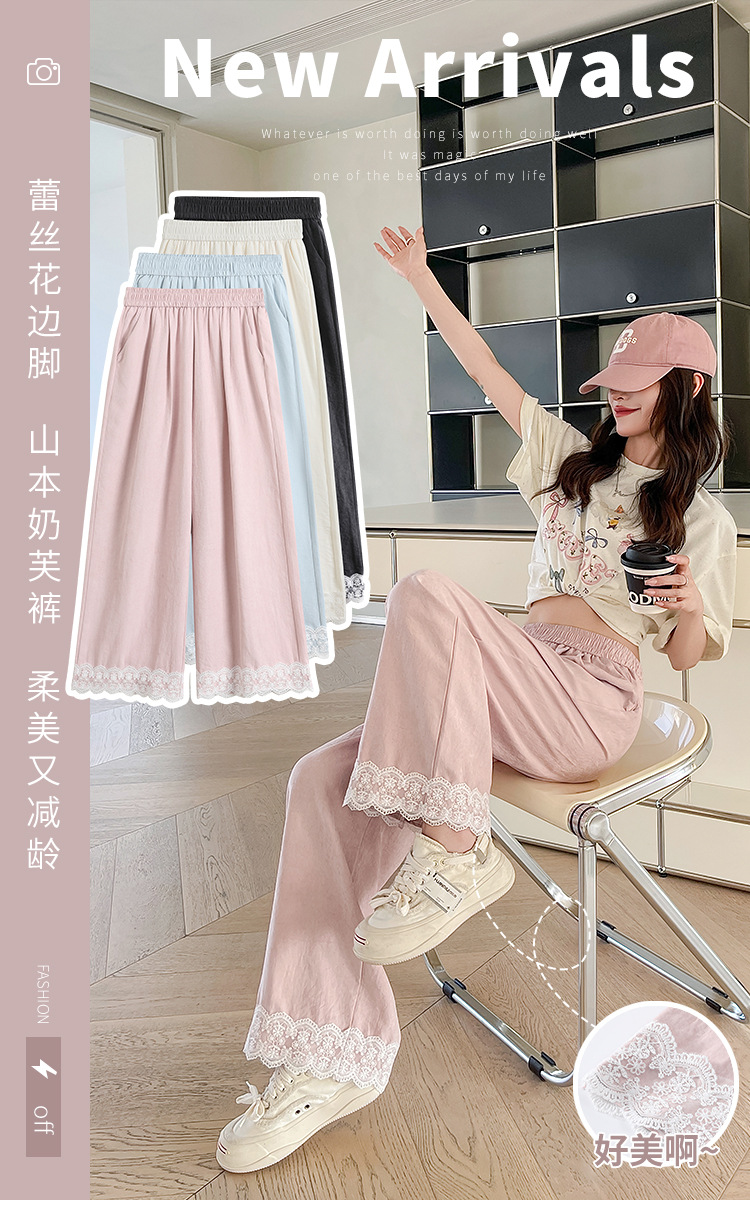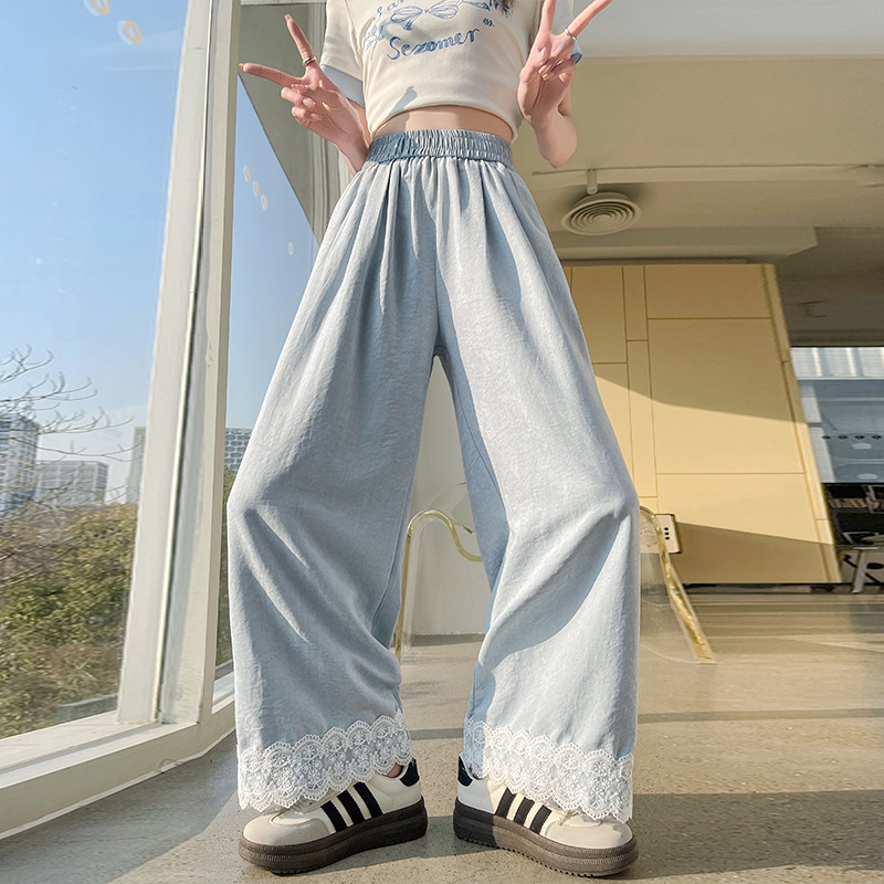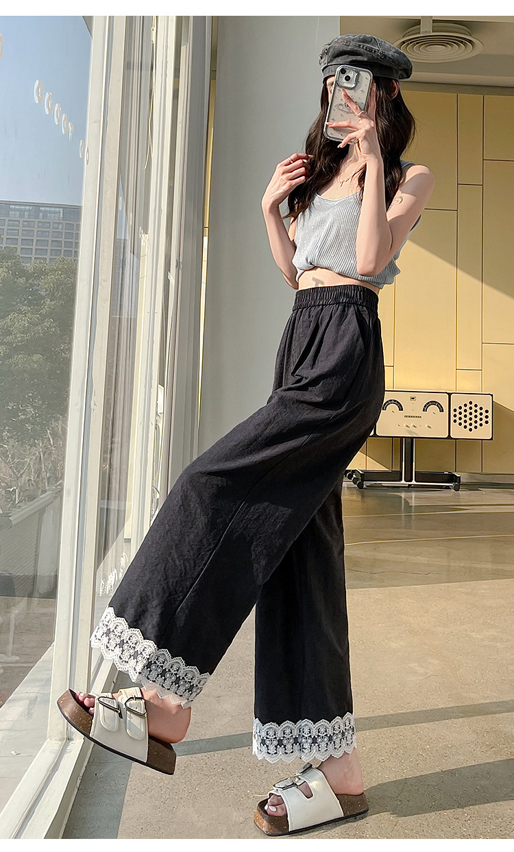 진짜 샷 레이스 바느질 아이스 실크 우유 넓은 다리 바지 여성의 여름 높은 허리 슬리밍 스트레이트 캐주얼 바지스토어 가기