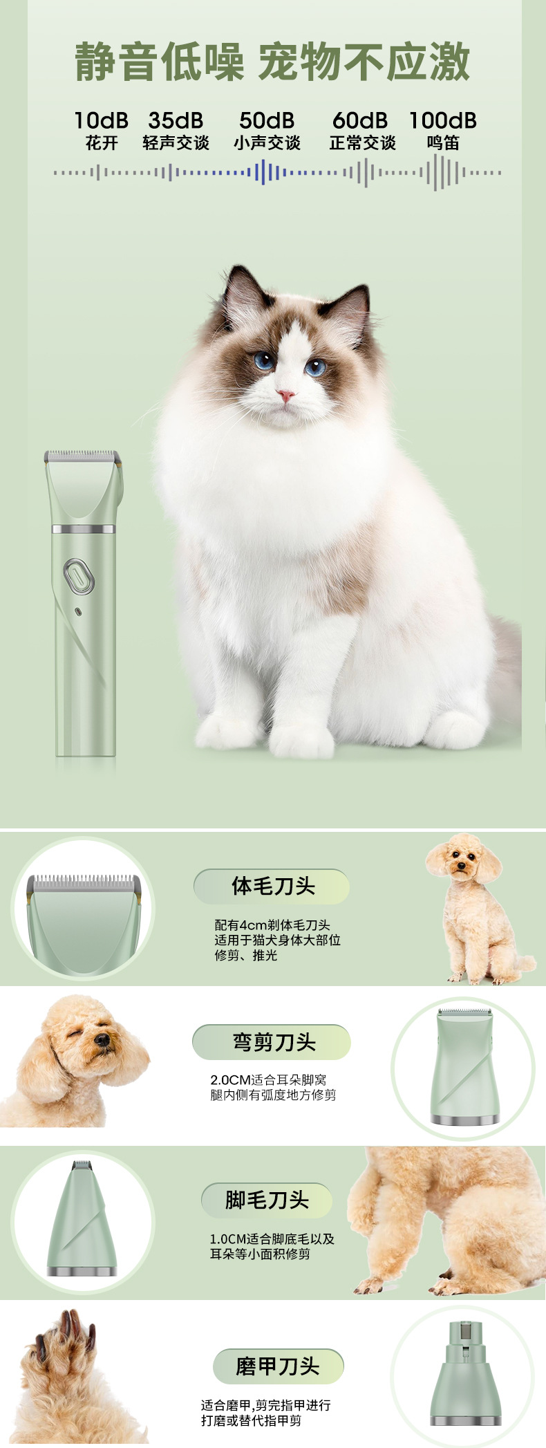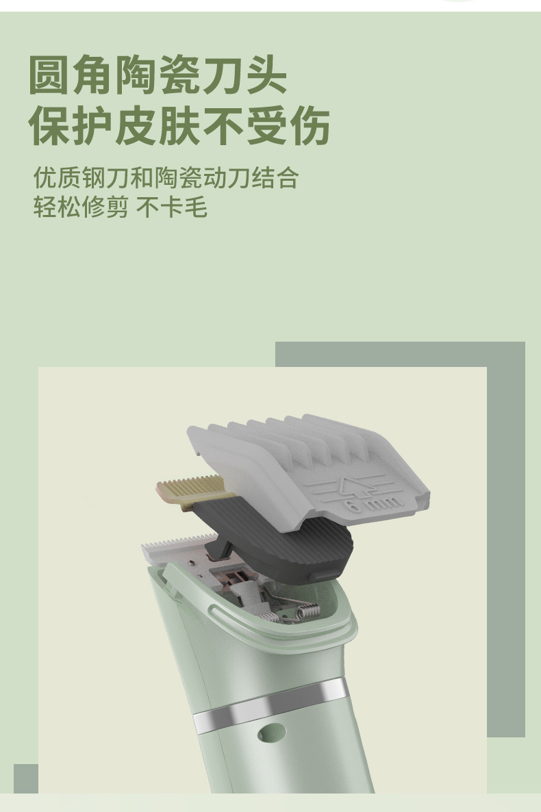 产品配件:剃毛刀头 弯刀头 局部剃毛刀头 磨甲刀头 包装盒、说明书(英文)、6个限位梳、USB线、一瓶润滑油、一只清洁刷