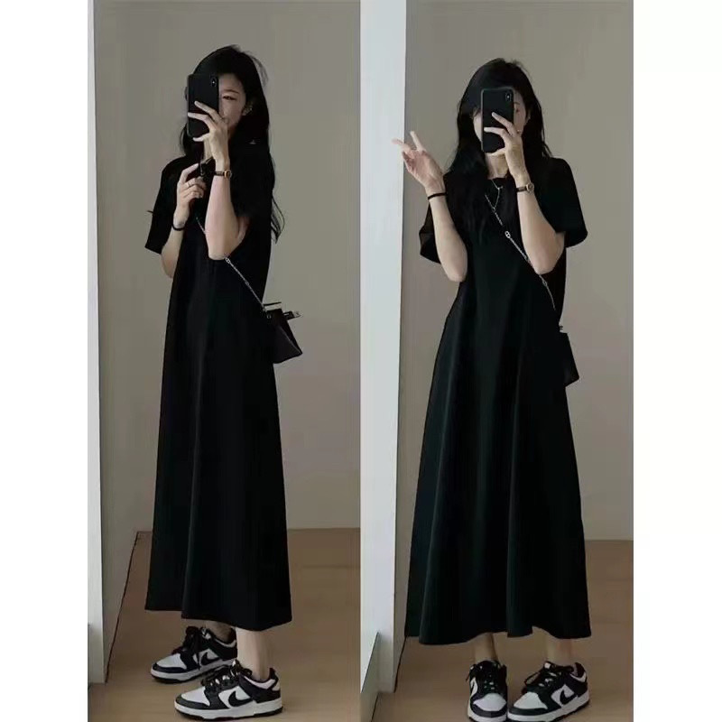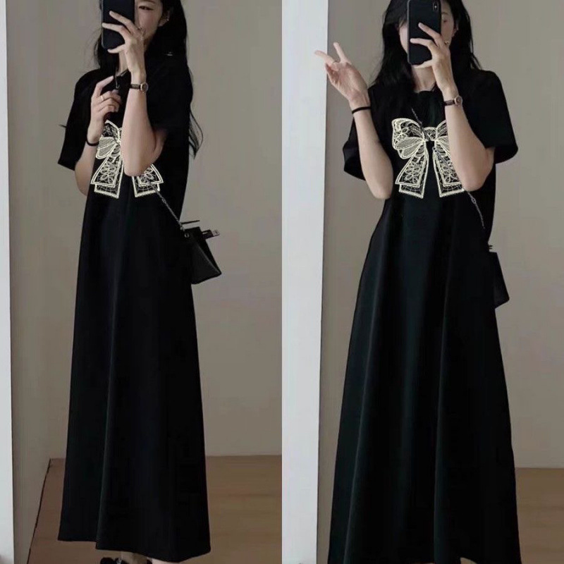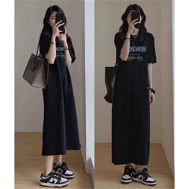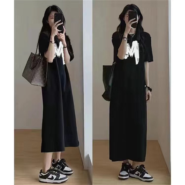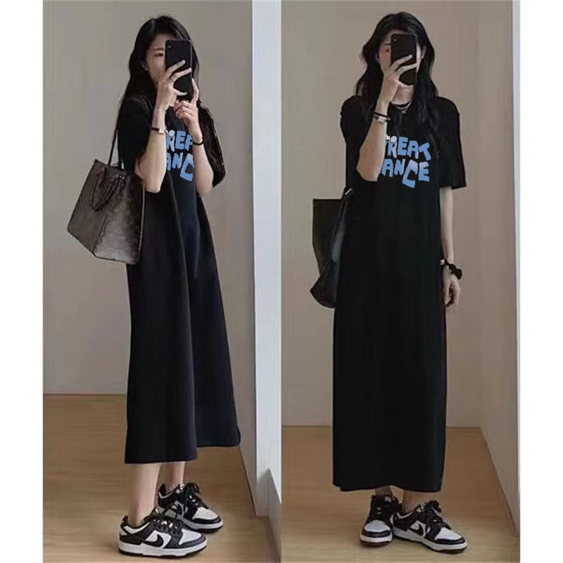 반팔 원피스 여름 새 프린트 티셔츠 여성용 통통녀 느슨한 고급 스트레이트 긴 무릎 게으른 나이트 드레스스토어 가기