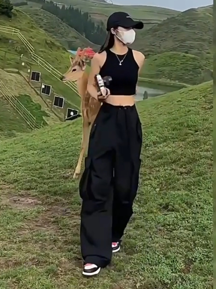여성용 아메리칸 하이킹 작업복, 봄, 가을 하이 웨이스트 루즈한 소형 와이드 레그 아웃도어 속건성 여름 캐주얼 스포츠 바지