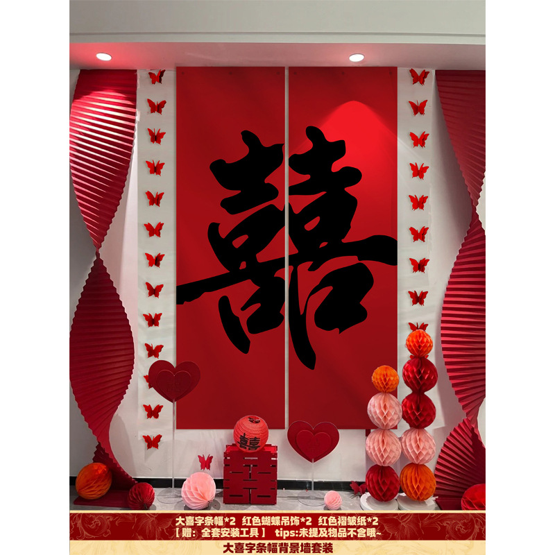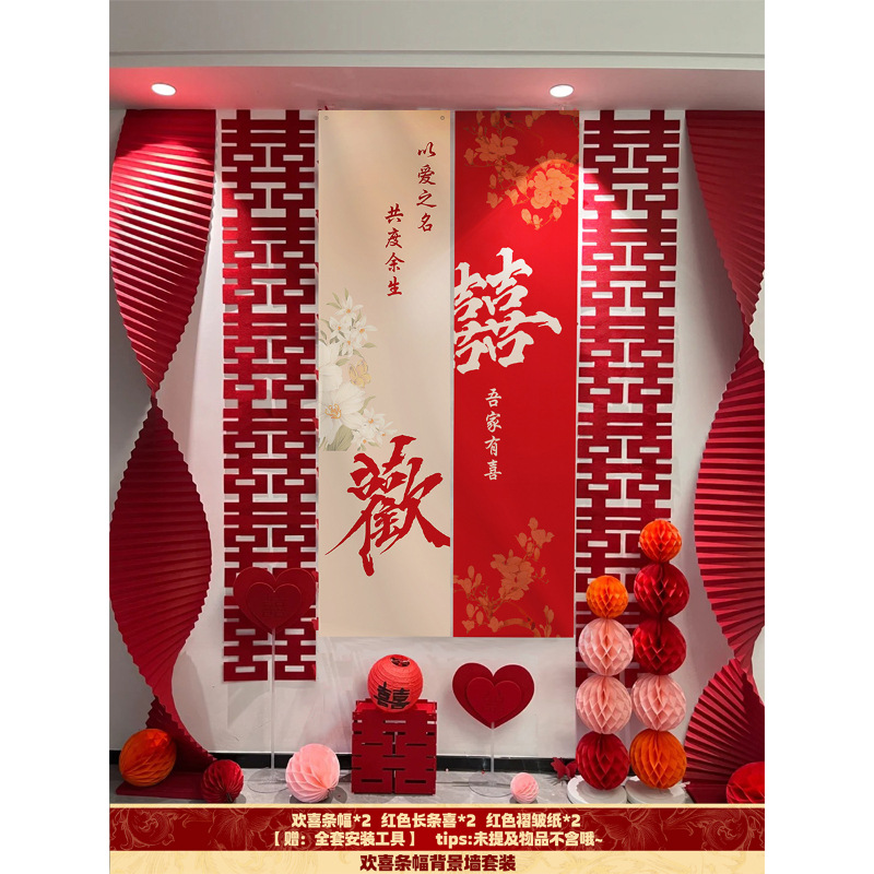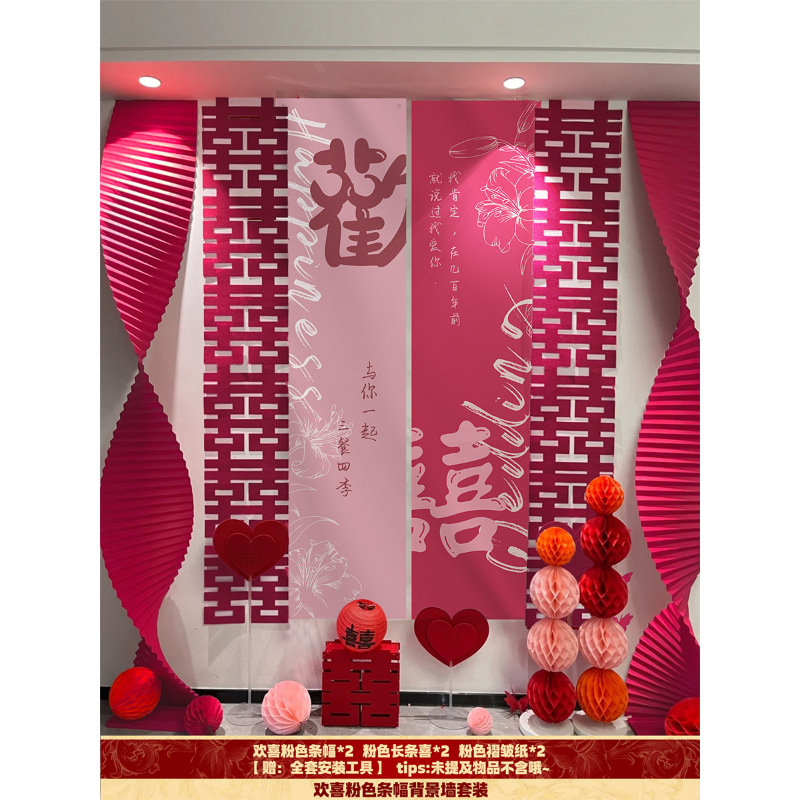 핑크 웨딩 룸 분위기 레이아웃 웨딩 세트 꽃 장식 웨딩 사진 배경 벽 걸이 천 긴 스트립