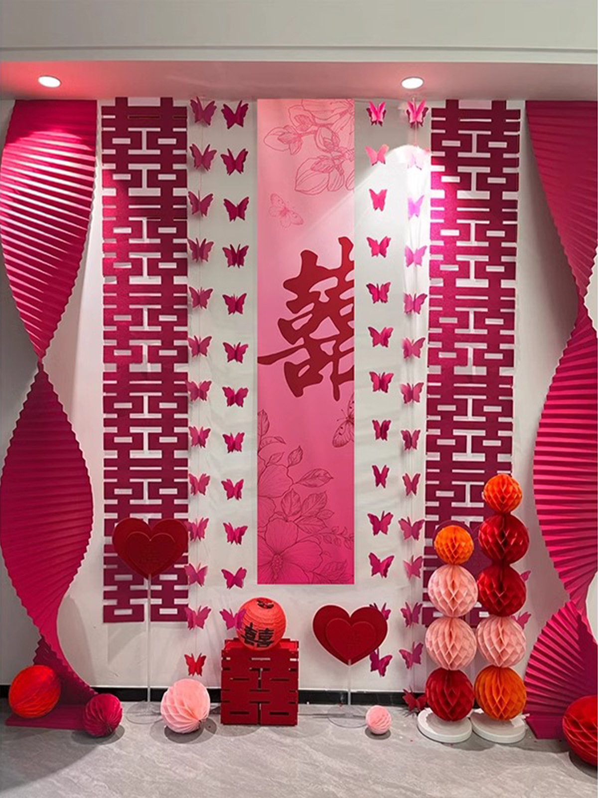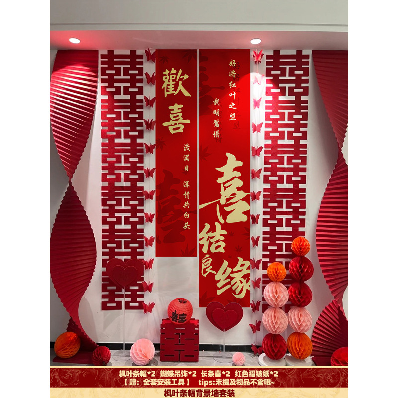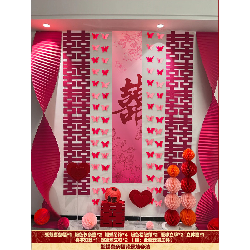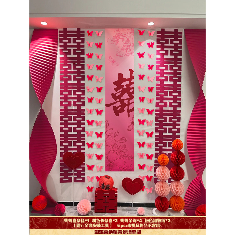 핑크 웨딩 룸 분위기 레이아웃 웨딩 세트 꽃 장식 웨딩 사진 배경 벽 걸이 천 긴 스트립스토어 가기