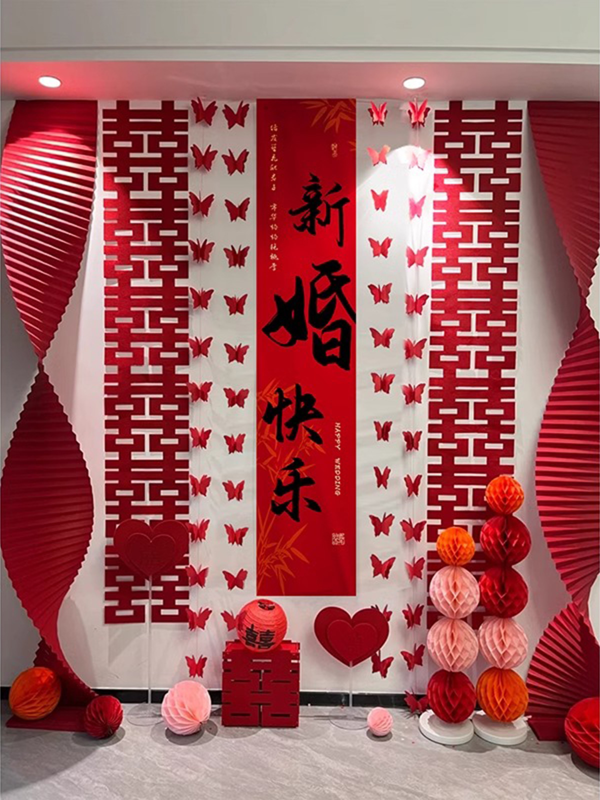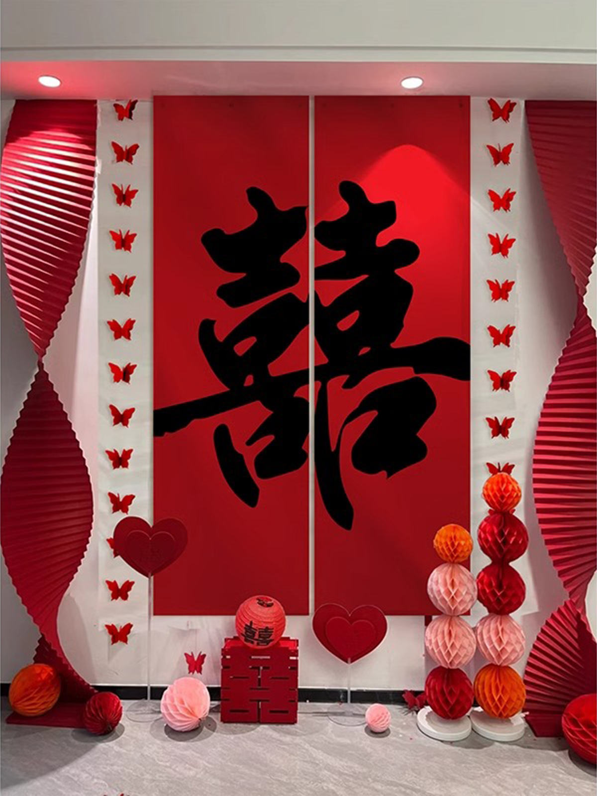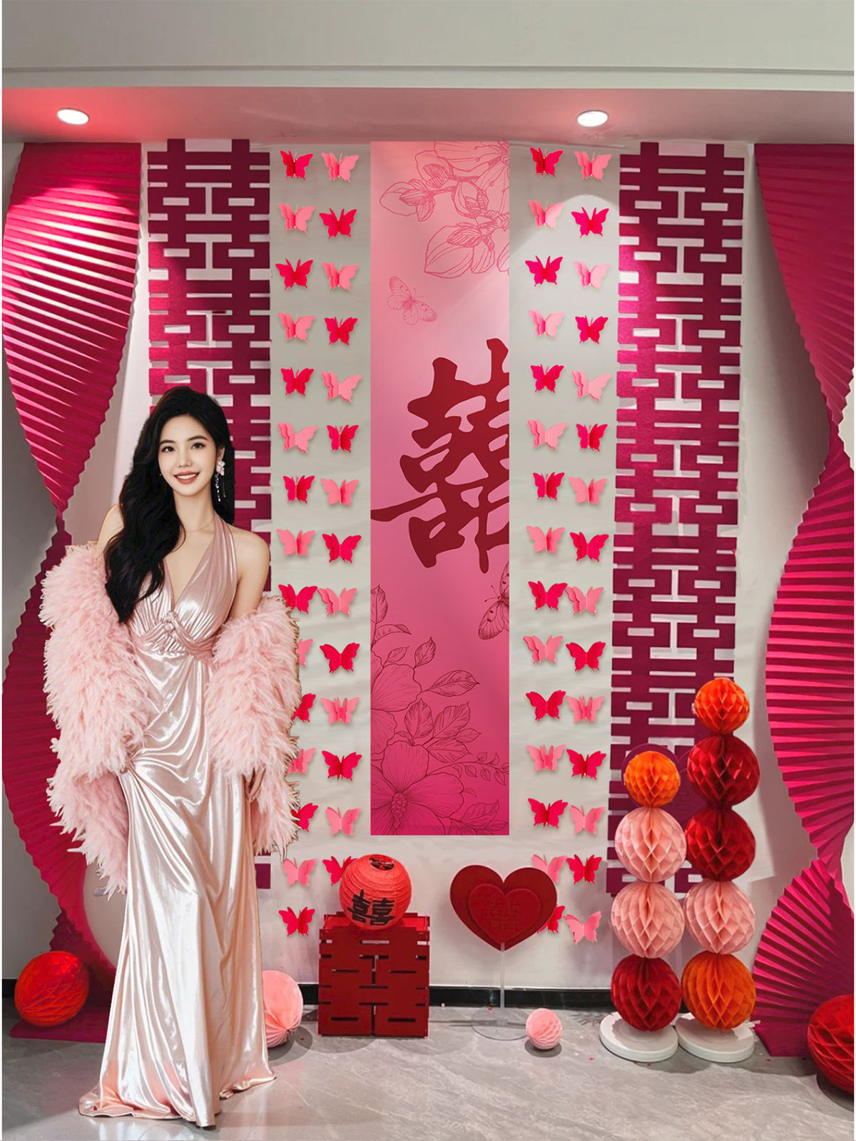 핑크 웨딩 룸 분위기 레이아웃 웨딩 세트 꽃 장식 웨딩 사진 배경 벽 걸이 천 긴 스트립스토어 가기