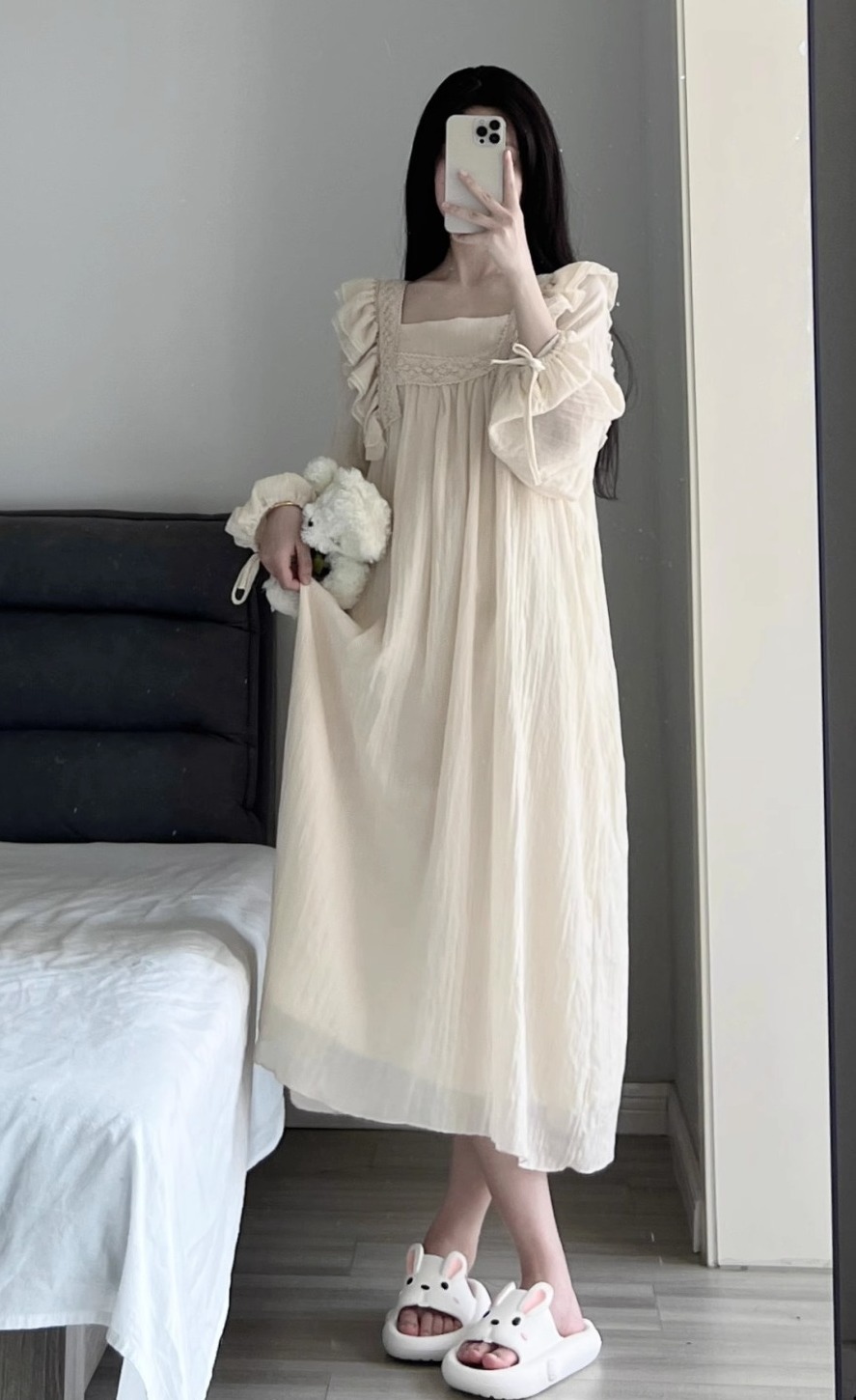 순수한 욕망 파자마 여성의 여름 2025 새로운 하이 엔드 소녀 스퀘어 칼라 나이트 드레스 슬링 긴팔 캐주얼 원피스
