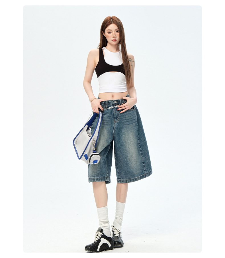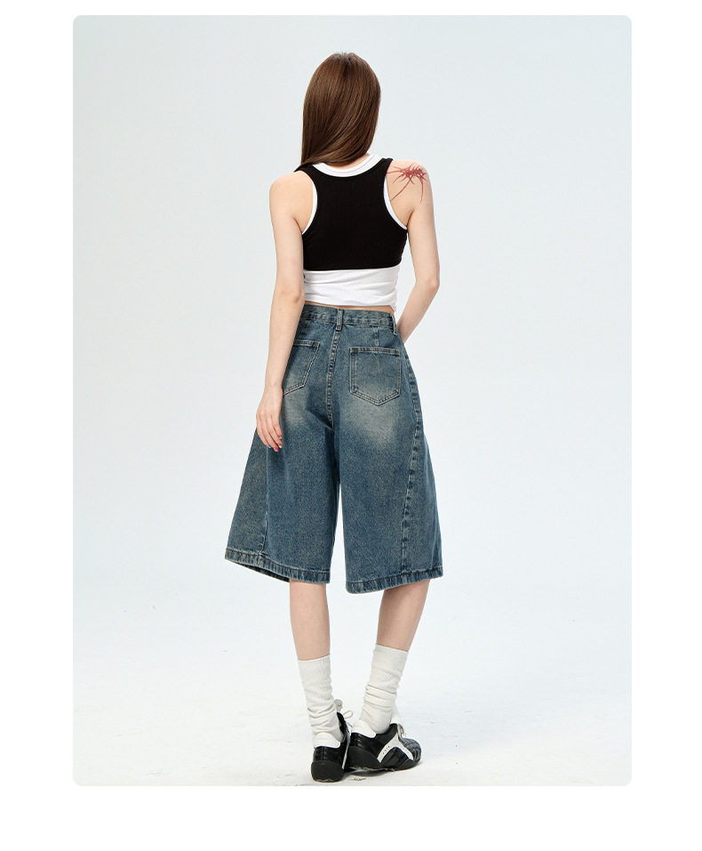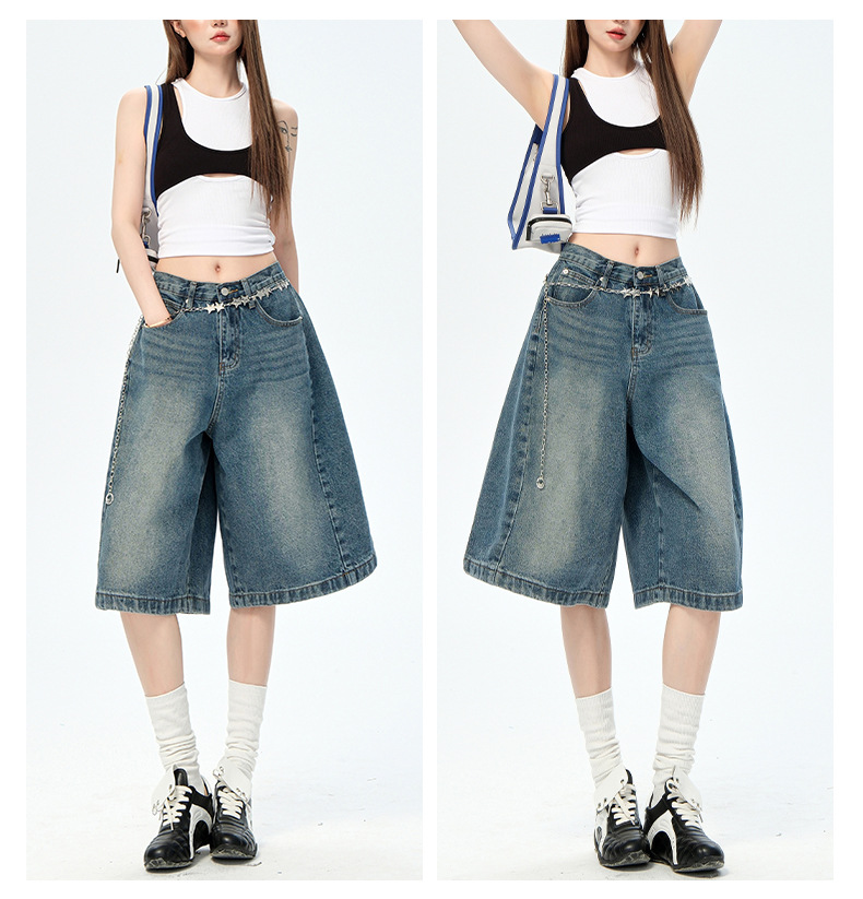 2025 American Retro 5 점 청바지 여성 여름 새로운 느슨한 하이 웨이스트 편안한 와이드 레그 5 점 바지스토어 가기