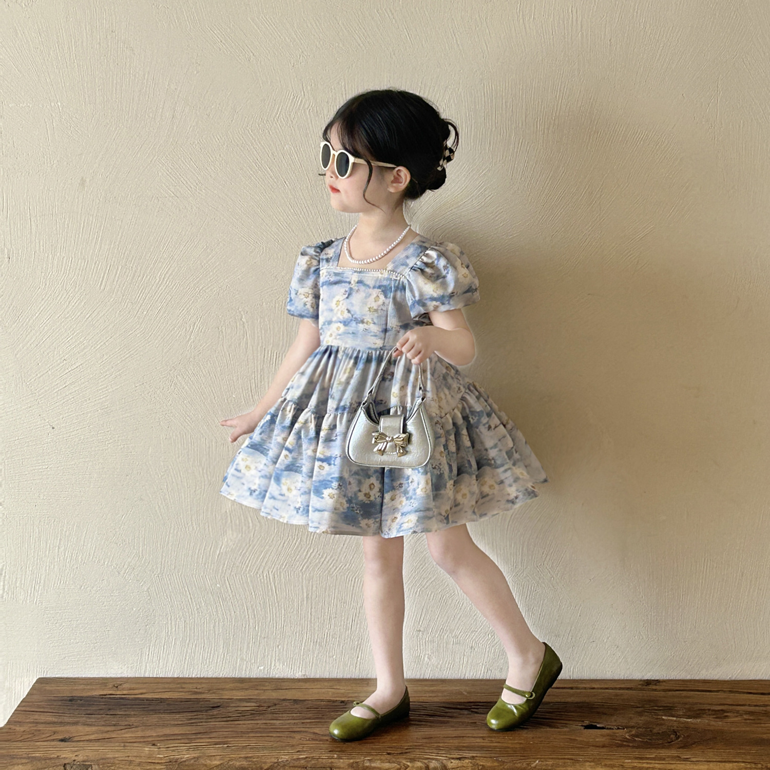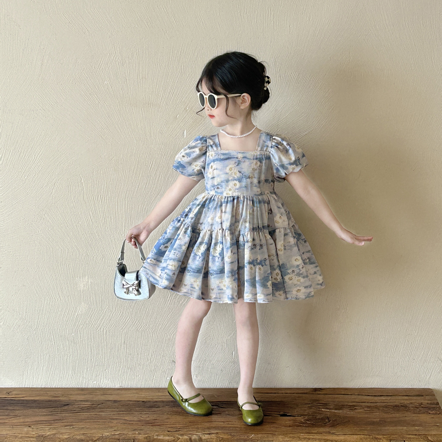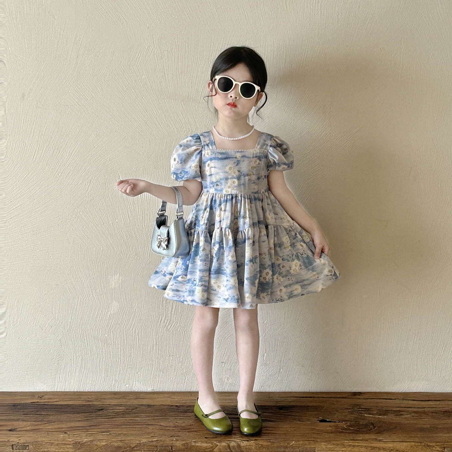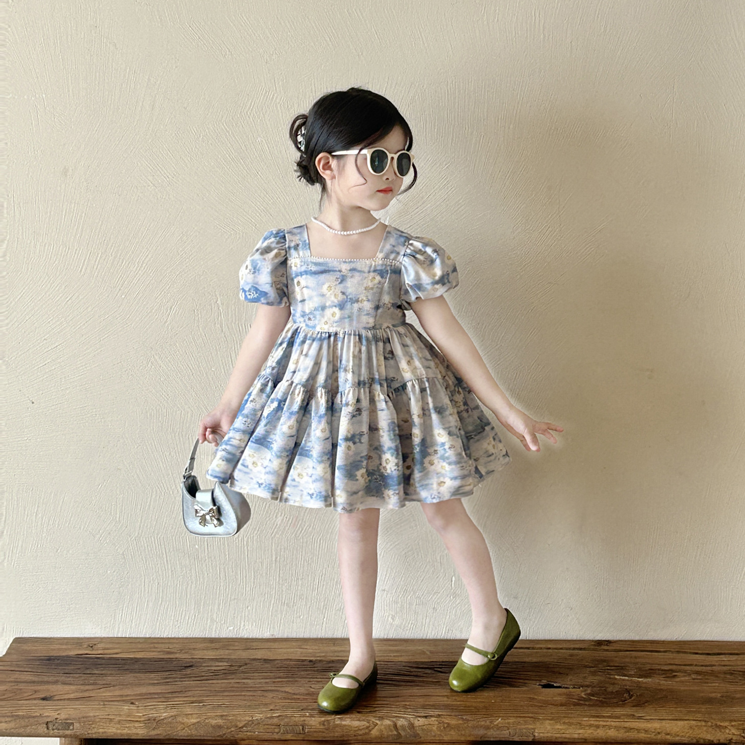 소녀 블루 플로랄 버블 슬리브 스퀘어 칼라 원피스 2025 여름 새로운 도착 소녀의 휴가 공주 먼지스토어 가기