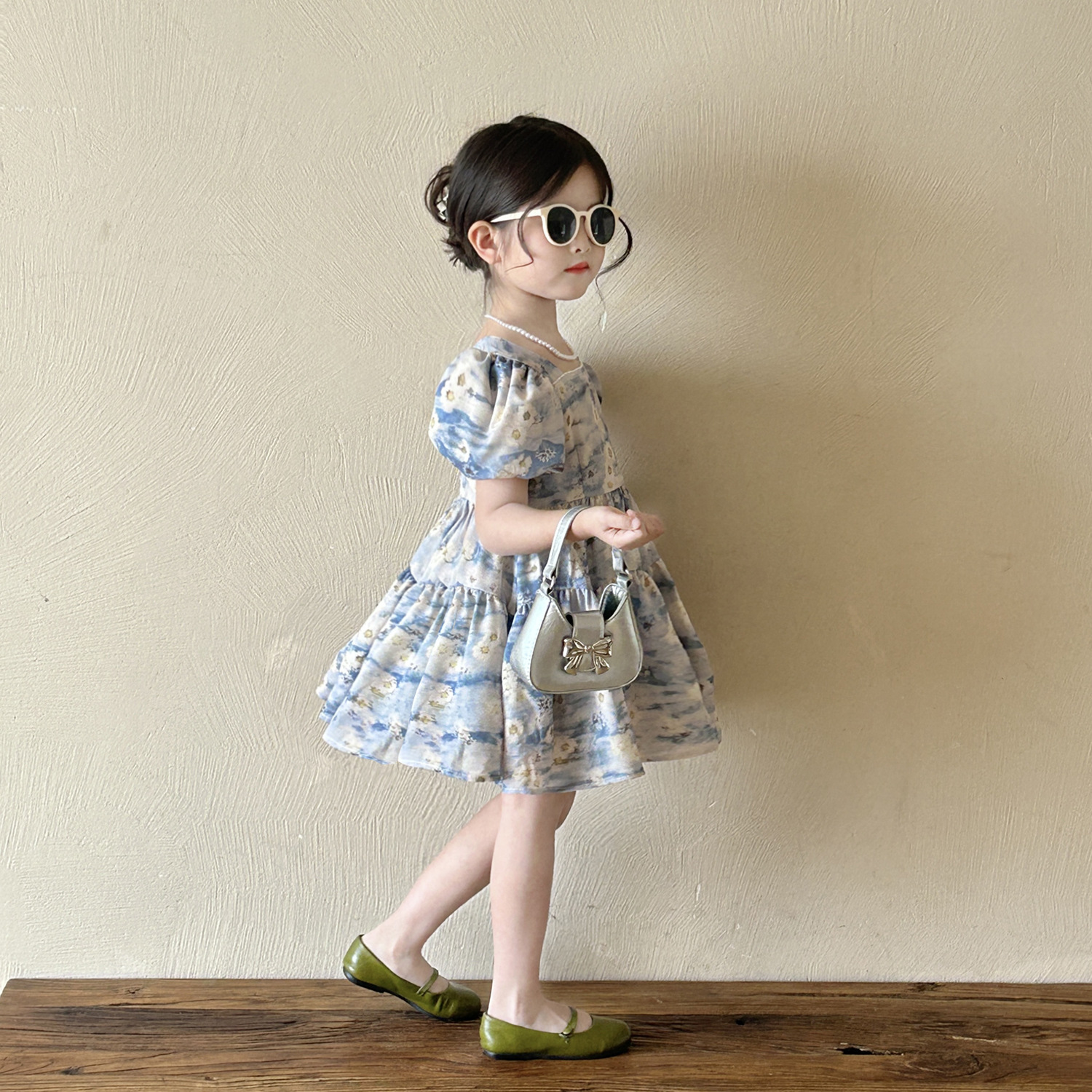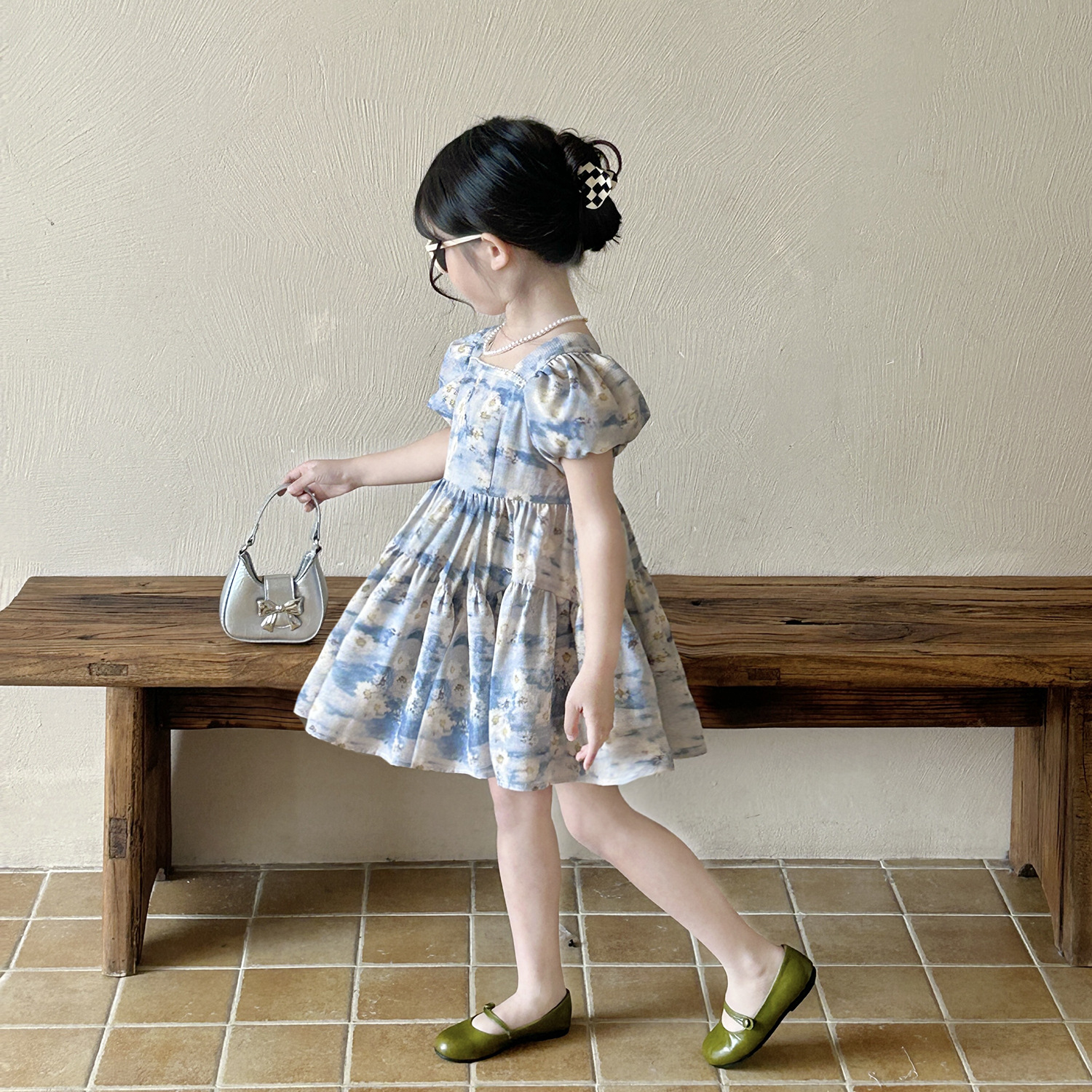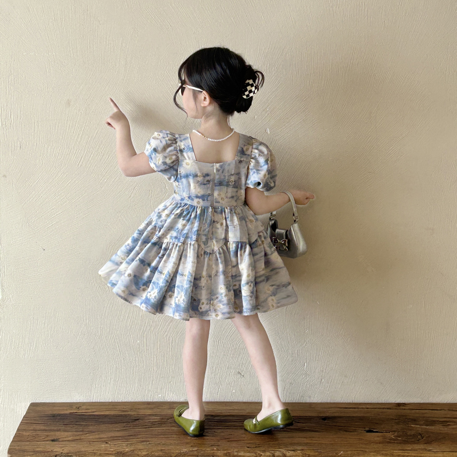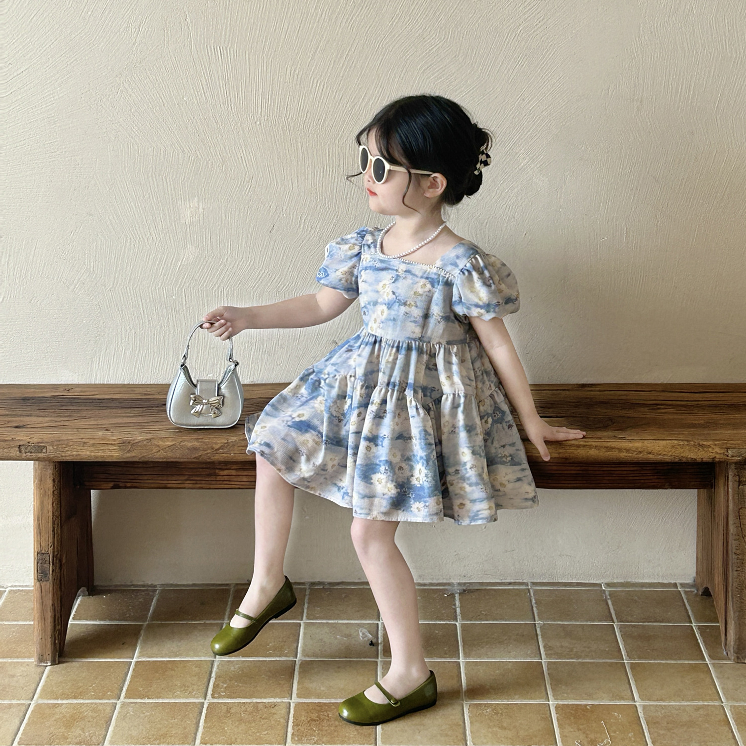 소녀 블루 플로랄 버블 슬리브 스퀘어 칼라 원피스 2025 여름 새로운 도착 소녀의 휴가 공주 먼지스토어 가기