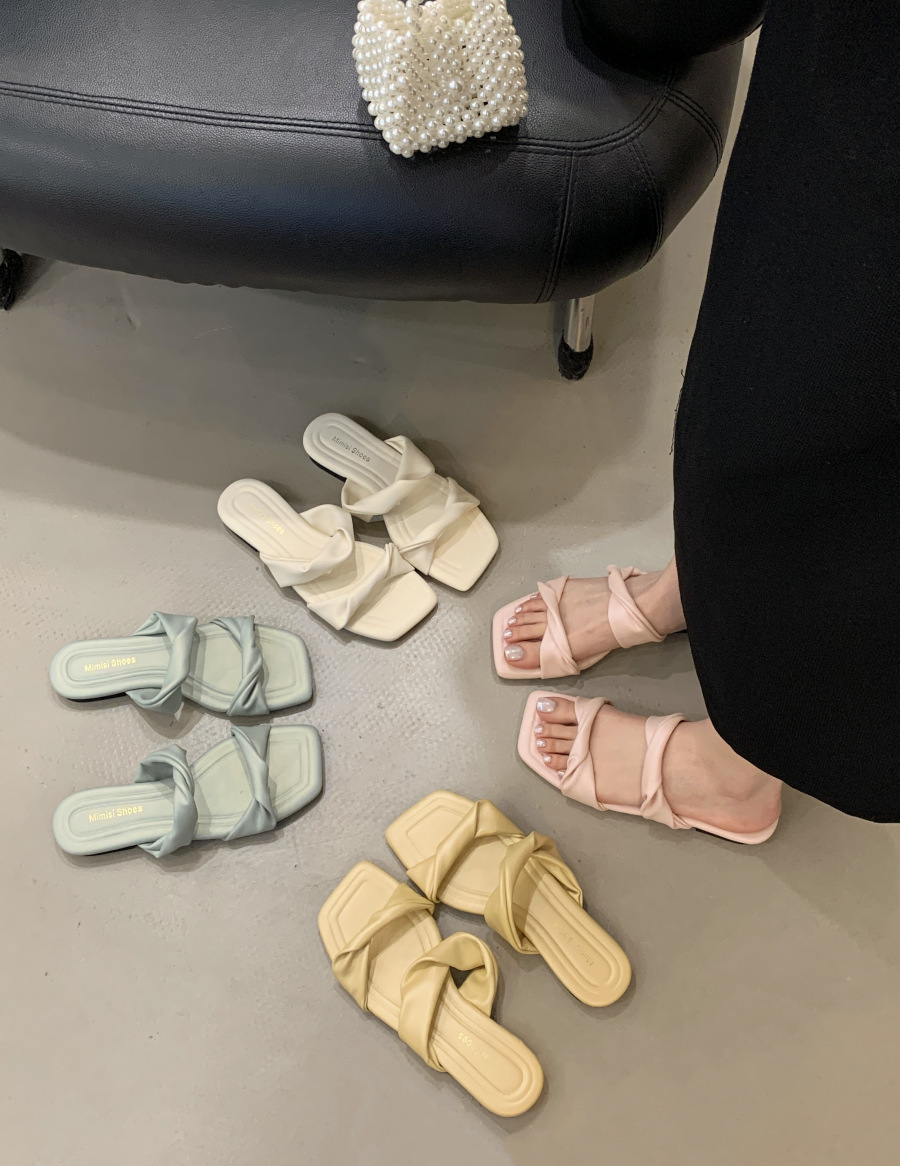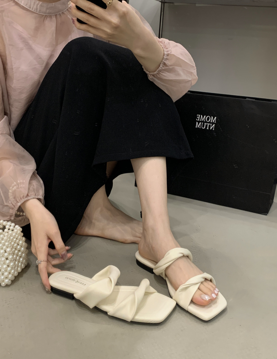 2025 년 여름 새 슬리퍼 여성 한국 스타일 그물 붉은 사각형 머리 평면 바닥 패션 주름 비치 샌들 도매스토어 가기