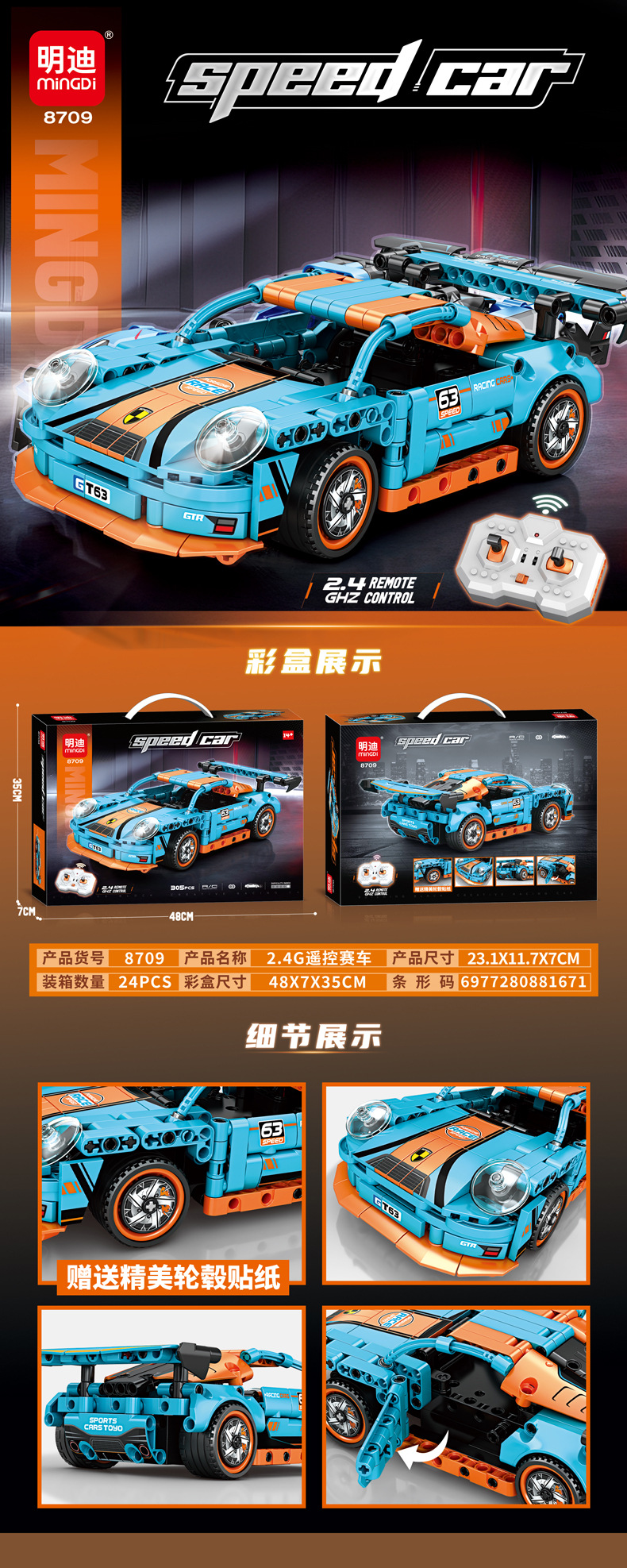1:24 Mindy 2.4G 기술 원격 제어 레이싱 카 호환 레고 작은 입자 조립 건물 블록 어린이 장난감스토어 가기