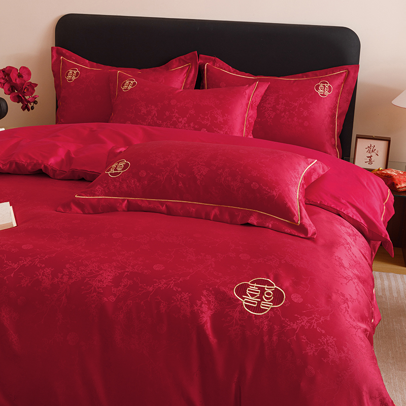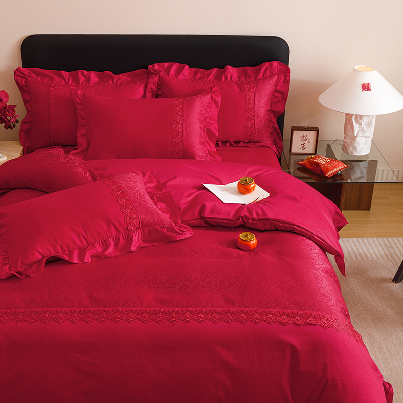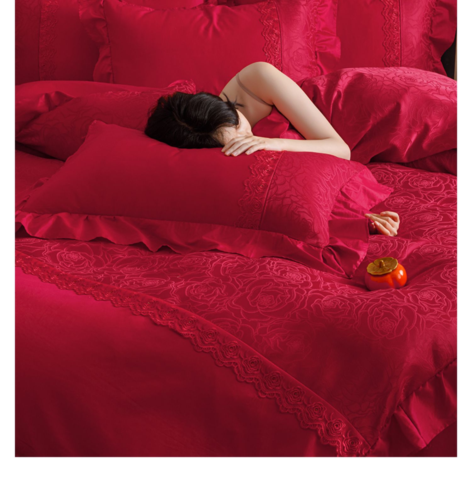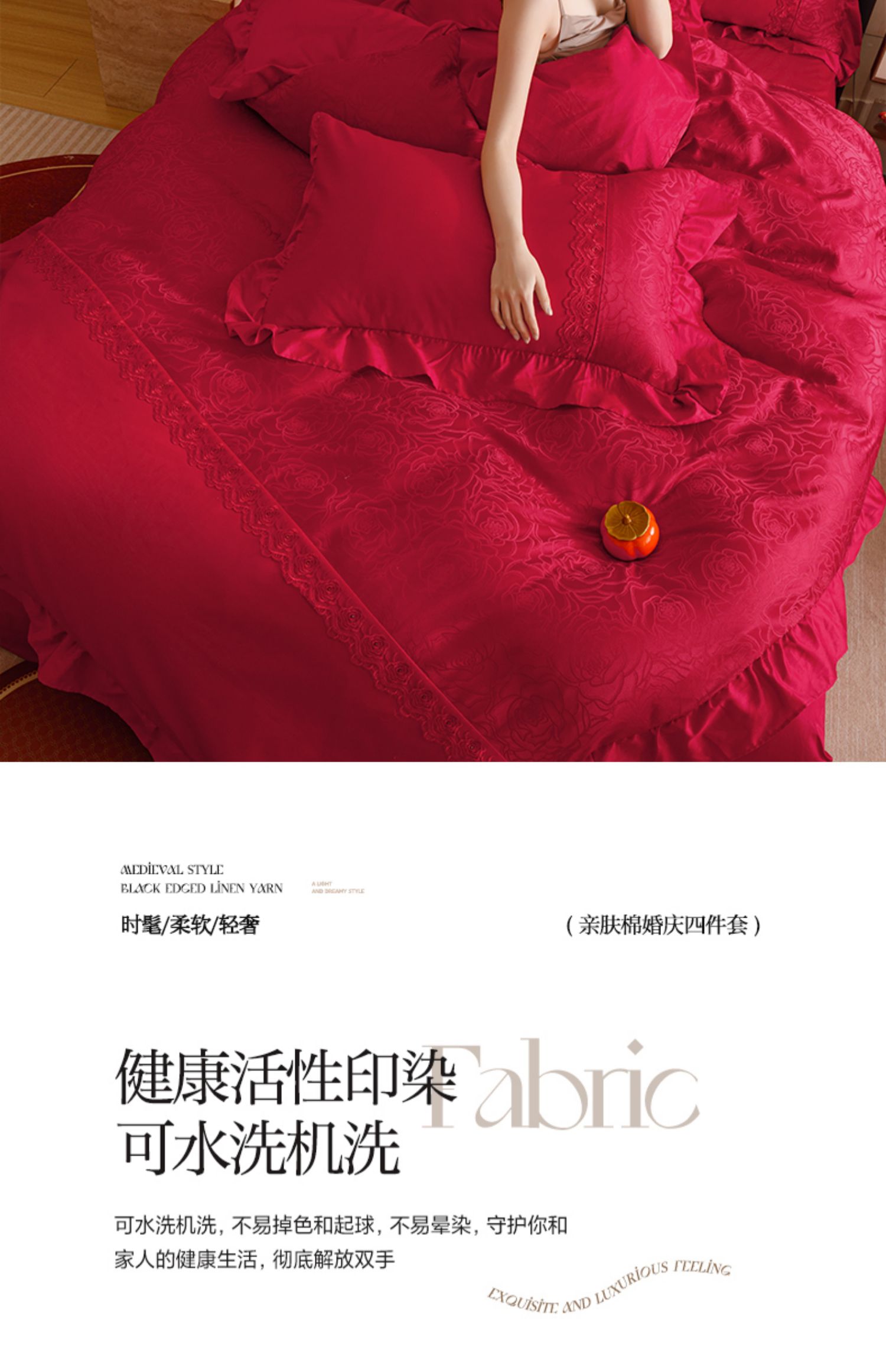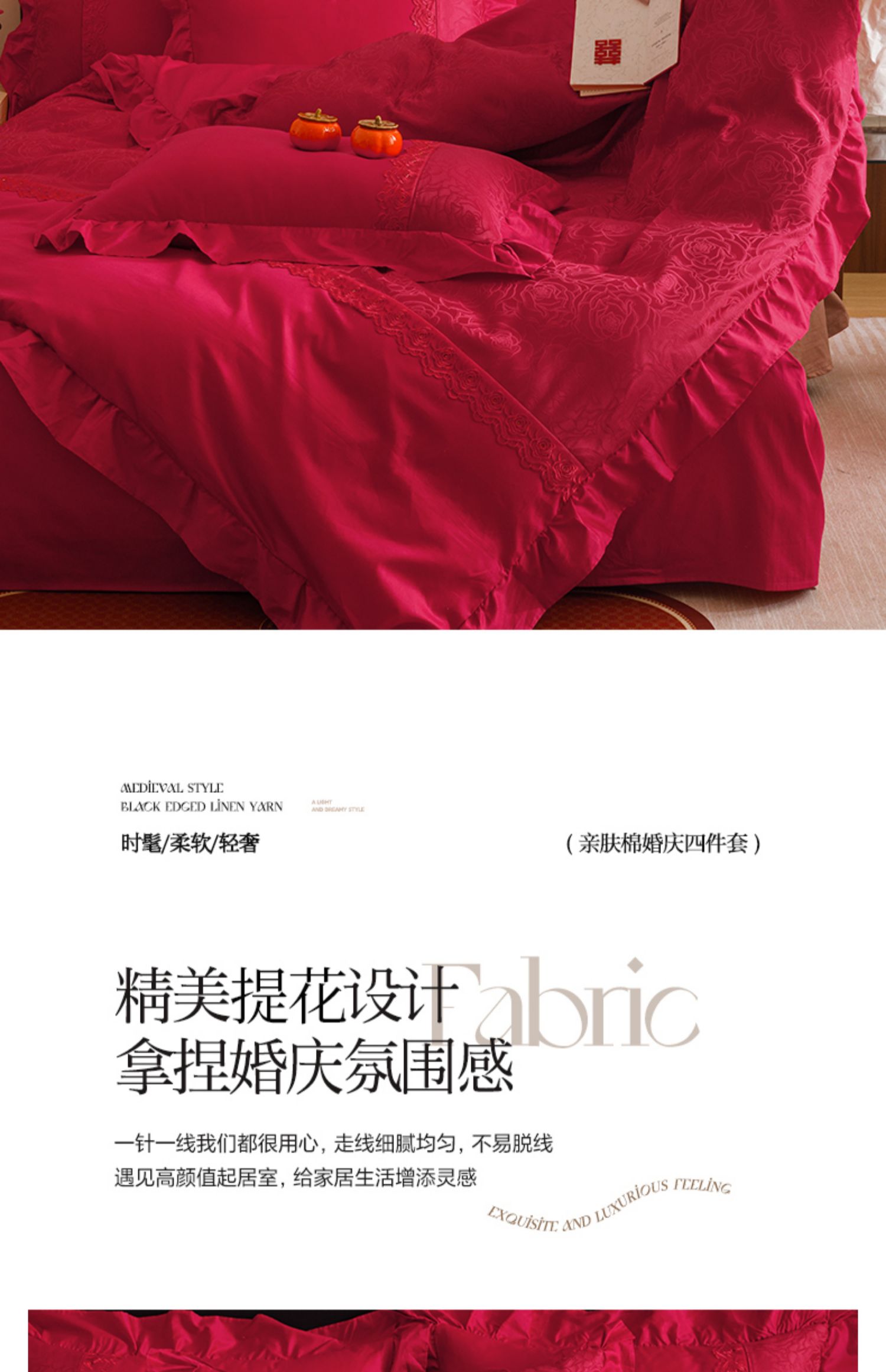 중국 웨딩 레드 침대 4 피스 세트 하이 엔드 웨딩 다우리 피부 친화적 인 퀼트 커버 침대 시트 매트리스 웨딩 침구스토어 가기