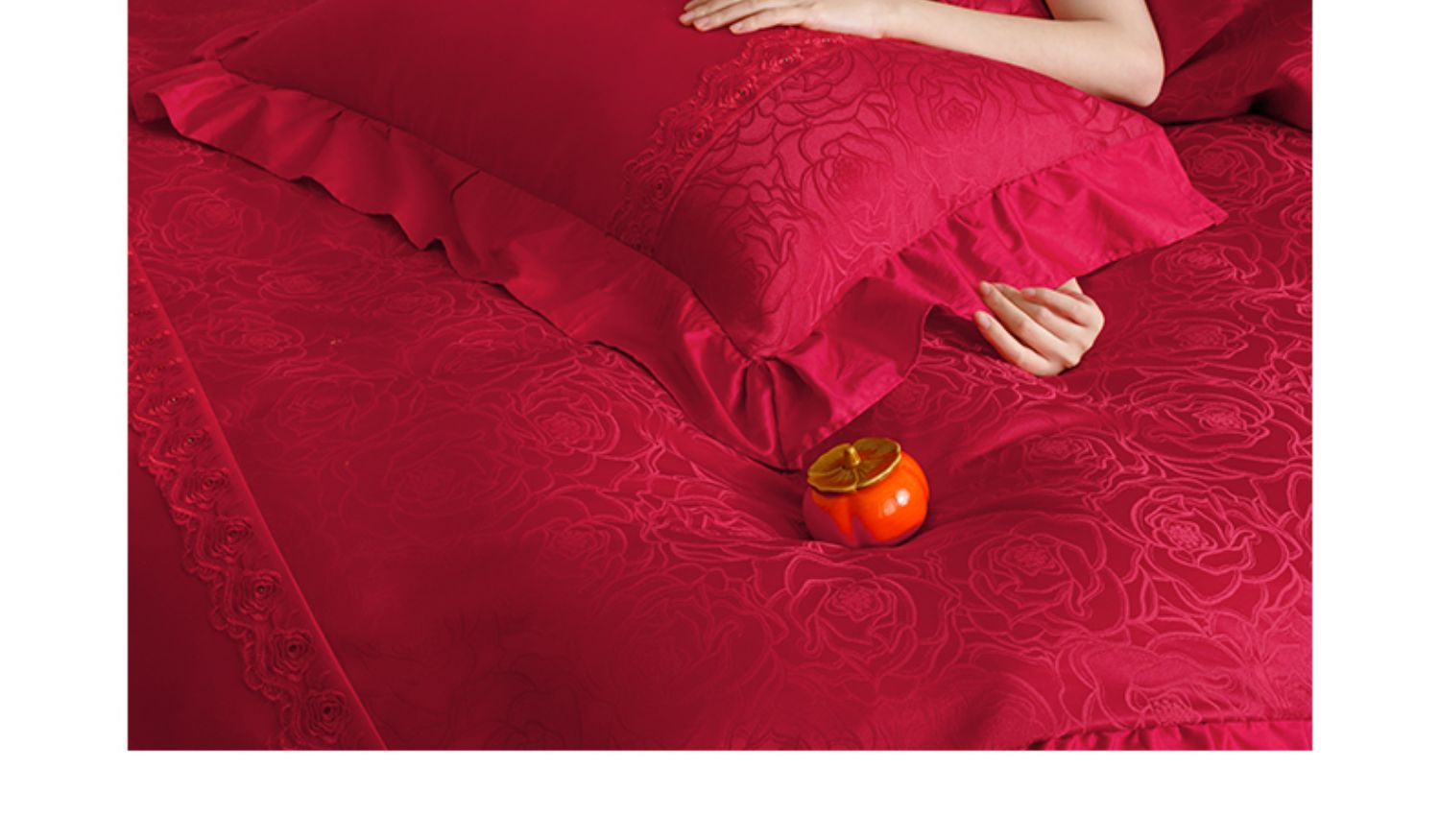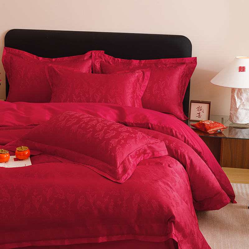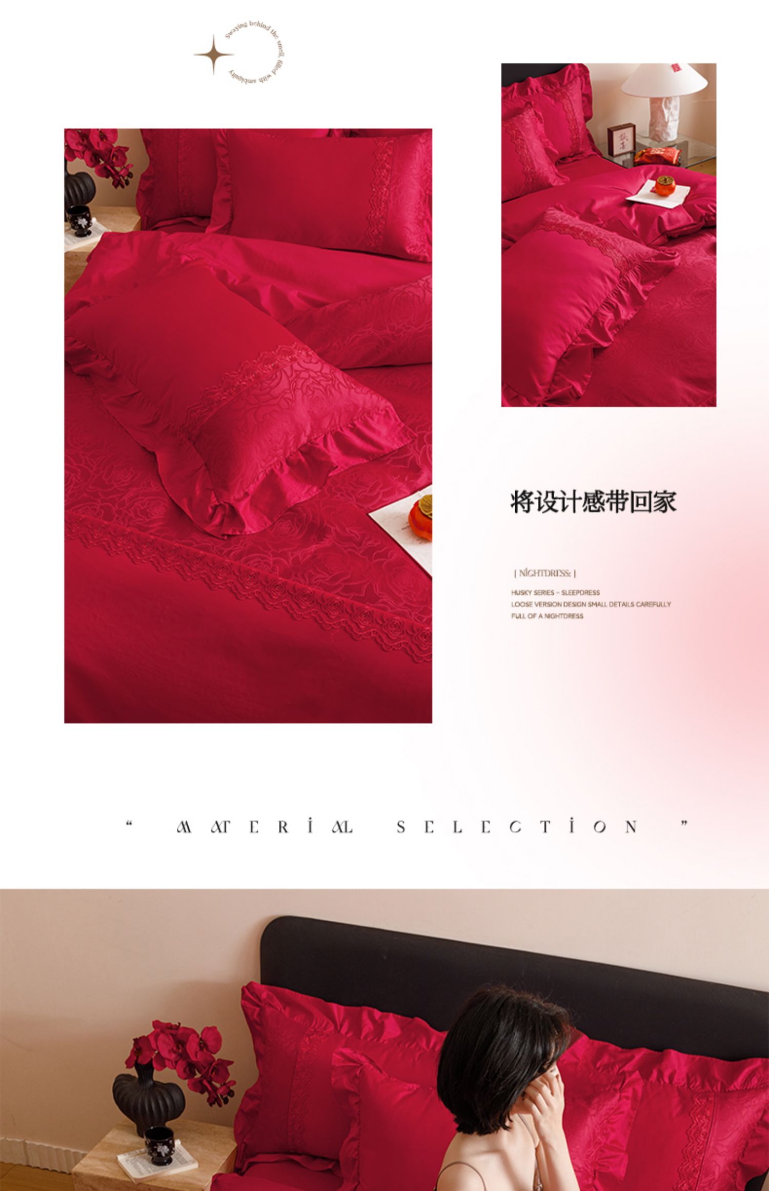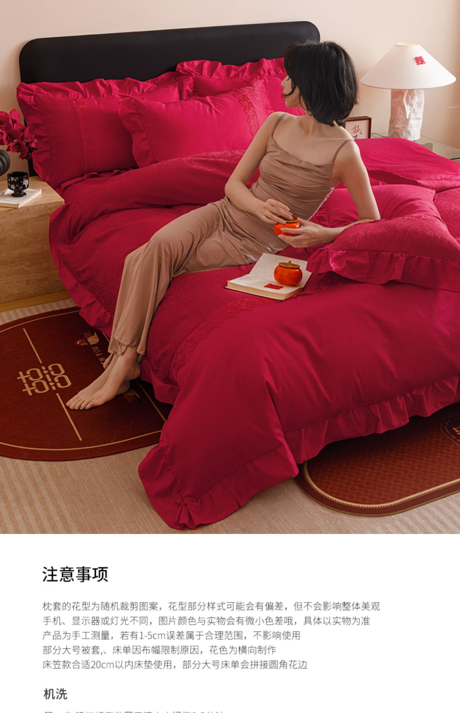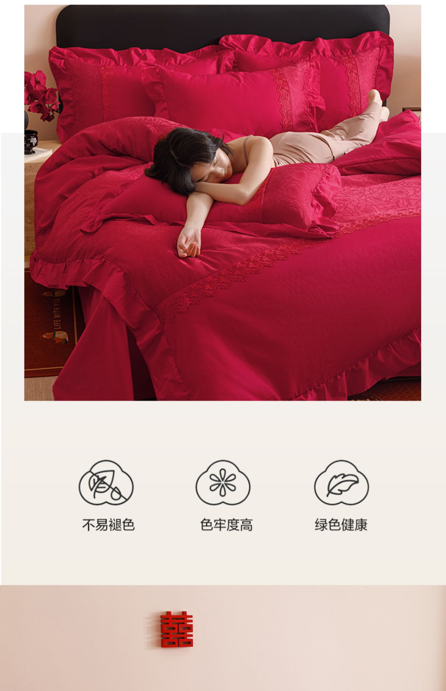 중국 웨딩 레드 침대 4 피스 세트 하이 엔드 웨딩 다우리 피부 친화적 인 퀼트 커버 침대 시트 매트리스 웨딩 침구스토어 가기