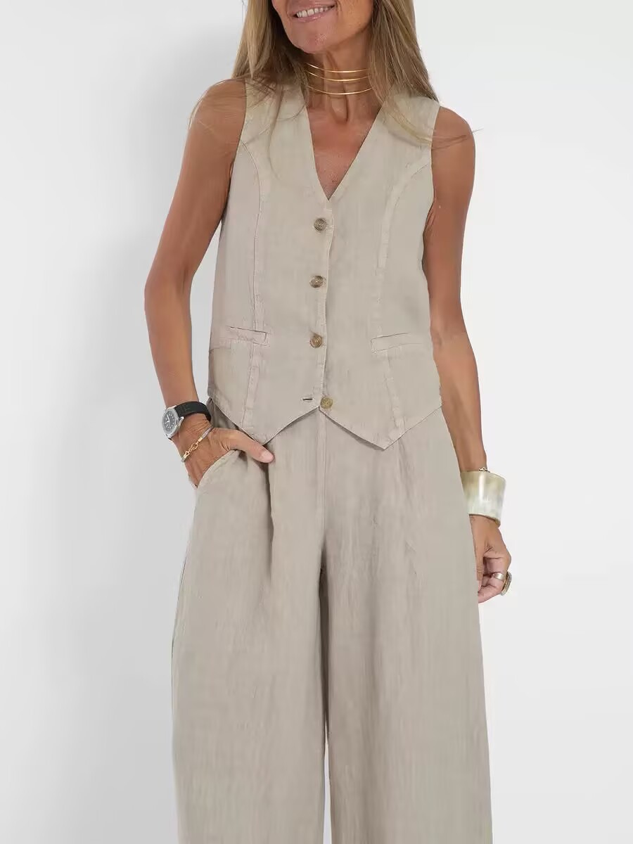 2025 유럽과 미국의 국경 간 AliExpress 베스트 셀러 뉴 패션 조끼 바지 콜라주 스티칭 코튼 및 리넨 캐주얼 세트 여성