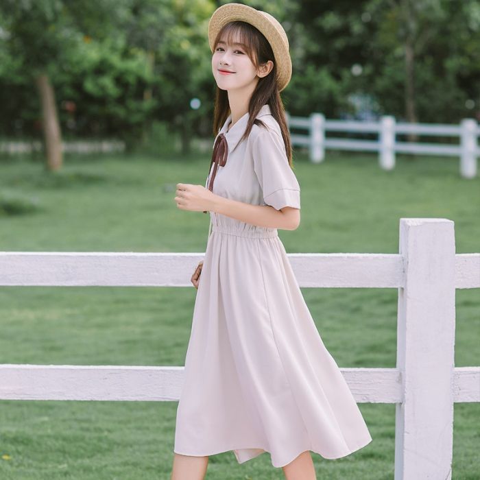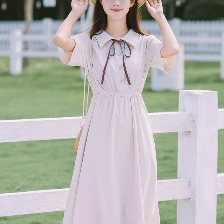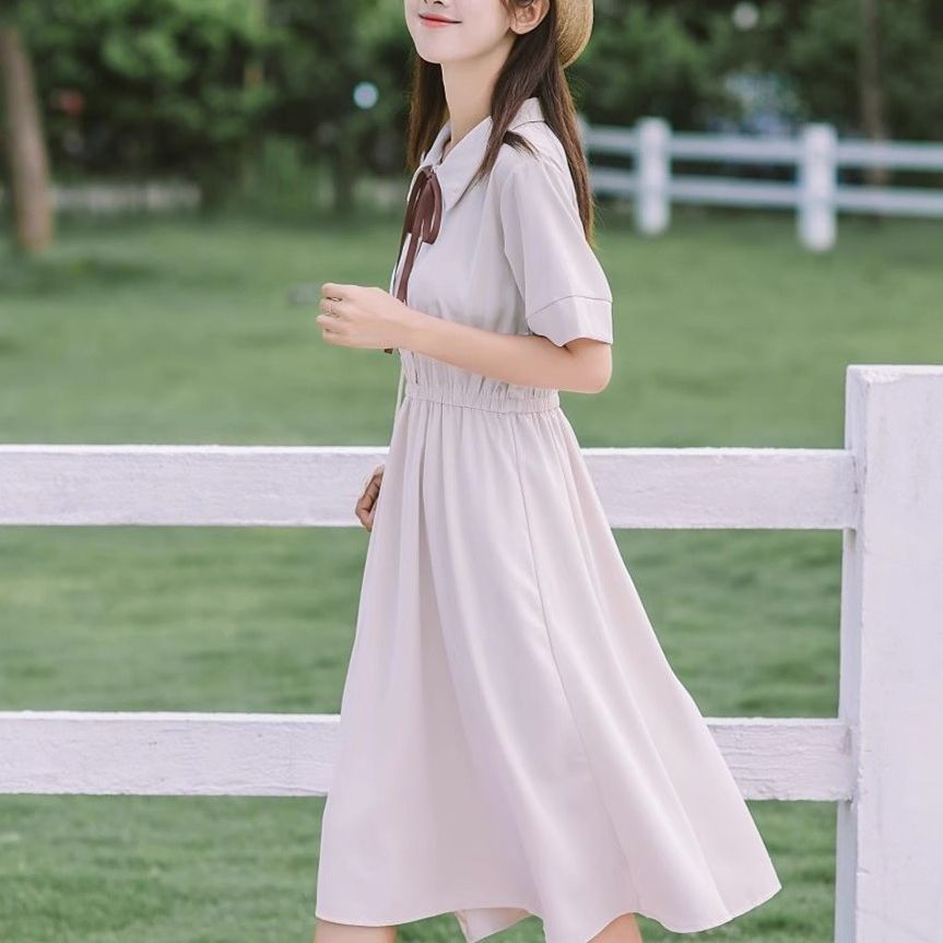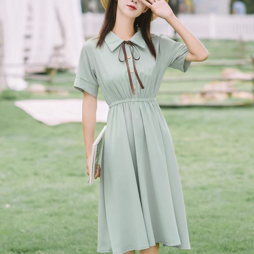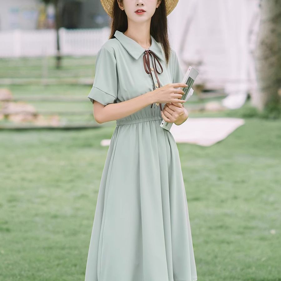 작고 신선한 폴로 라펠 쉬폰 드레스 여름 허리 슬리밍 스위트 대학 스타일 학생 소녀 드레스 작은 사람들을위한스토어 가기