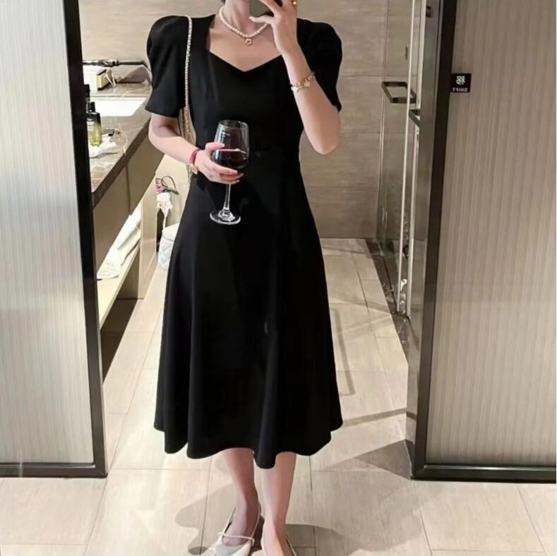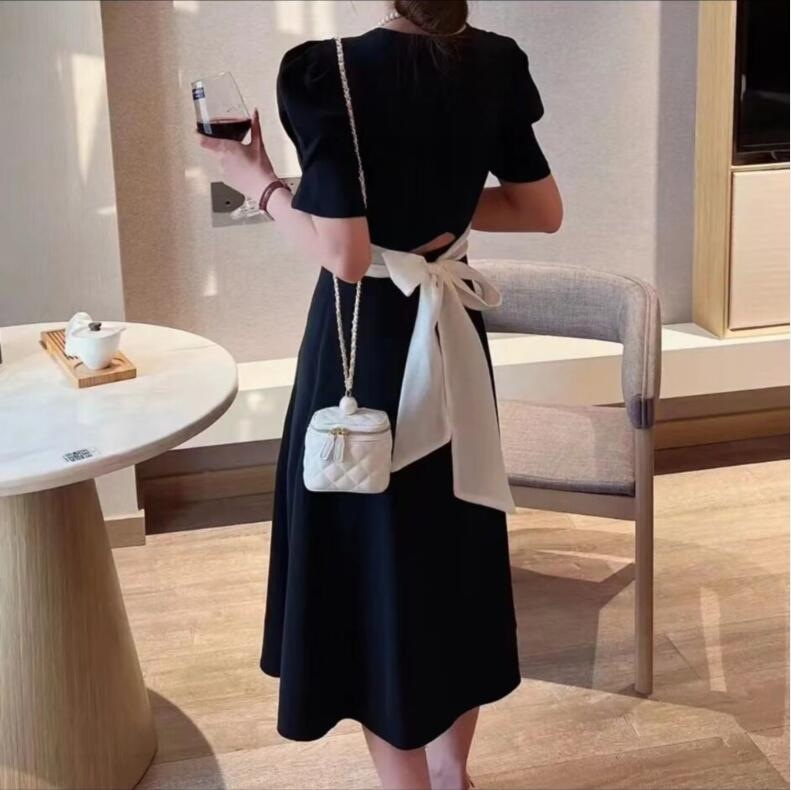 프렌치 레트로 헵번 스타일 블랙 우아한 반팔 원피스 여름 새로운 등 활 슬리밍 긴 스커트스토어 가기
