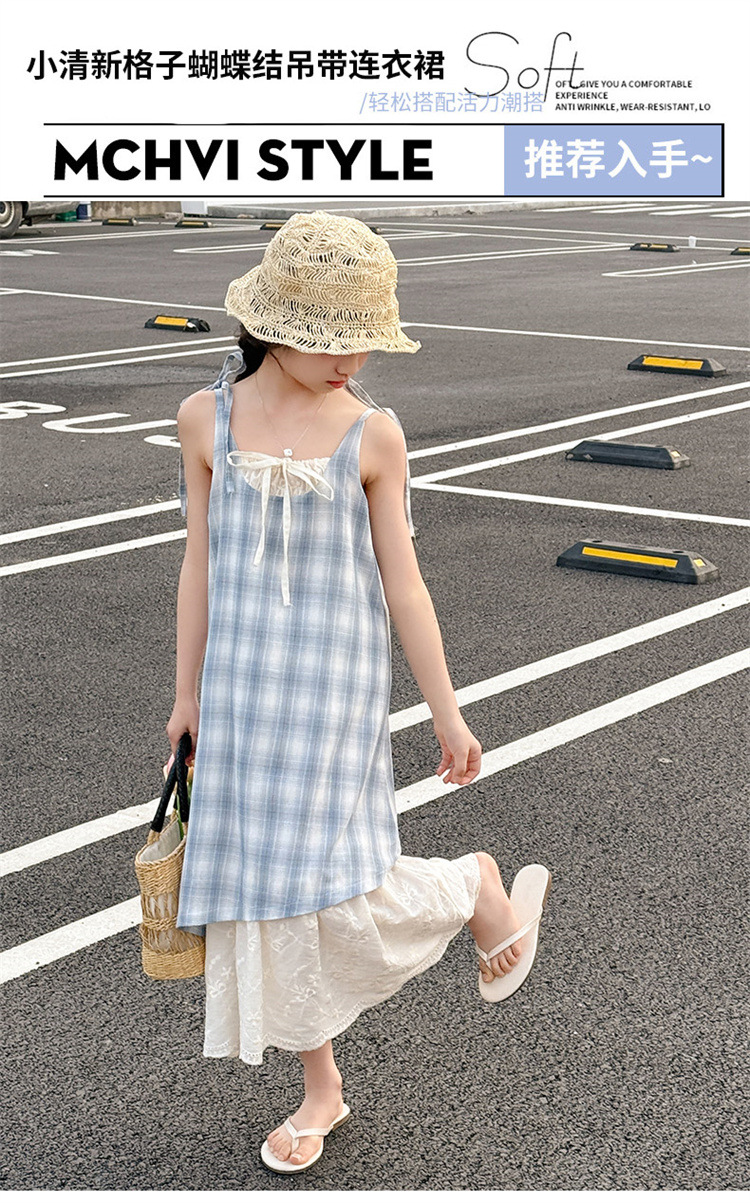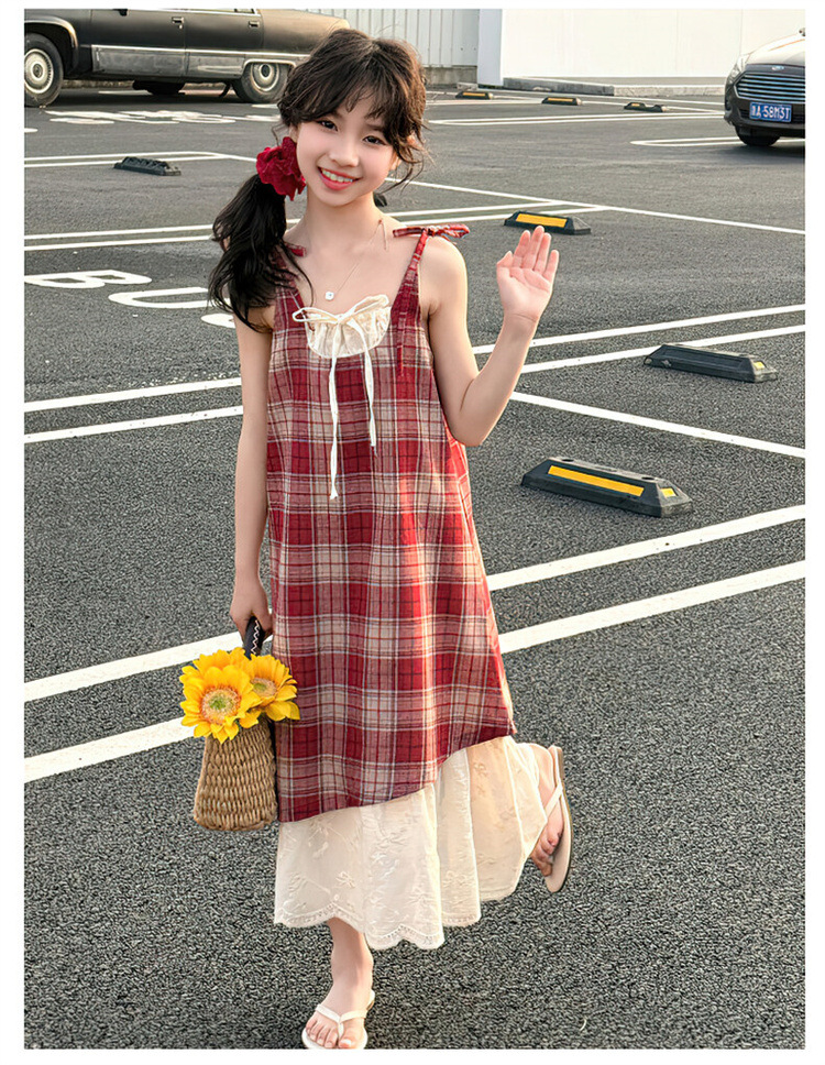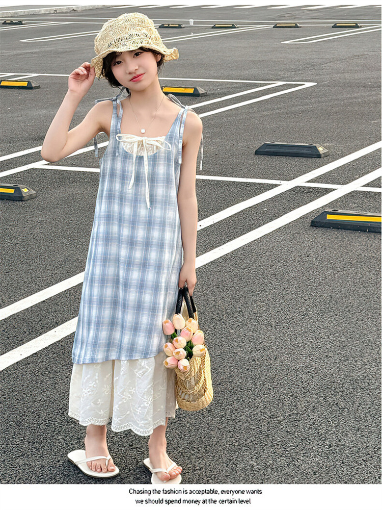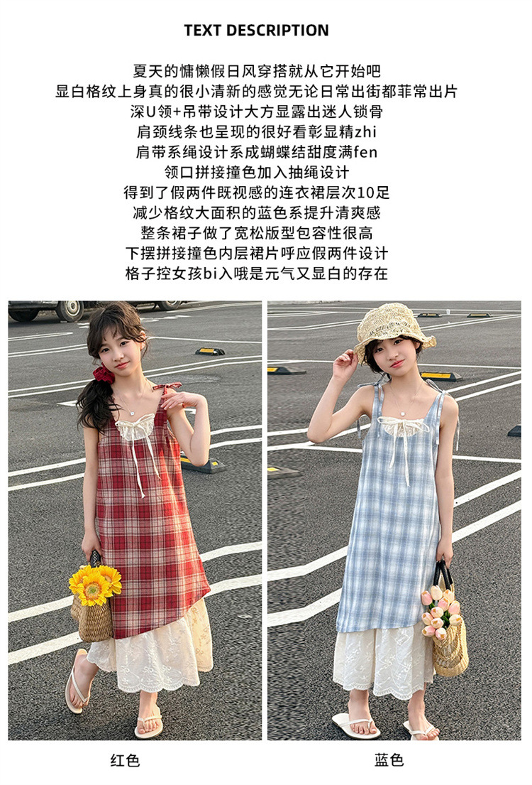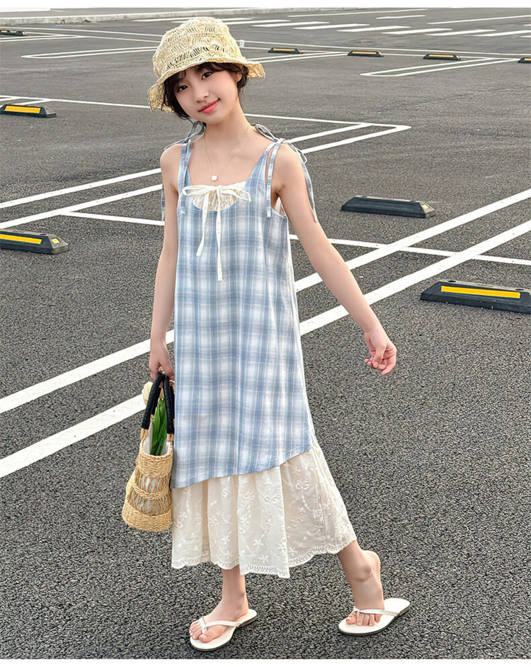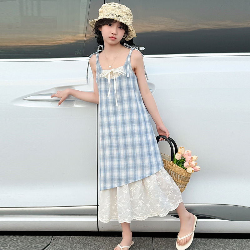 소녀 슬링 원피스 격자 무늬 어린이 여름 레이스 가짜 투피스 스커트 2025 새로운 스타일 중 큰 어린이 패션스토어 가기