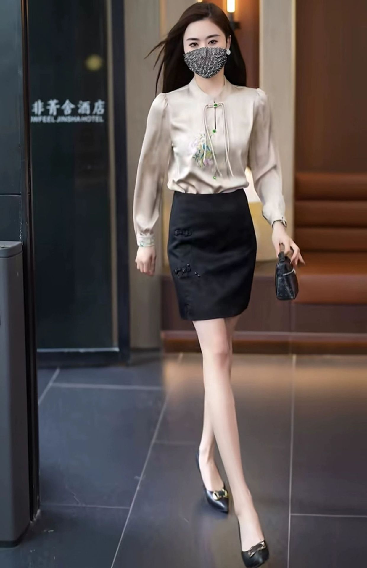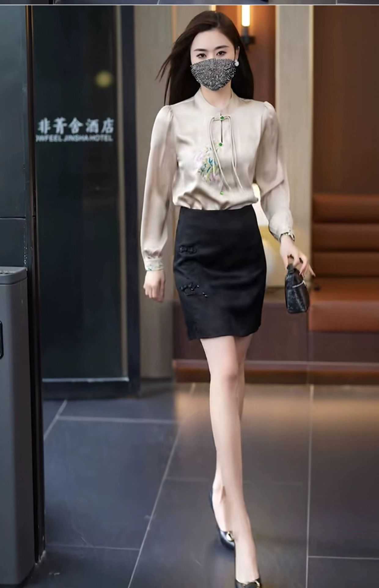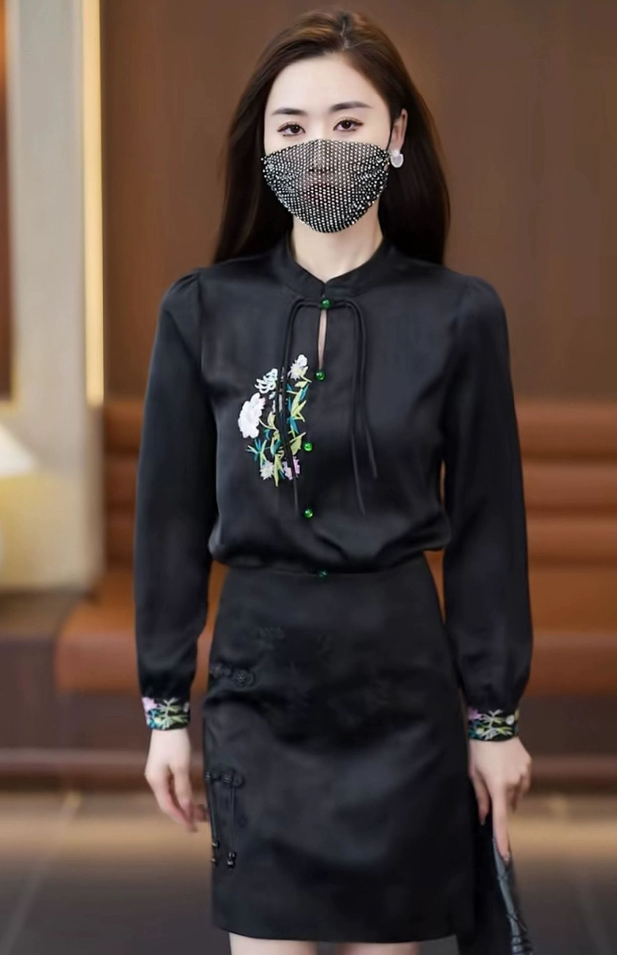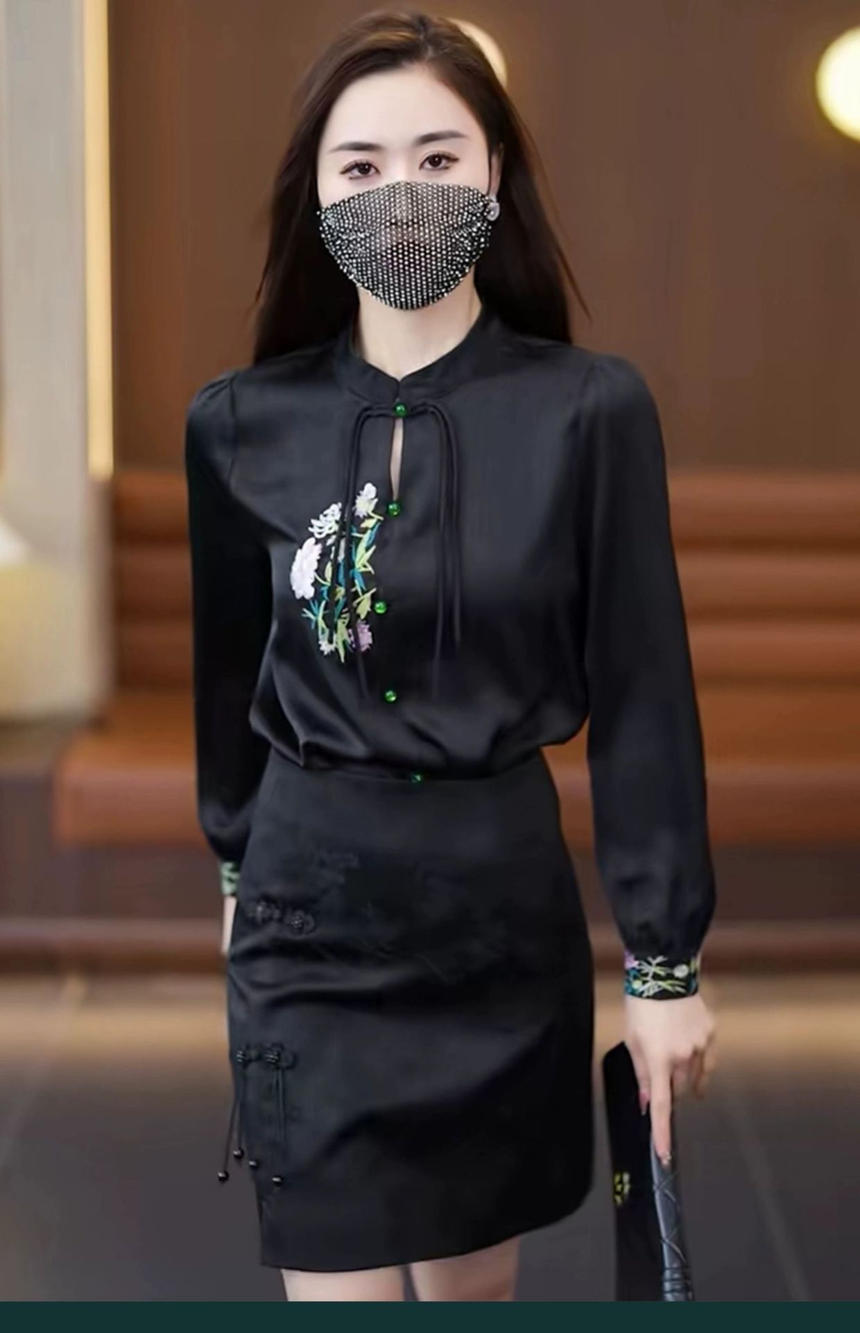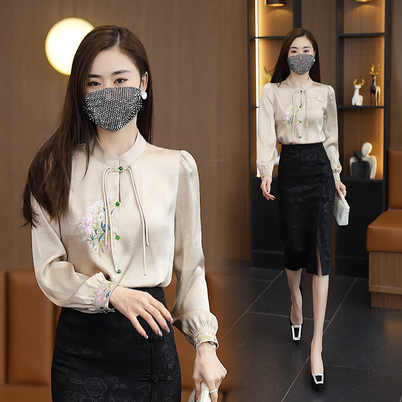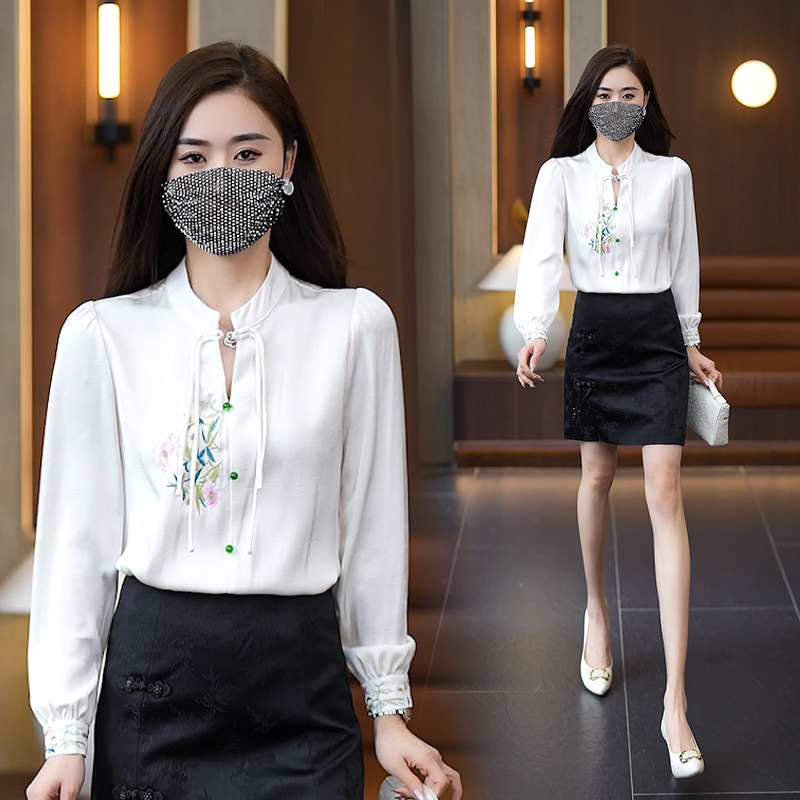 여성을위한 복고풍 새로운 중국 스타일 국가 스타일 수 놓은 느슨한 긴팔 셔츠 봄 2025 자카드 새틴 디자인 캐주얼 탑