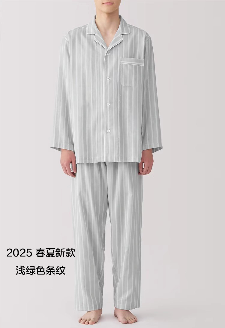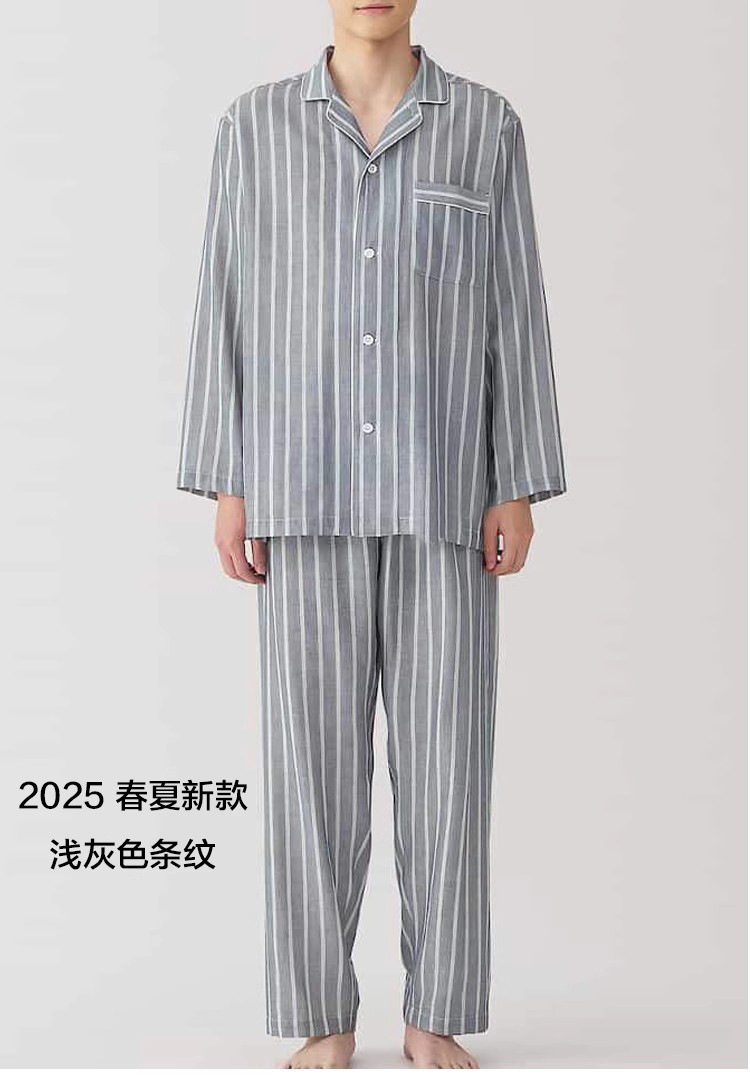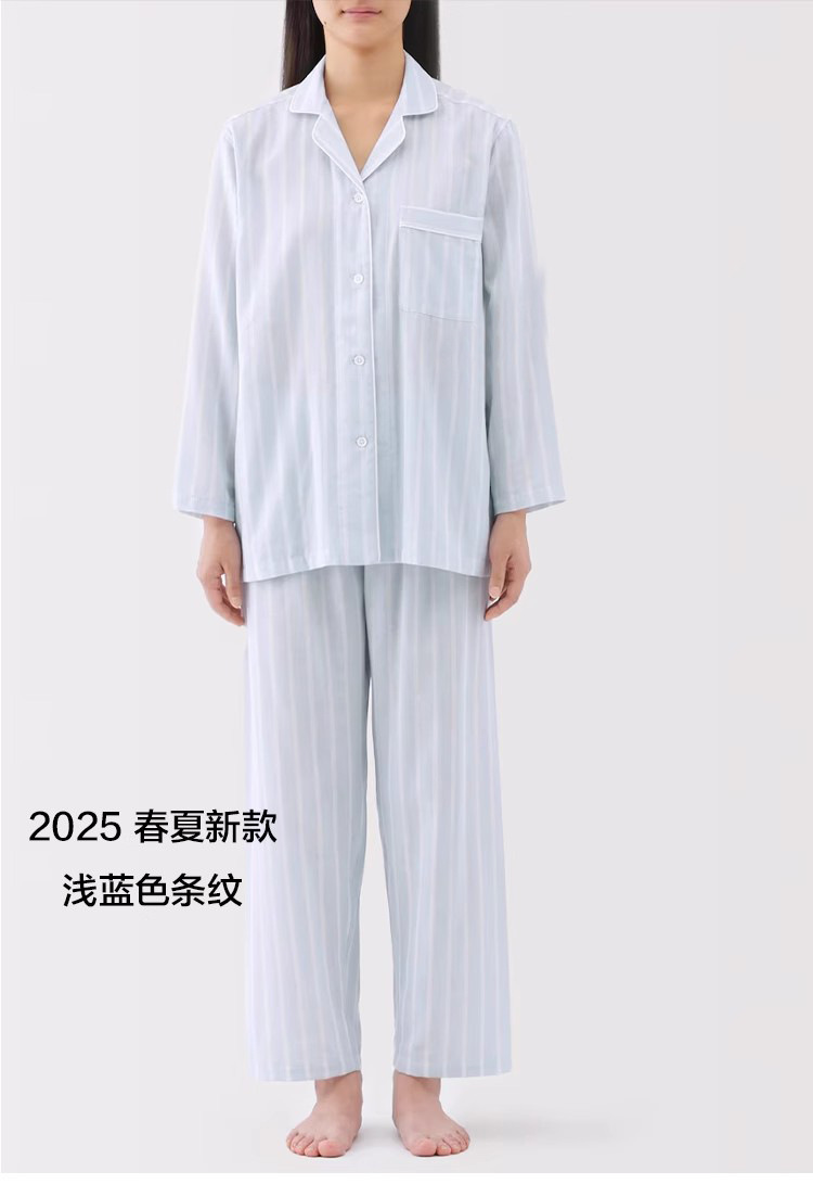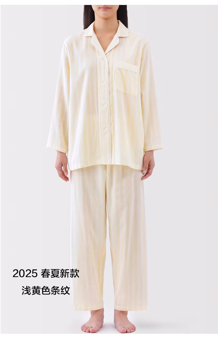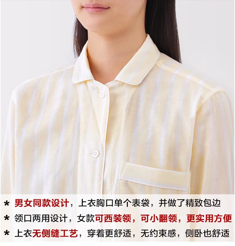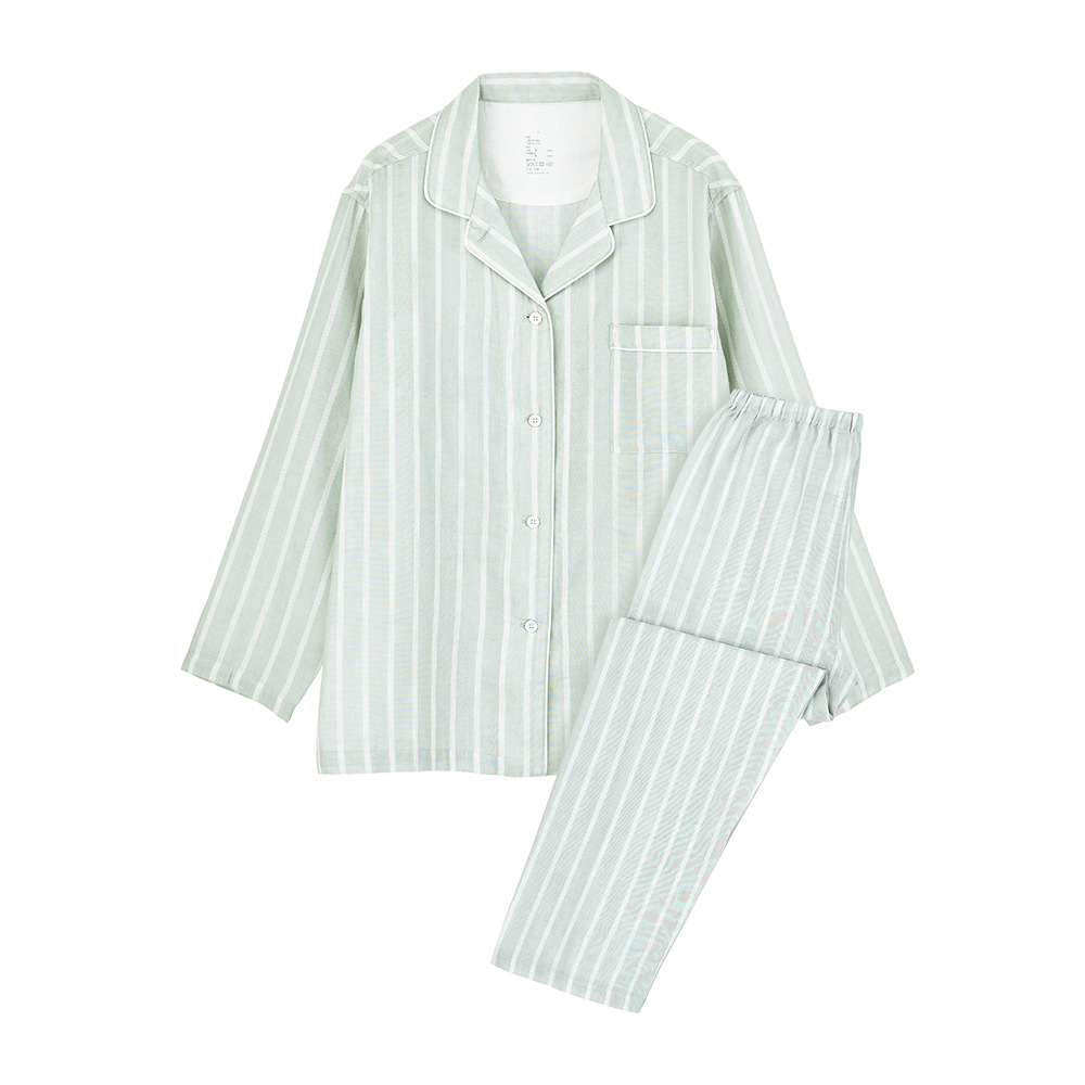 일본 무인쇄 순면 더블 레이어 거즈 잠옷 여성용 스트라이프 사이드 심리스 홈웨어 세트 남성용 긴팔 얇은 봄 여름스토어 가기