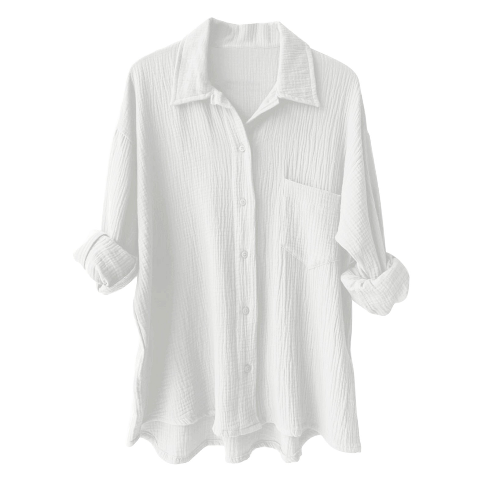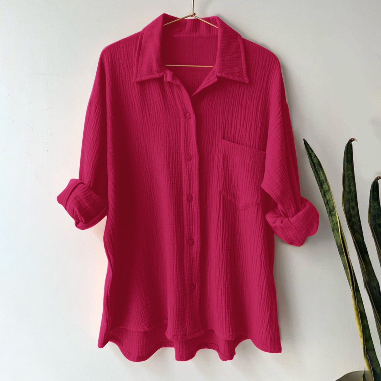 Amazon Shupaitong 유럽과 미국의 단색 여성 주름 천 느슨한 옷깃 긴팔 셔츠 패션 캐주얼 탑스토어 가기