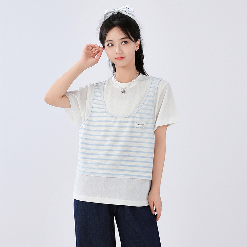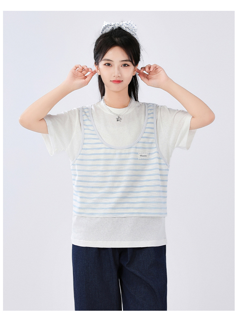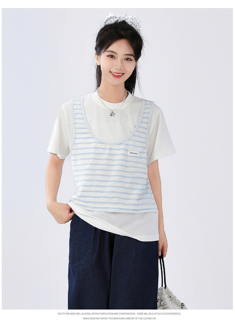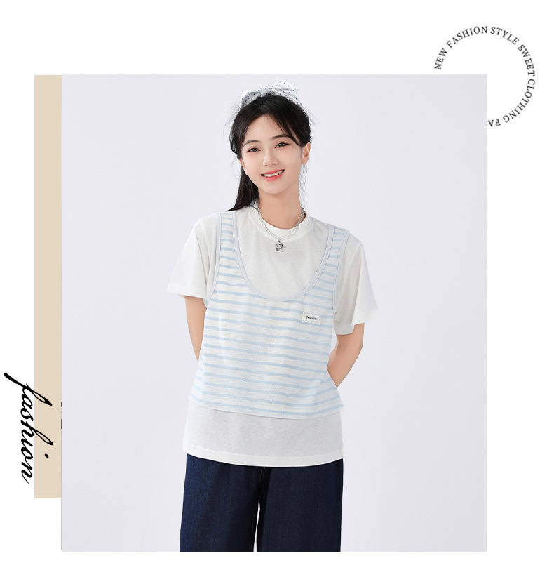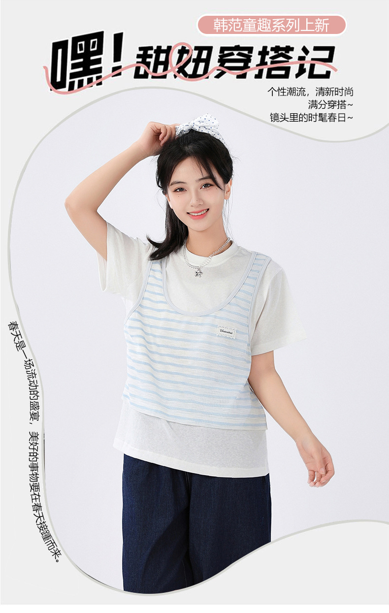 중학교 여중생 가짜 투피스 반팔 티셔츠 여름 새 스타일 큰 어린이 플러스 사이즈 느슨한 청소년과 학생 화이트스토어 가기