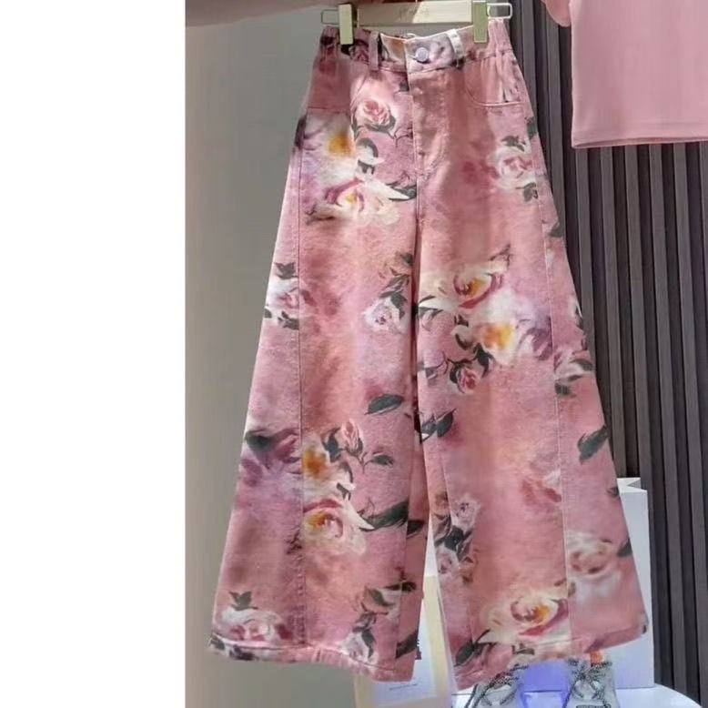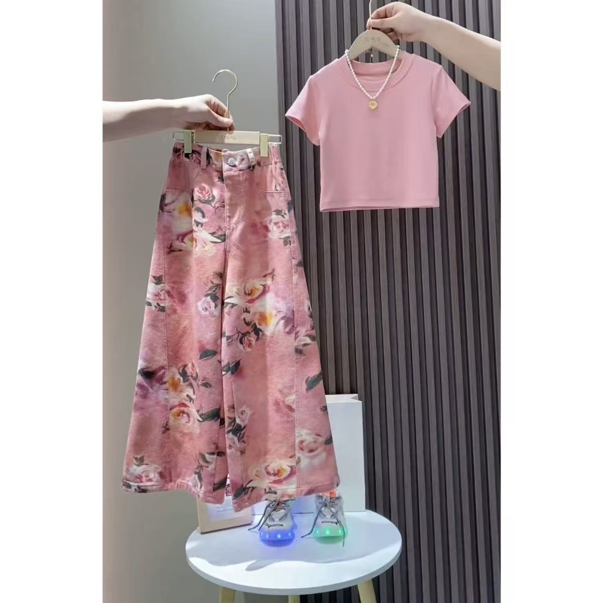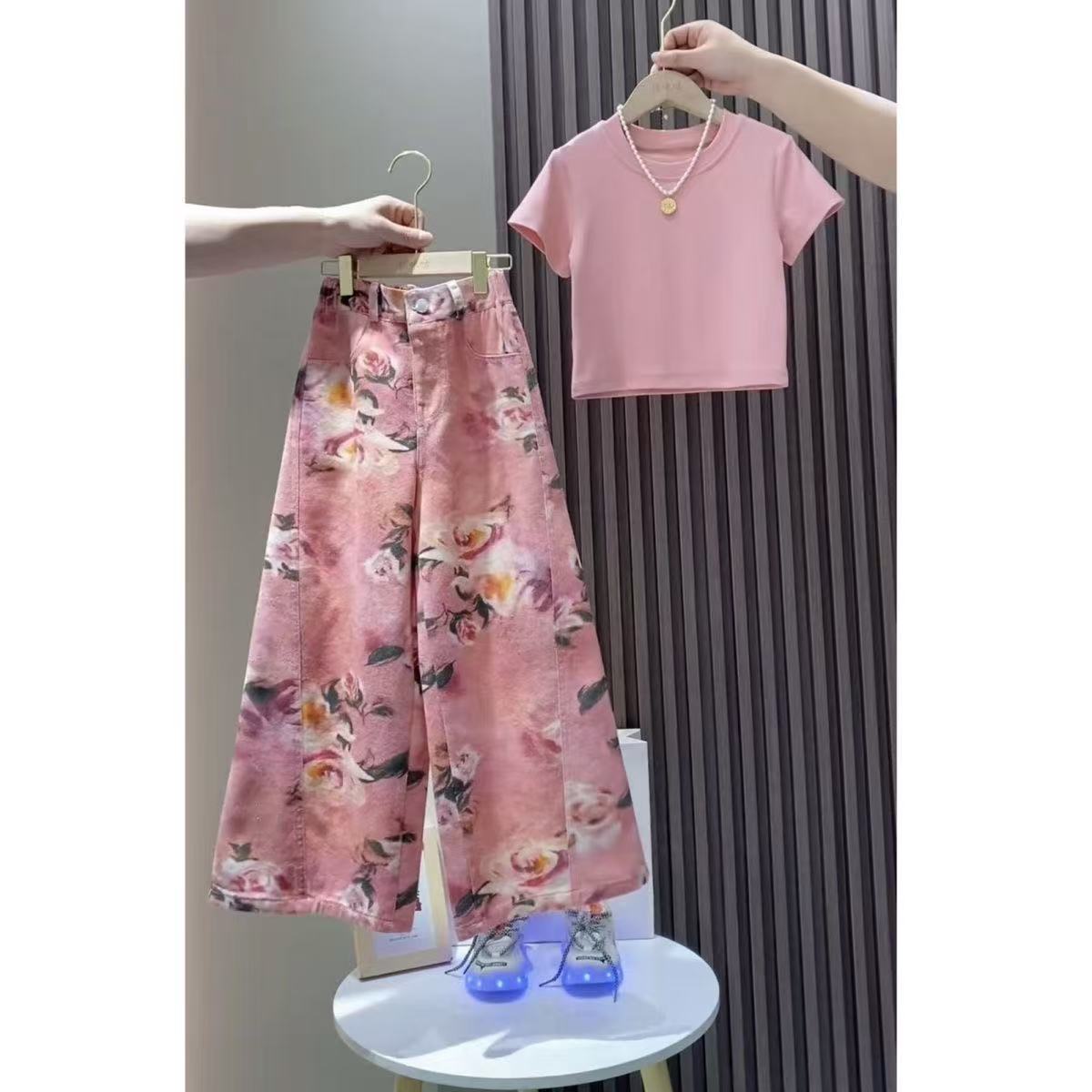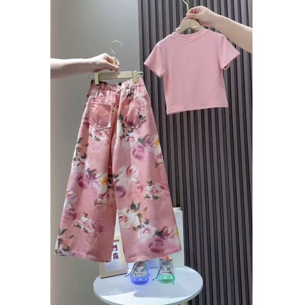 여자 여름 세트 2025 새로운 유행 여자 유행 반팔 티셔츠 데님 넓은 다리 바지 투피스 세트